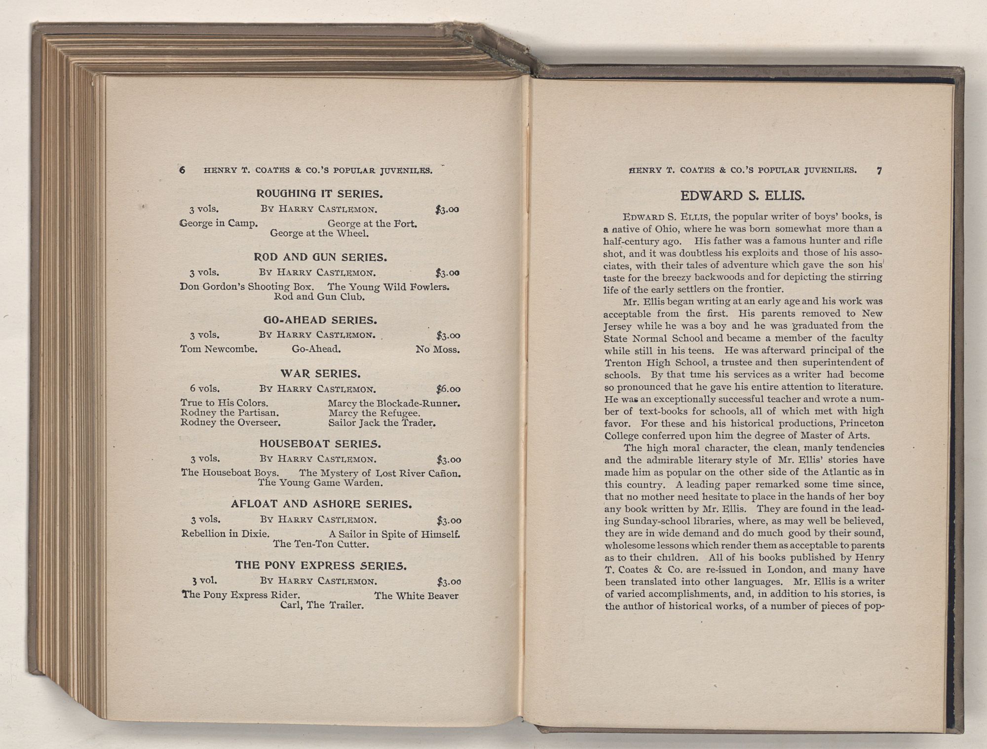 The high moral character, the clean, manly tendencies and the admirable literary style of Mr. Ellis’ stories have made him as popular on the other side of the Atlantic as in this country. A leading paper remarked some time since, that no mother need hesitate to place in the hands of her boy any book written by Mr. Ellis. They are found in the leading Sunday-school libraries, where, as may well be believed, they are in wide demand and do much good by their sound, wholesome lessons which render them as acceptable to parents as to their children. All of his books published by Henry T. Coates & Co. are re-issued in London, and many have been translated into other languages. Mr. Ellis is a writer of varied accomplishments, and, in addition to his stories, is the author of historical works, of a number of pieces of popular