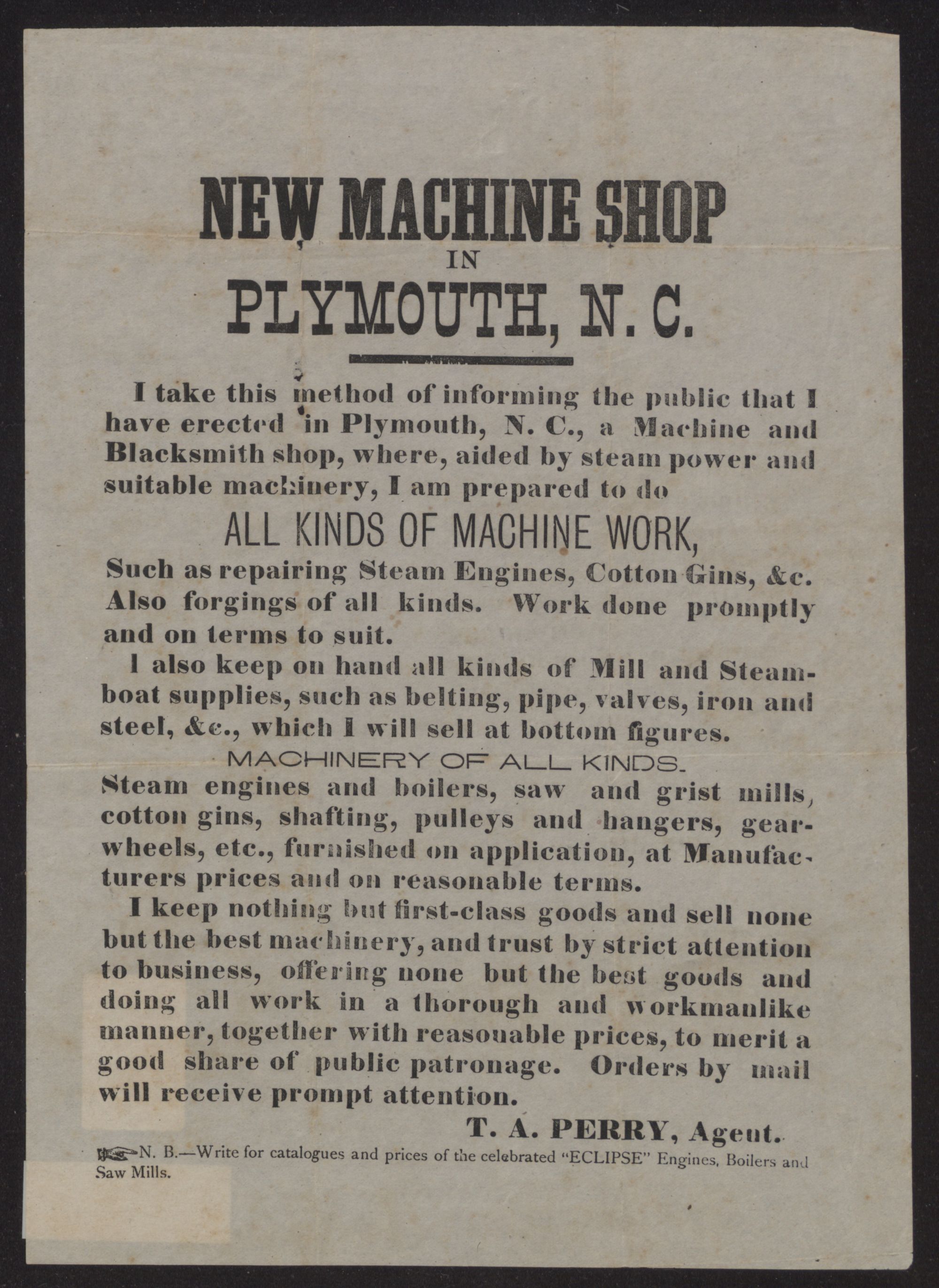I take this method of informing the public that I have erected in Plymouth, N. C., a Machine and Blacksmith shop, where, aided by steam power and suitable machinery, I am prepared to do