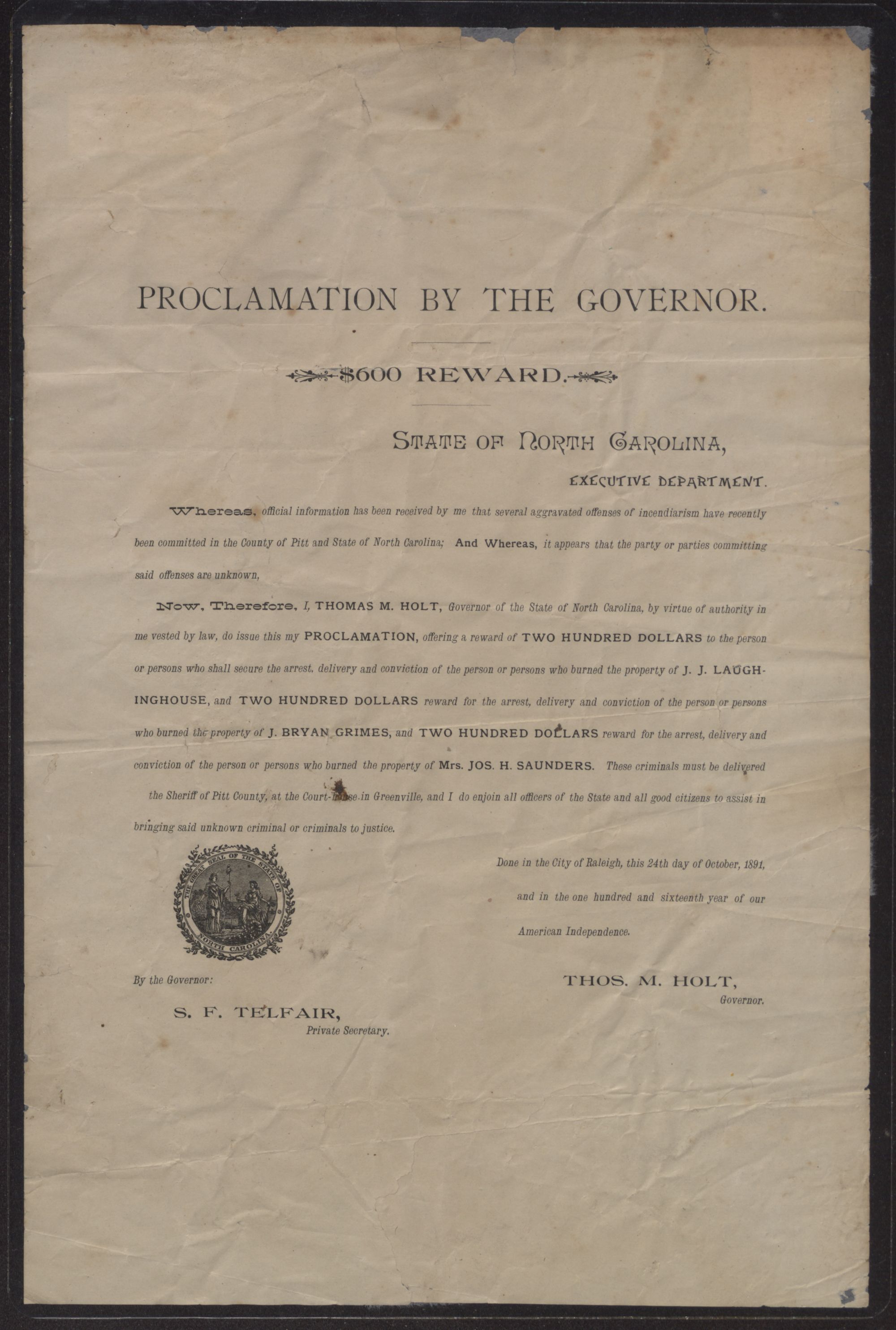 Now, Therefore, I, THOMAS M. HOLT, Governor of the State of North Carolina, by virtue of authority in me vested by law, do issue this my PROCLAMATION, offering a reward of TWO HUNDRED DOLLARS to the person or persons who shall secure the arrest, delivery and conviction of the person or persons who burned the property of J. J. LAUGHINGHOUSE, and TWO HUNDRED DOLLARS reward for the arrest, delivery and conviction of the person or persons who burned the property of J. BRYAN GRIMES, and TWO HUNDRED DOLLARS reward for the arrest, delivery and conviction of the person or persons who burned the property of Mrs. JOS. H. SAUNDERS. These criminals must be delivered the Sheriff of Pitt County, at the Court-house in Greenville, and I do enjoin all officers of the State and all good citizens to assist in bringing said unknown criminal or criminals to justice.
