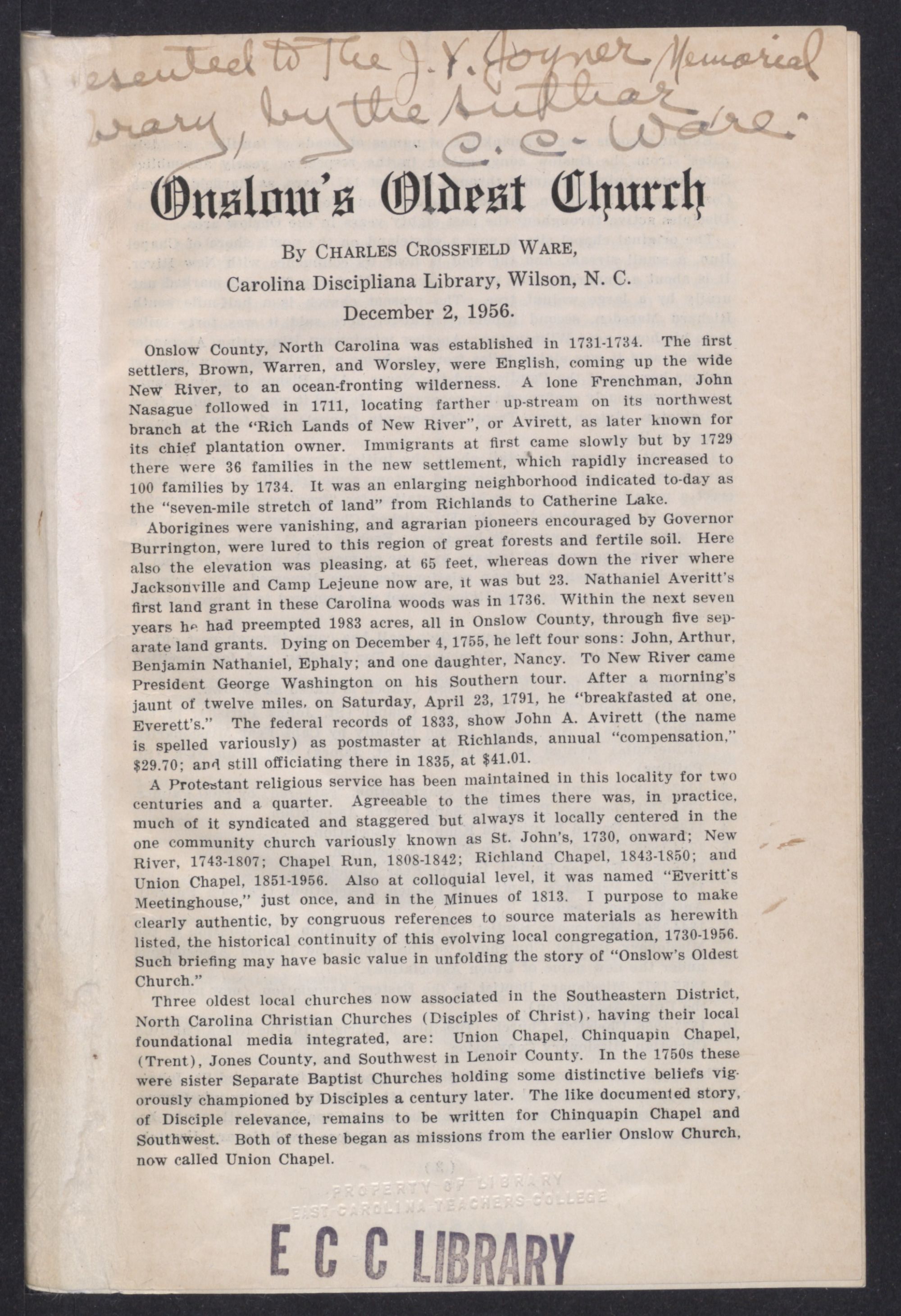 A Protestant religious service has been maintained in this locality for two centuries and a quarter. Agreeable to the times there was, in practice, much of it syndicated and staggered but always it locally centered in the one community church variously known as St. John's, 1730, onward; New River, 1743-1807; Chapel Run, 1808-1842; Richland Chapel, 1843-1850; and Union Chapel, 1851-1956. Also at colloquial level, it was named “Everitt's Meetinghouse,” just once, and in the Minues of 1813. I purpose to make clearly authentic, by congruous references to source materials as herewith listed, the historical continuity of this evolving local congregation, 1730-1956. Such briefing may have basic value in unfolding the story of “Onslow's Oldest Church.”