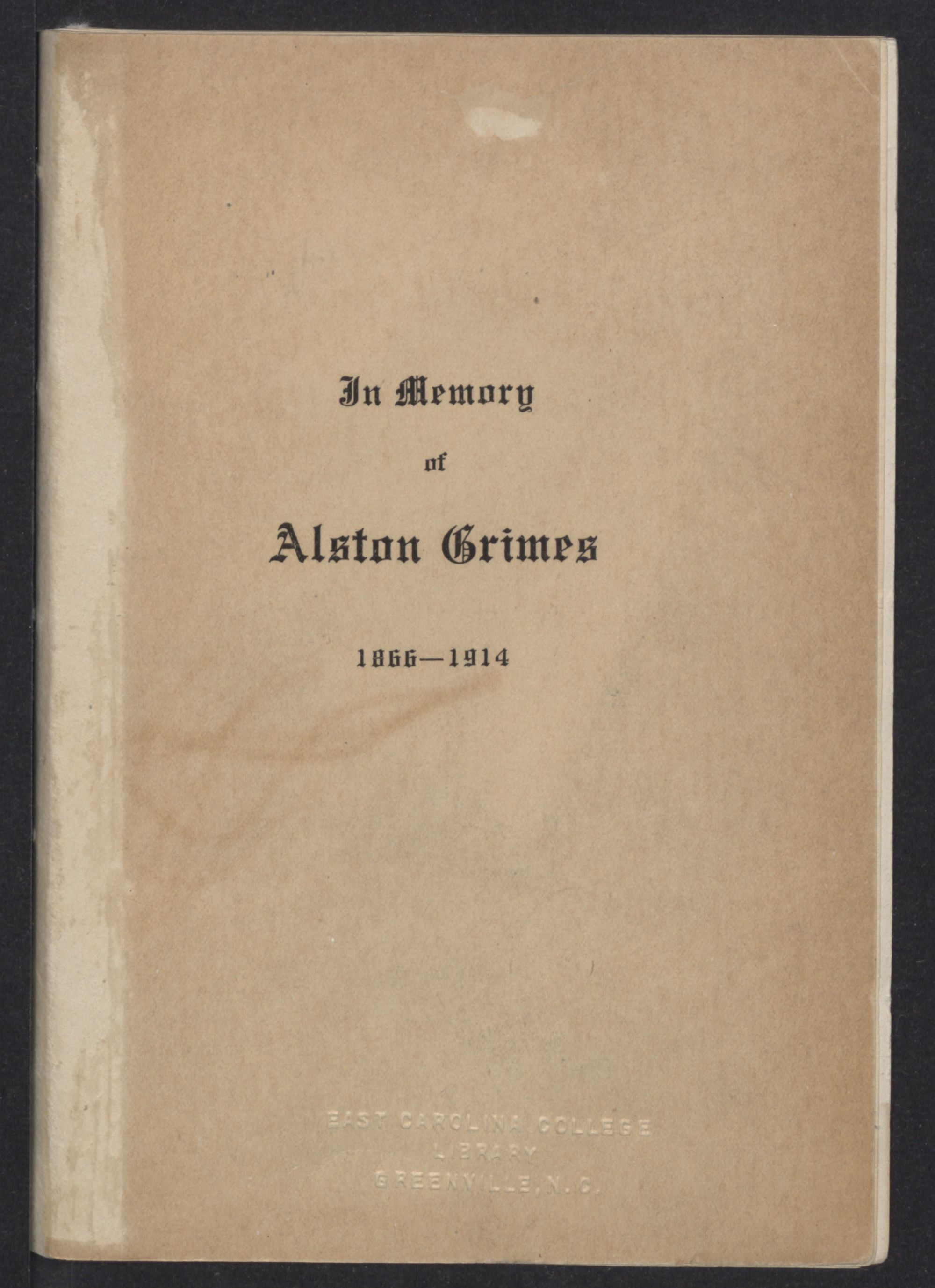 The tribute that I would bring to the memory of Alston Grimes, my pen has not power to deliver. Through one who had known and loved him in the close relationship of college-mate and room-mate in the “Old East” at Chapel Hill, I knew him long before we ever met. When we did meet and I had looked into those clear, unflinching eyes where the steady fire of kindness always shone, I recognized the “Dear, big-hearted, loving and lovable old Alston” that his friend was wont to call him.