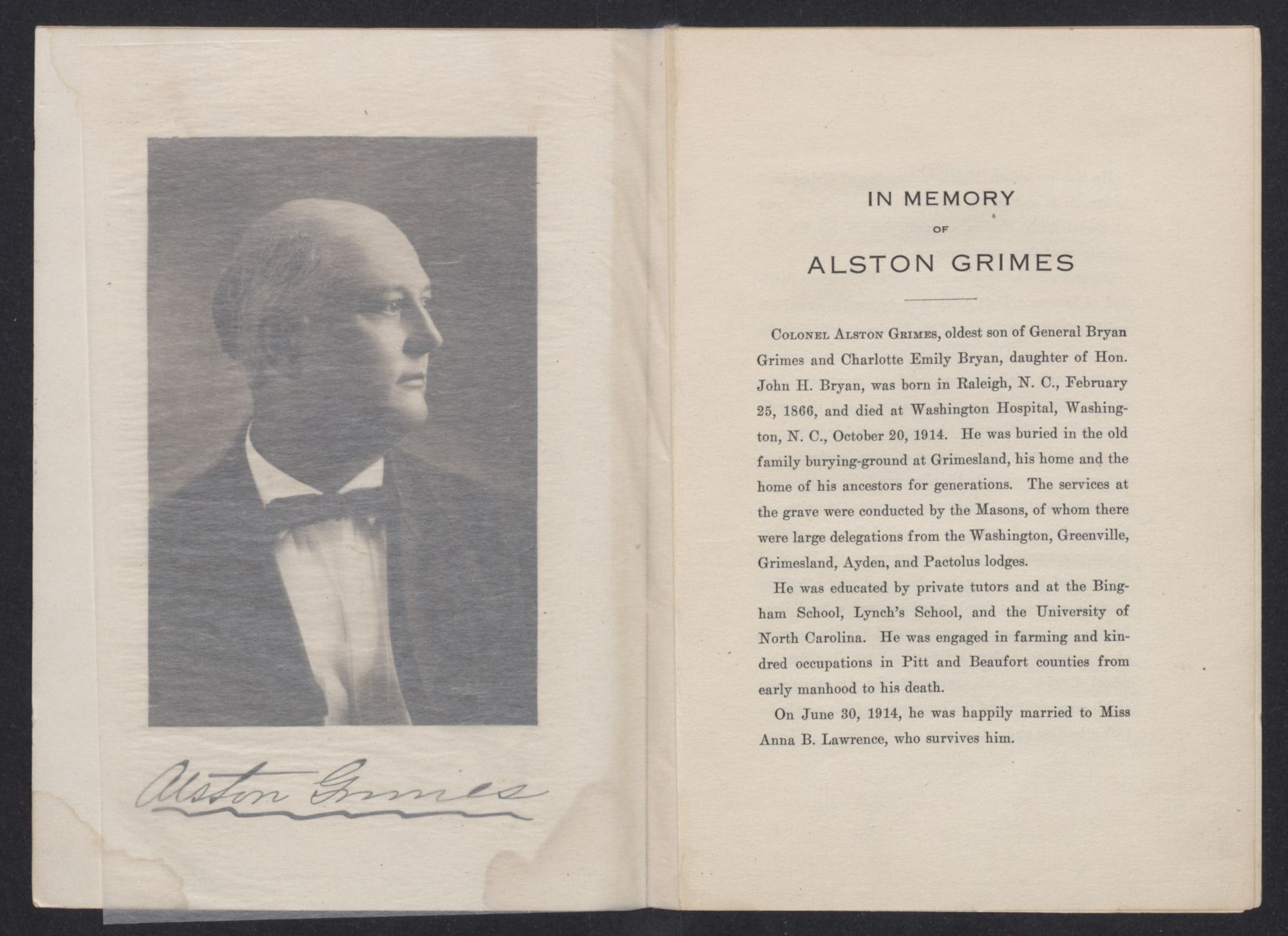 COLONEL ALSTON GRIMES, oldest son of General Bryan Grimes and Charlotte Emily Bryan, daughter of Hon. John H. Bryan, was born in Raleigh, N. C., February 25, 1866, and died at Washington Hospital, Washington, N. C., October 20, 1914. He was buried in the old family burying-ground at Grimesland, his home and the home of his ancestors for generations. The services at the grave were conducted by the Masons, of whom there were large delegations from the Washington, Greenville, Grimesland, Ayden, and Pactolus lodges.