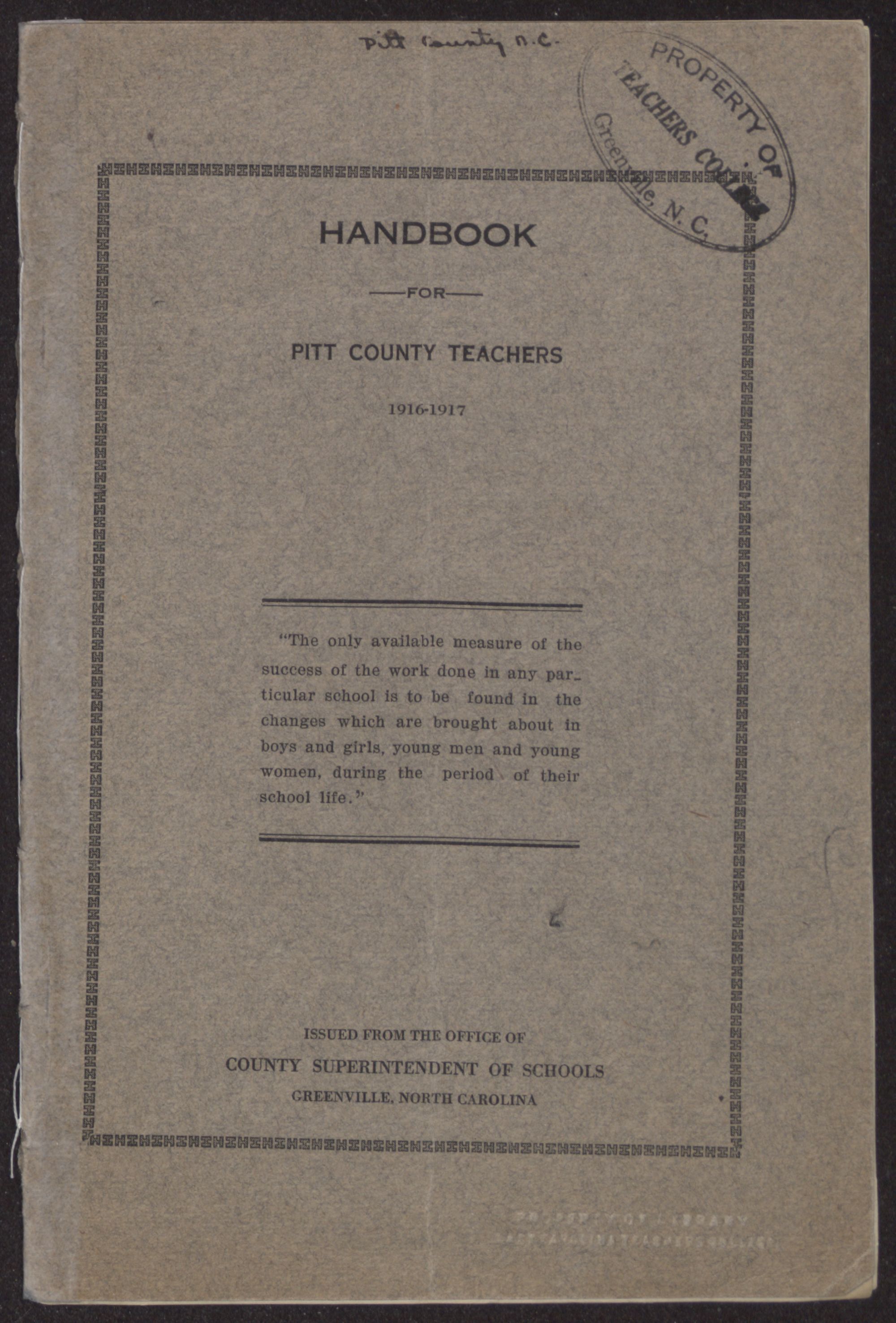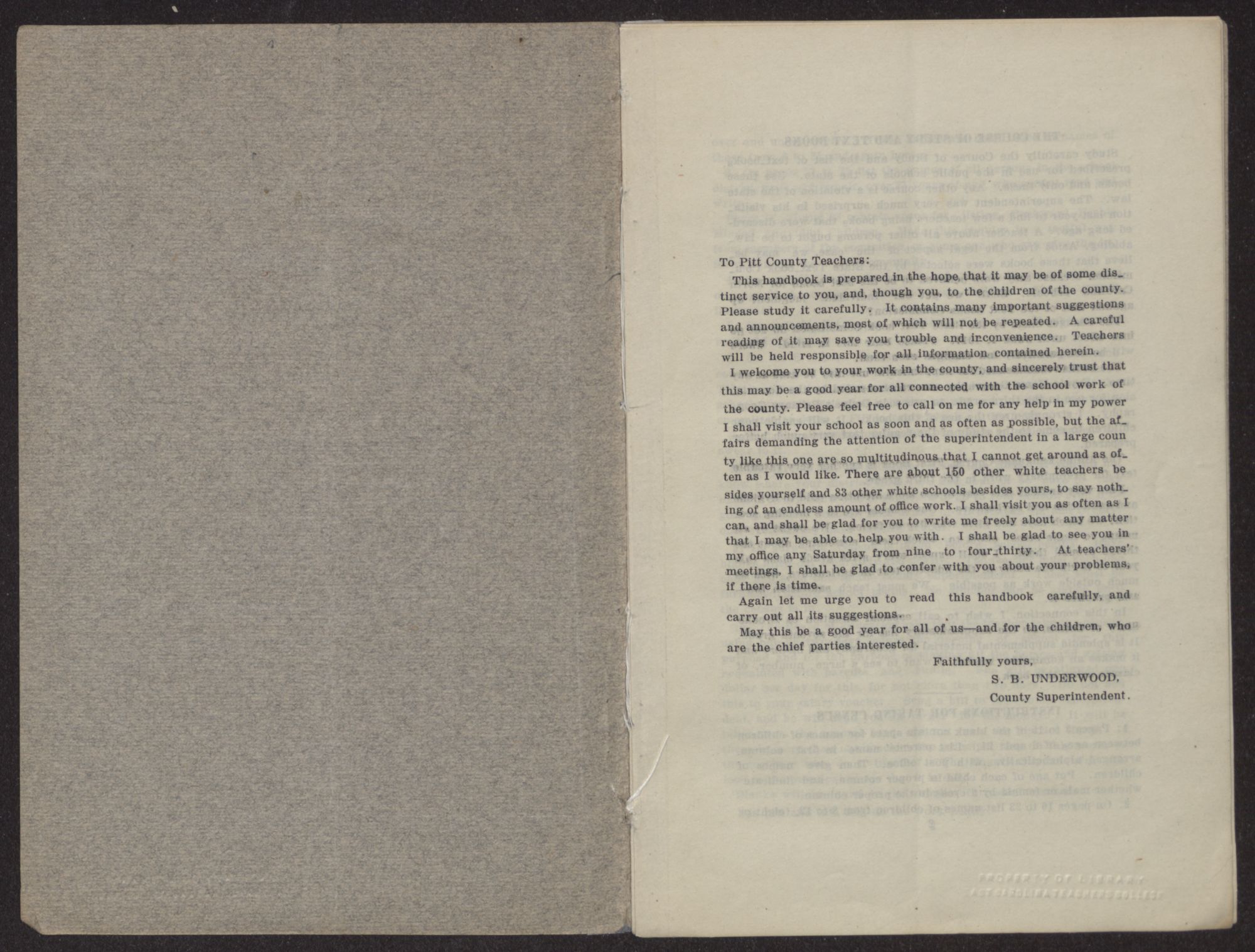 This handbook is prepared in the hope that it may be of some distinct service to you, and, though you, to the children of the county. Please study it carefully. It contains many important suggestions and announcements, most of which will not be repeated. A careful reading of it may save you trouble and inconvenience. Teachers will be held responsible for all information contained herein.
