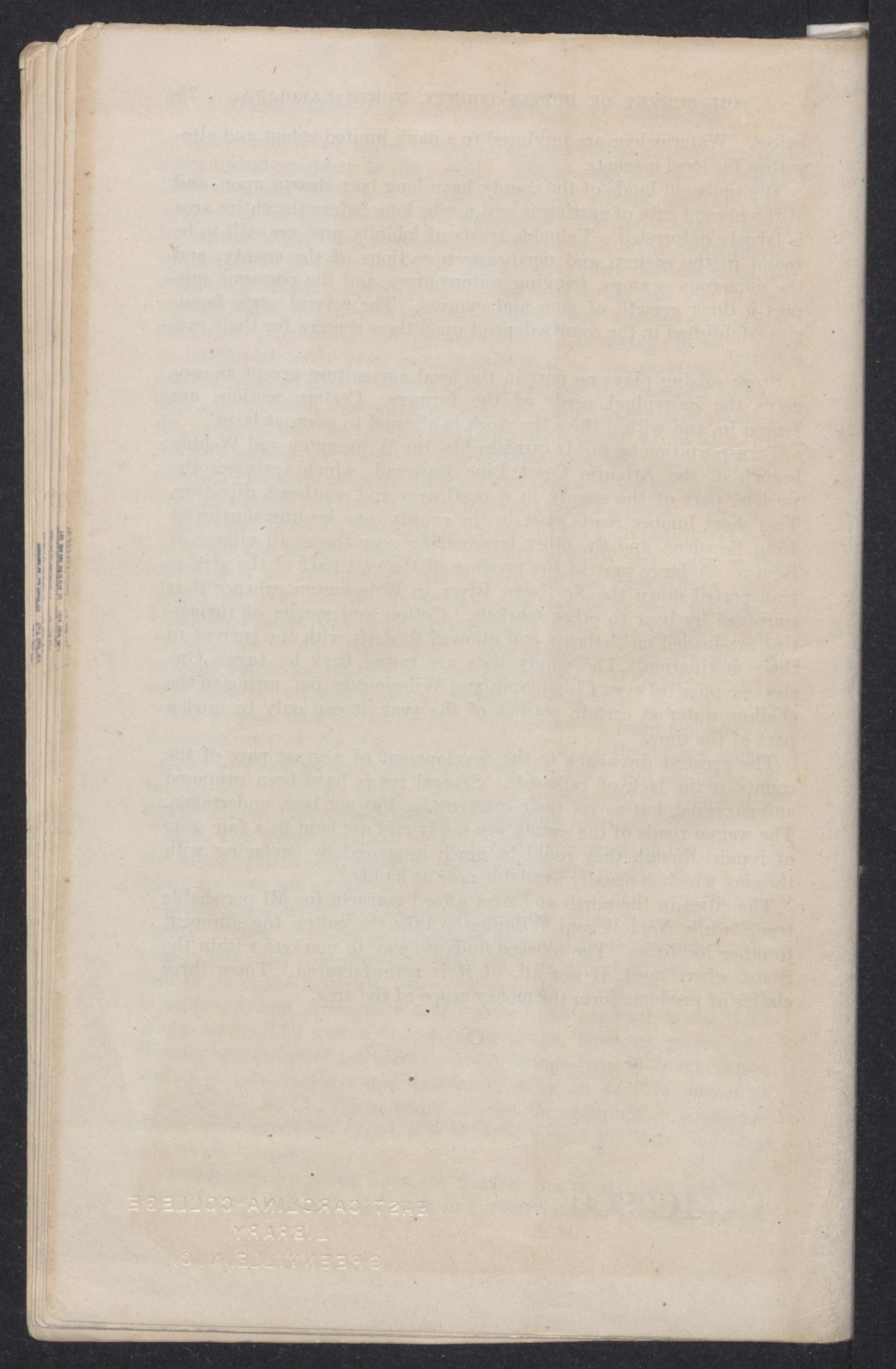 The cities in the north and west afford markets for all perishable truck, while Norfolk and Wilmington take the cotton for shipment to other localities. The tobacco finds its way to markets within the State, where most, if not all, of it is manufactured. These three classes of products form the money crops of the area.