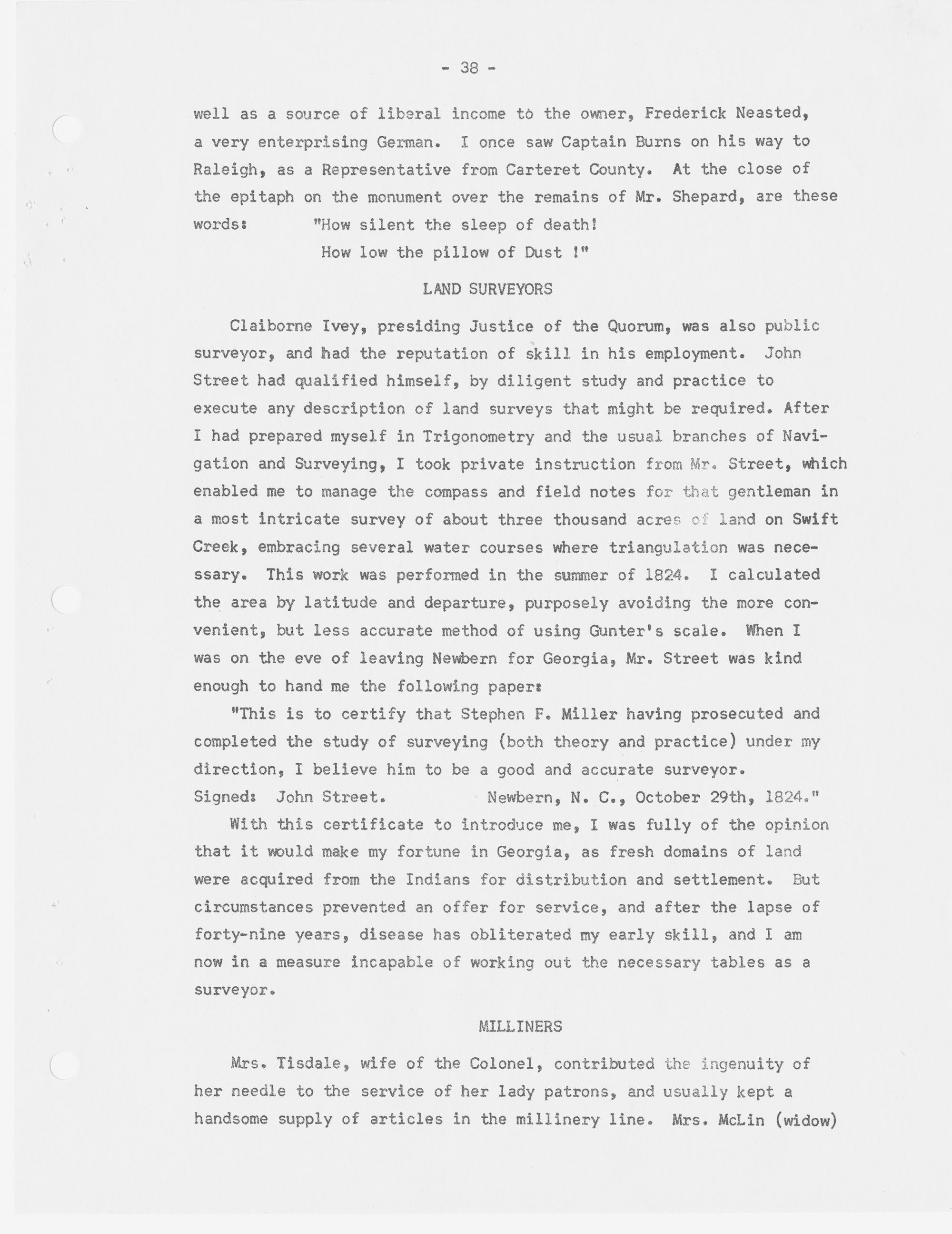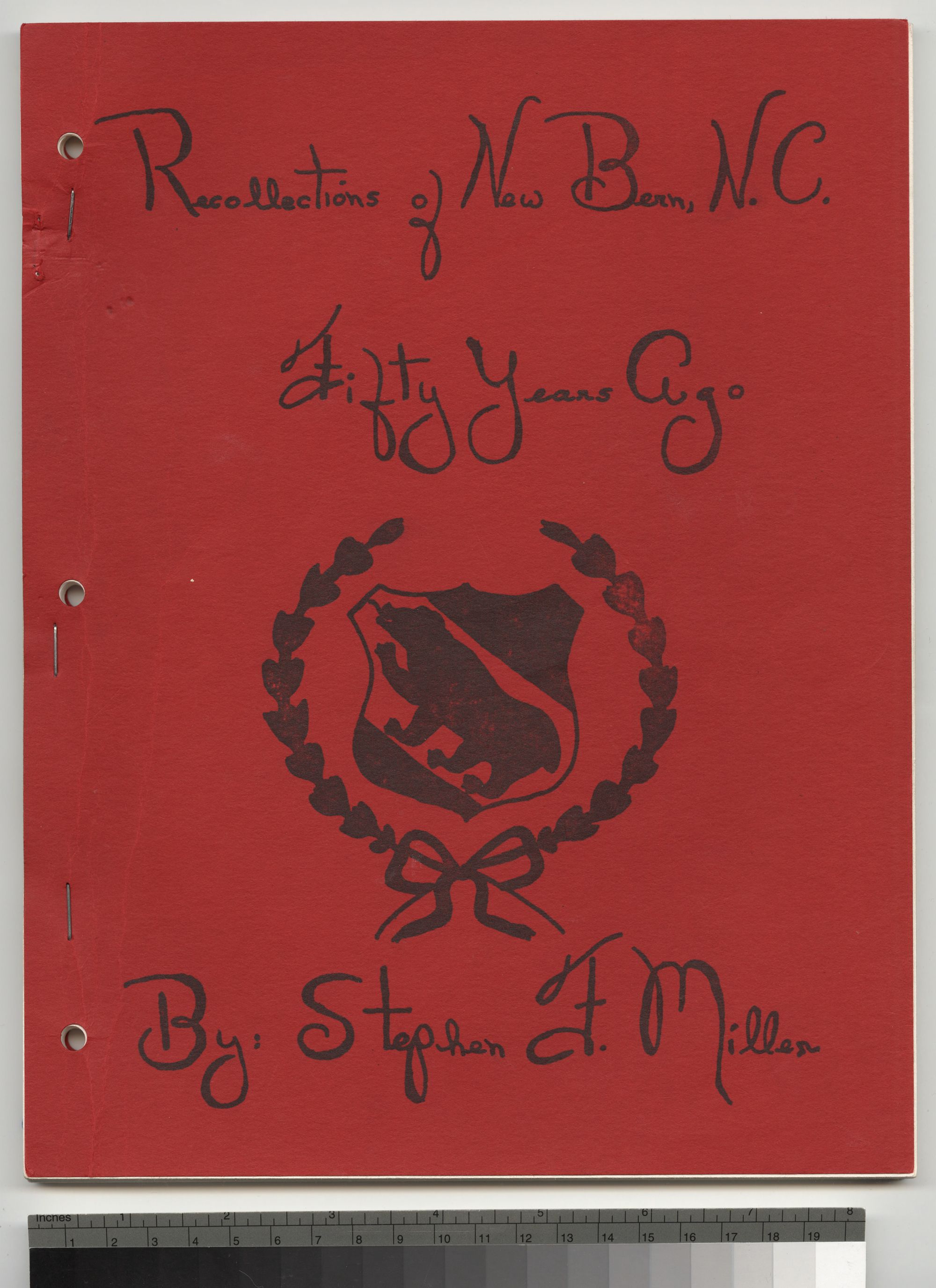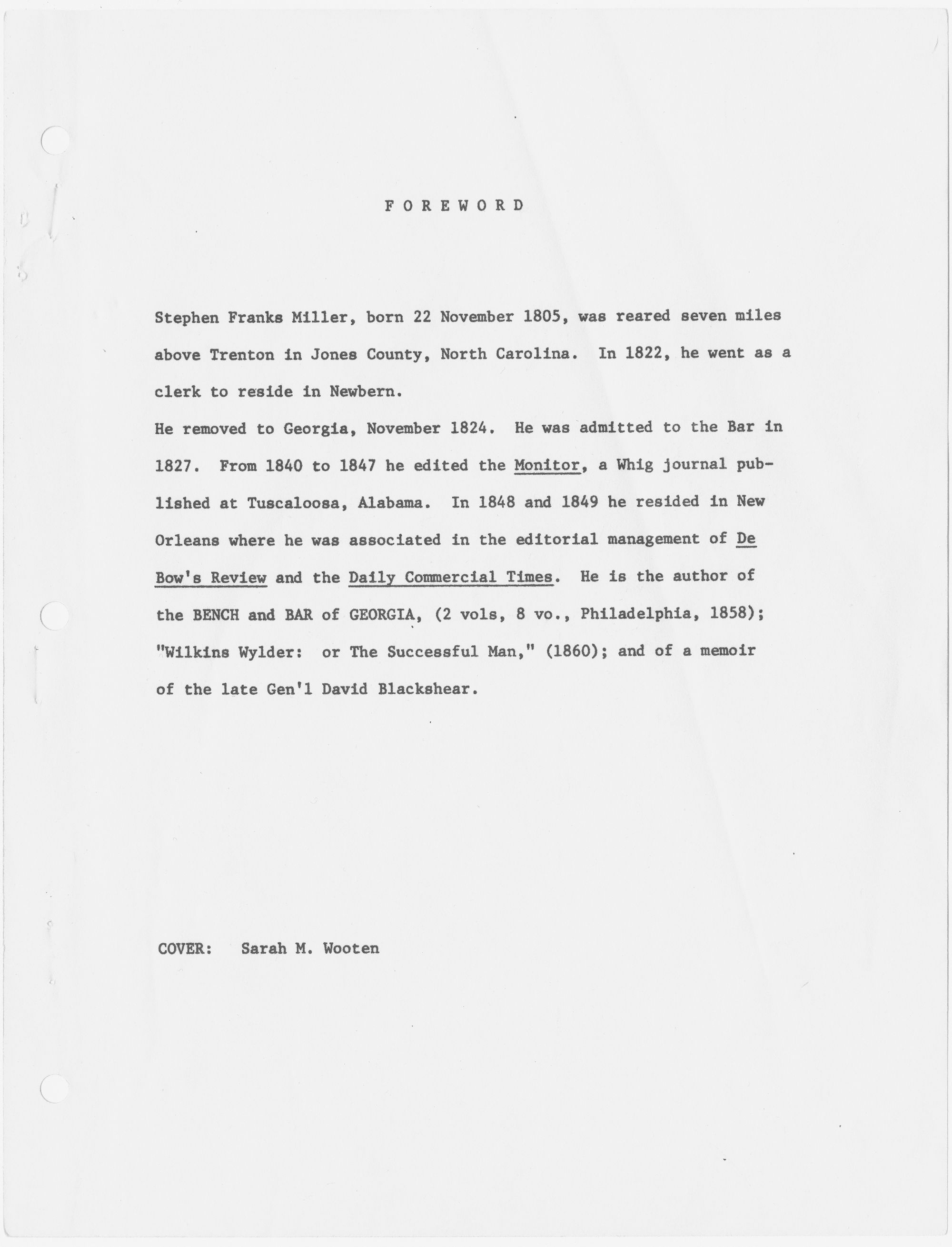 Stephen Franks Miller, born 22 November 1805, was reared seven miles above Trenton in Jones County, North Carolina. In 1822, he went as a clerk to reside in Newbern.