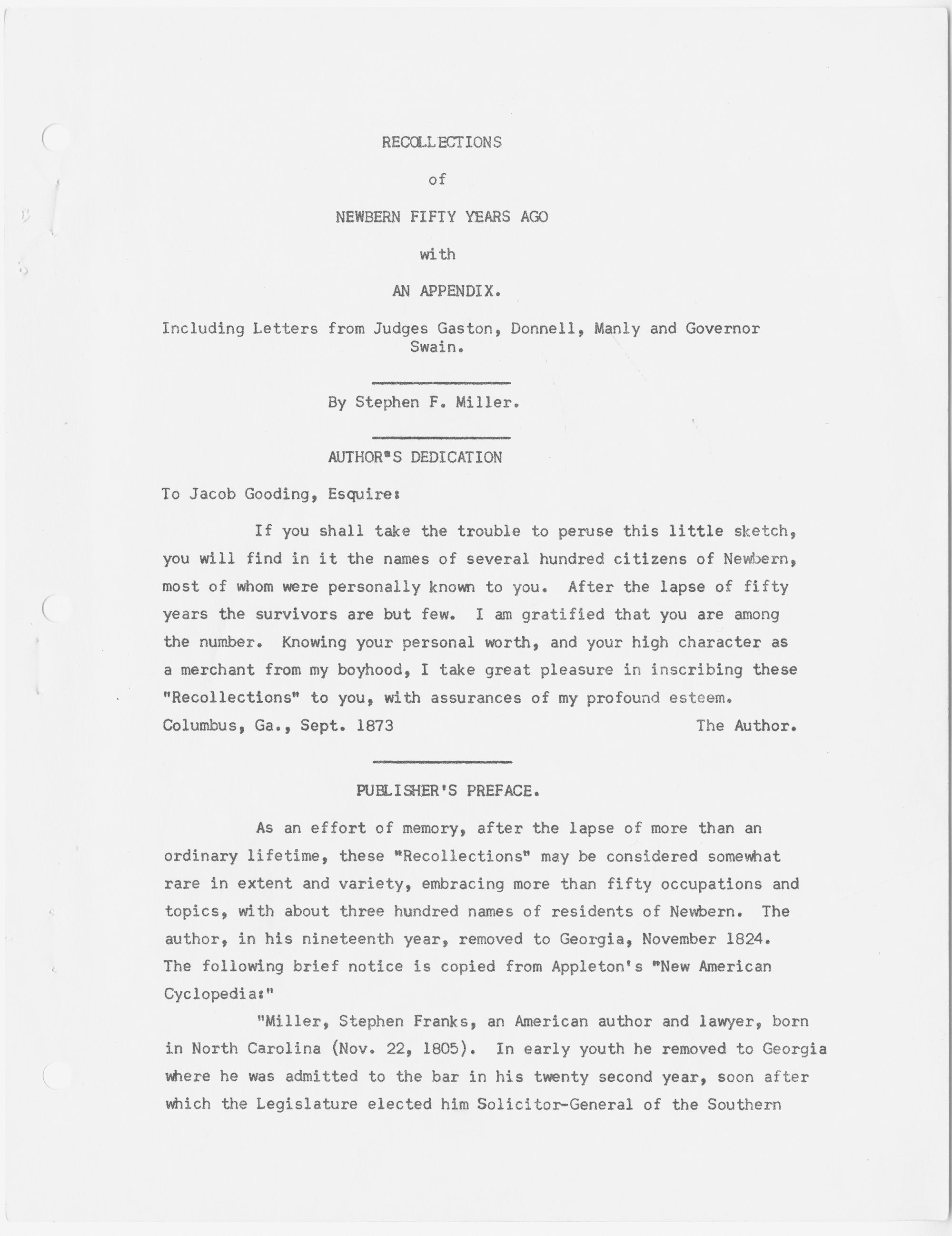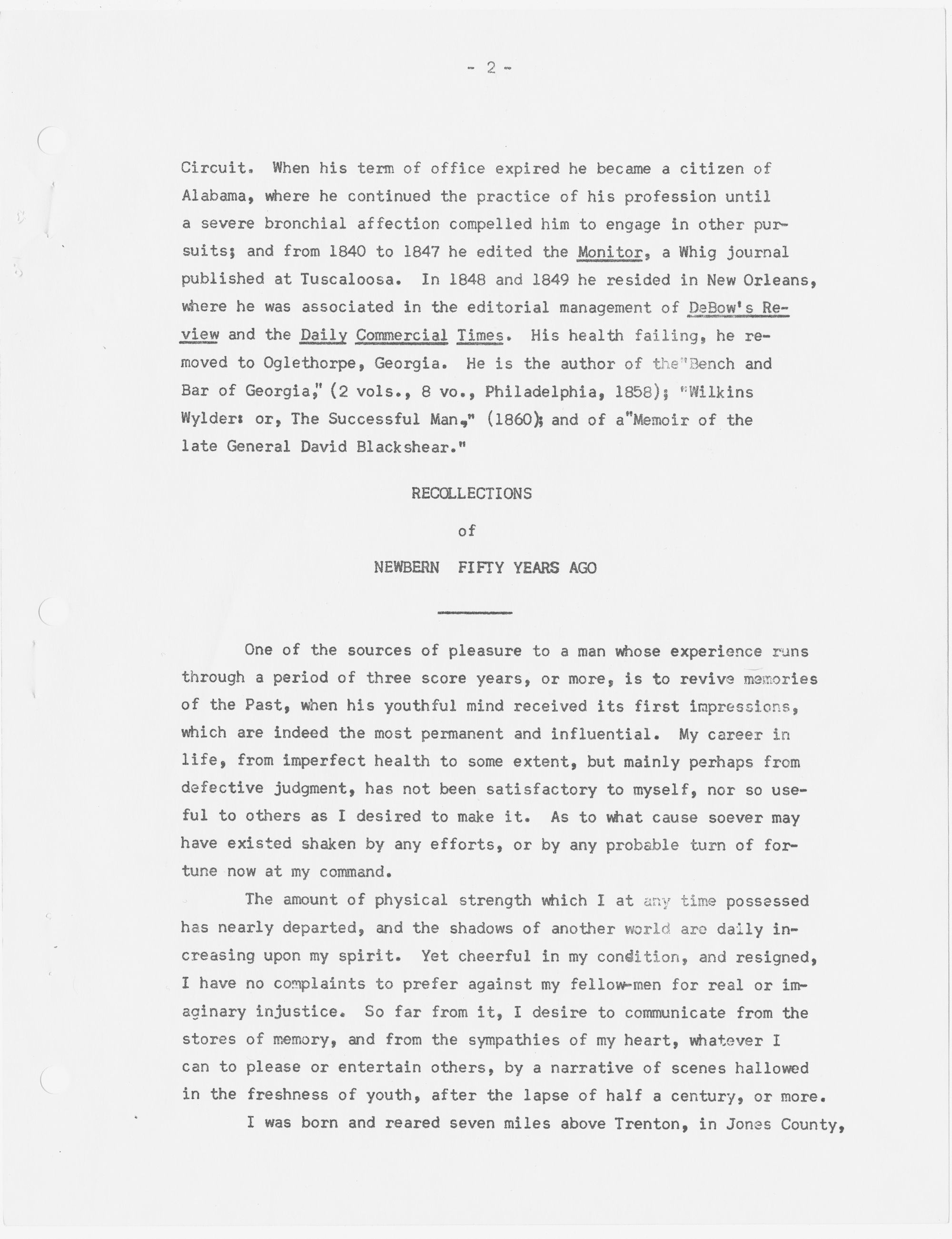 As an effort of memory, after the lapse of more than en ordinary lifetime, these "Recollections" may be considered somewhat rare in extent and variety, embracing more than fifty occupations and topics, with about three hundred names of residents of Newbern. The author, in his nineteenth year, removed to Georgia, November 1924. The following brief notice is copied from Appleton's "New American Cyclopedia:"