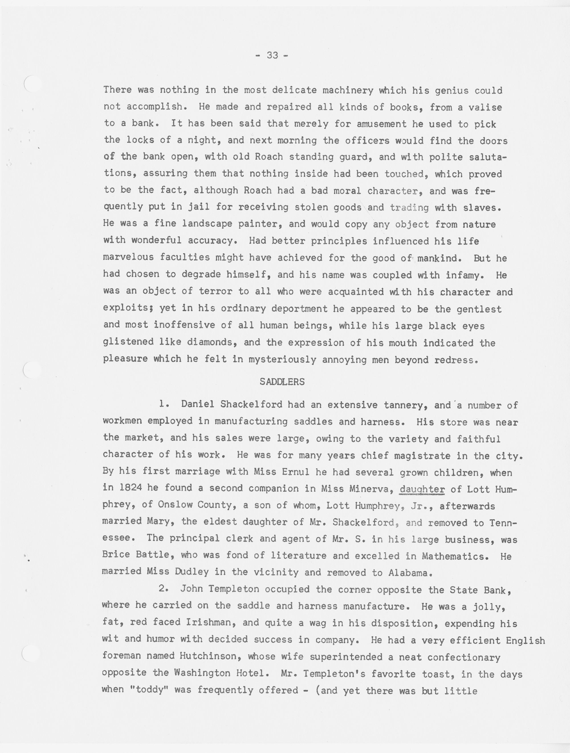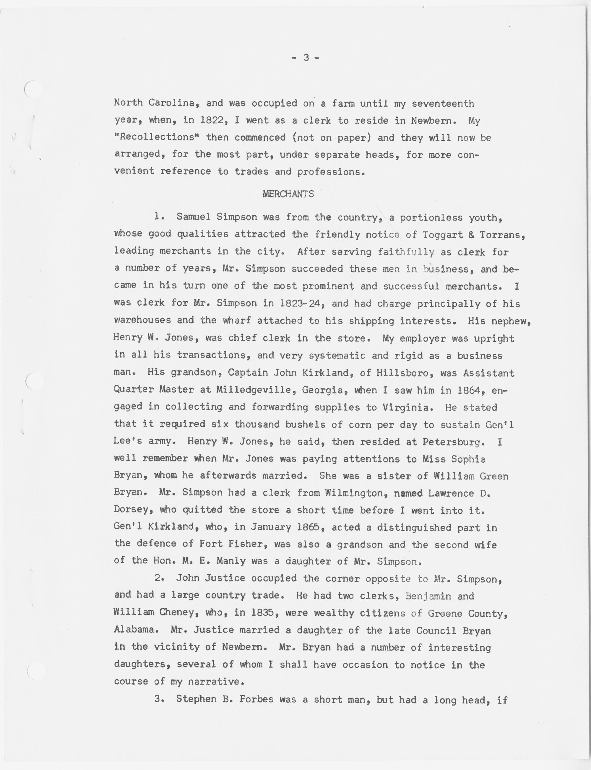 1. Samuel Simpson was from the country, a portionless youth, whose good qualities attracted the friendly notice of Toggart & Torrans, leading merchants in the city. After serving faithfully as clerk for a number of years, Mr. Simpson succeeded these men in business, and became in his turn one of the most prominent and successful merchants. I was clerk for Mr. Simpson in 1823-24, and had charge principally of his warehouses and the wharf attached to his shipping interests. His nephew, Henry W. Jones, was chief clerk in the store. My employer was upright in all his transactions, and very systematic and rigid as a business man. His grandson, Captain John Kirkland, of Hillsboro, was Assistant Quarter Master at Milledgeville, Georgia, when I saw him in 1864, engaged in collecting and forwarding supplies to Virginia. He stated that it required six thousand bushels of corn per day to sustain Genii Lee's army. Henry W. Jones, he said, than resided at Petersburg. I well remember When Mr. Jones was paying attentions to Miss Sophia Bryan, whom he afterwards married. She was a sister of William Green Bryan. Mr. Simpson had a clerk from Wilmington, named Lawrence D. Dorsey, who quitted the store a short time before I went into it. Gen, Kirkland, who, in January 1865, acted a distinguished part in the defence of Fort Fisher, was also a grandson and the second wife of the Hon. M. E. Manly was a daughter of Mr. Simpson.