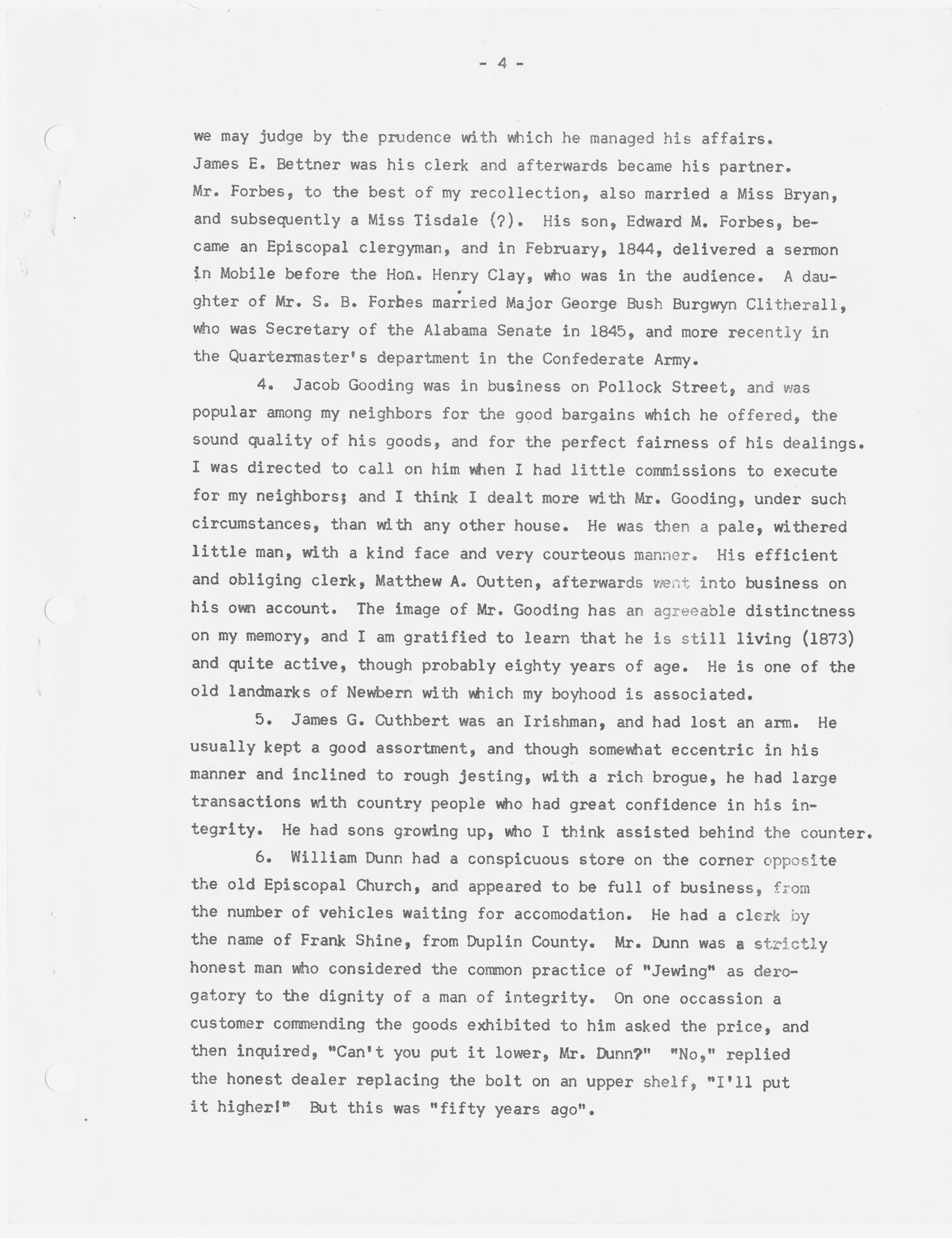 4. Jacob Gooding was in business on Pollock Street, and was popular among my neighbors for the good bargains which he offered, the sound quality of his goods, and for the perfect fairness of his dealings. I was directed to call on his when I had little commissions to execute for my neighbors, and I think I dealt more with Me. Gooding, under such circumstances, than with any other house. He was then a pale, withered little man, with a kind face and very courteous manner. His efficient and obliging clerk, Matthew A. Outten, afterwards went into business on his own account. The image of Mr. Gooding has an agreeable distinctness on my memory, and I am gratified to learn that he is still living (1873) and quite active, though probably eighty years of eye. He is one of the old landmarks of Newbern with which my boyhood is associated.