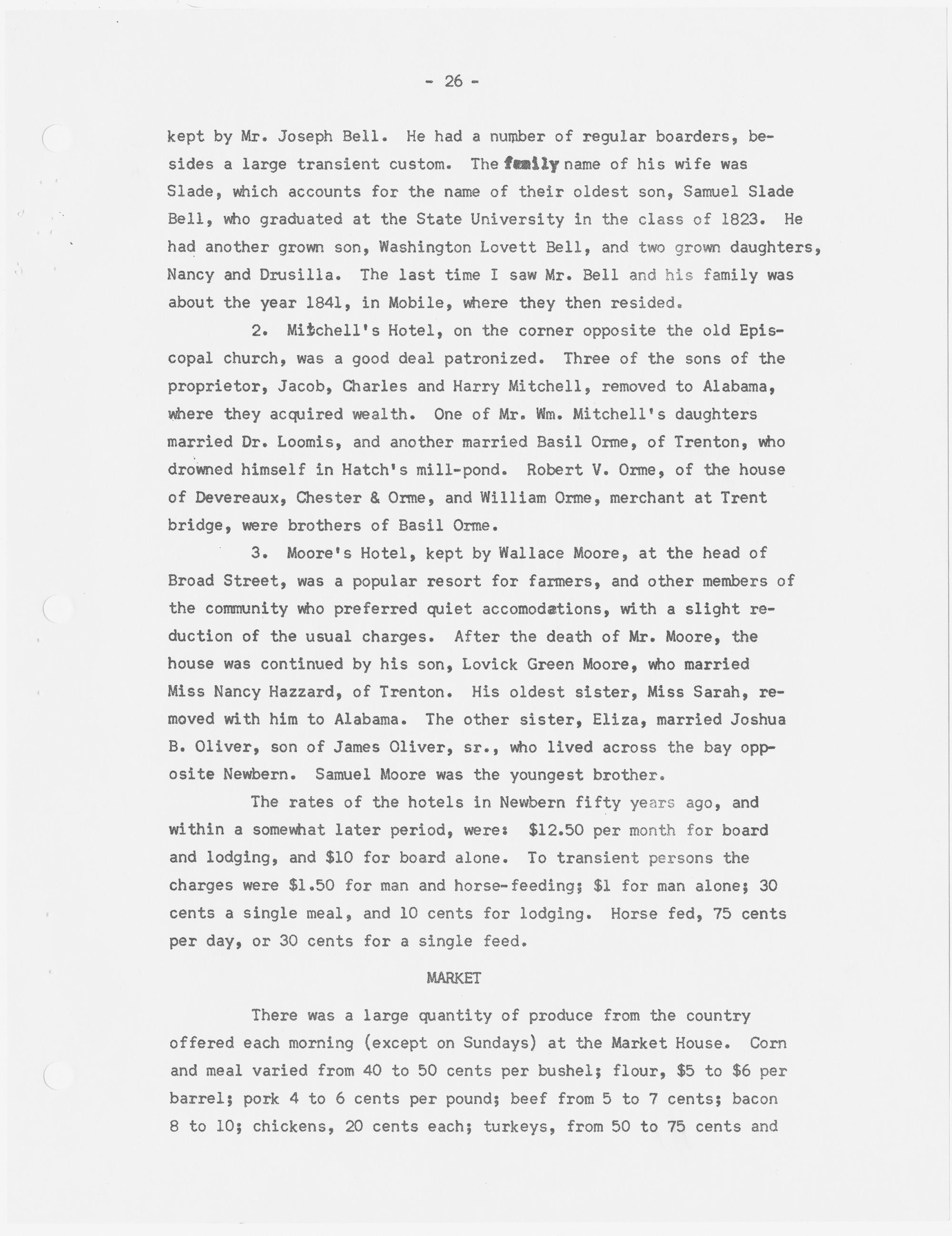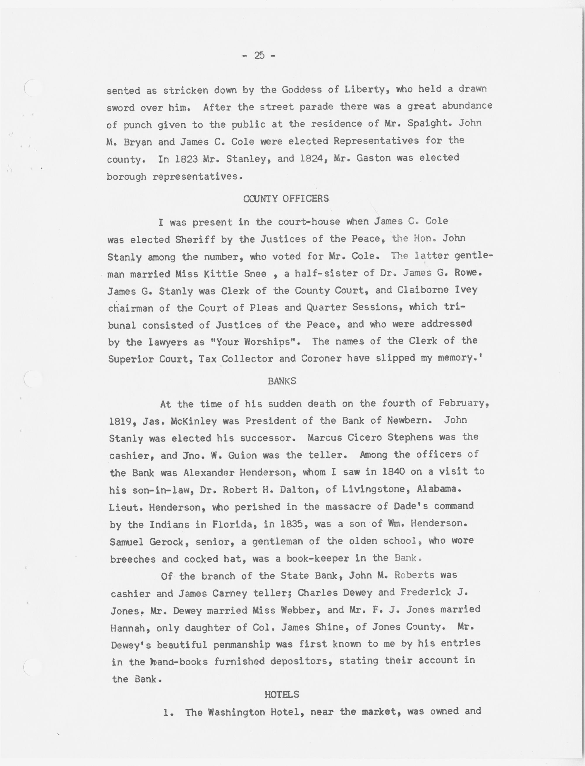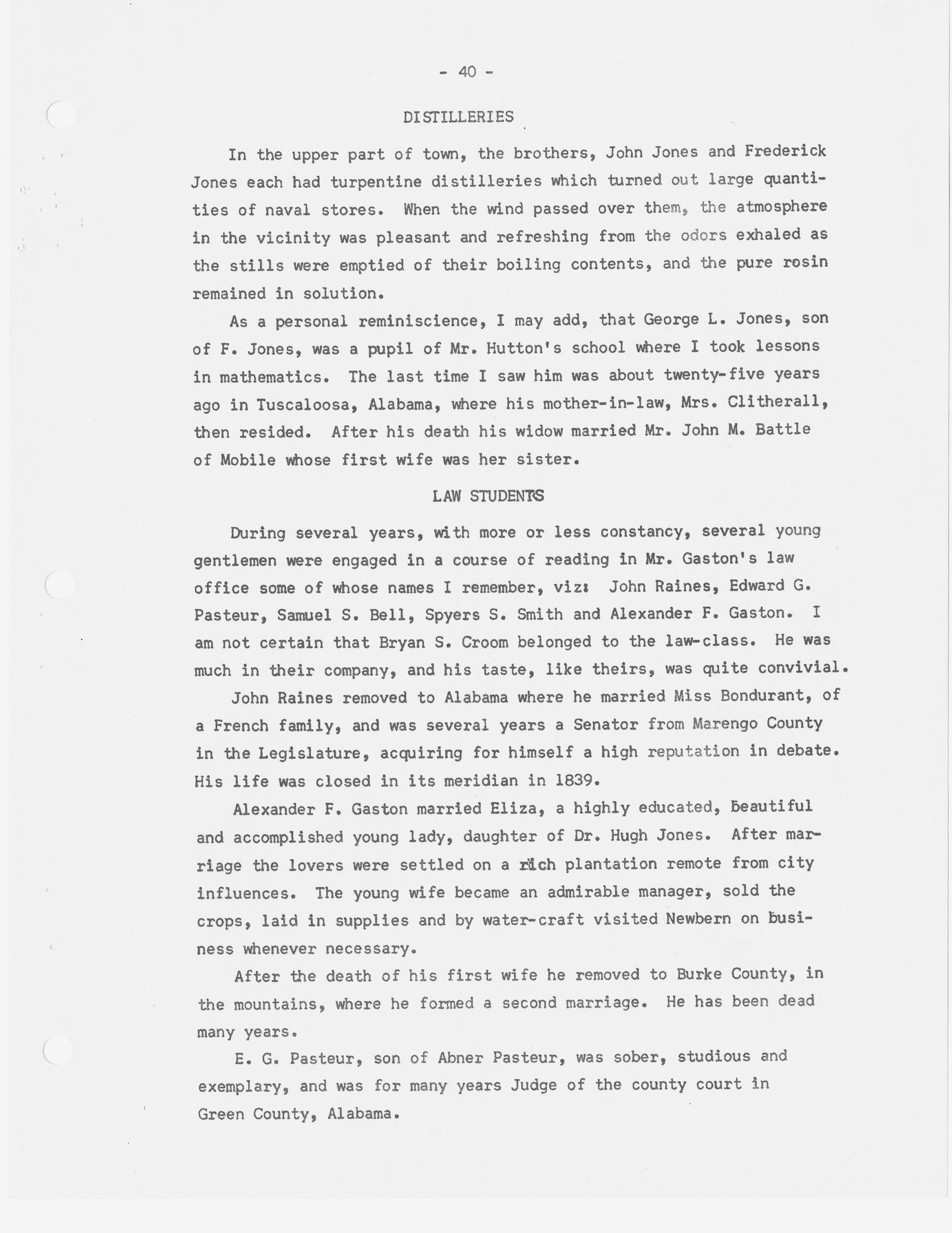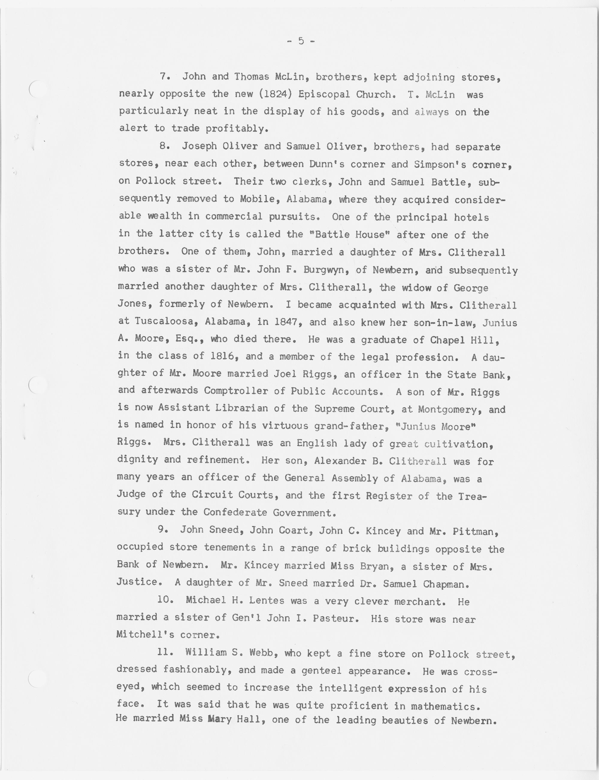 8. Joseph Oliver and Samuel Oliver, brothers, had separate stores, near each other, between Dunn's corner and Simpson's corner, on Pollock street. Their two clerks, John and Samuel Battle, subsequently removed to Mobile, Alabama, where they acquired considerable wealth in commercial pursuits. One of the principal hotels in the latter city is called the "Battle House" after one of the brothers. One of them, John, married a daughter of Mrs. Clitherall who was a sister of Be. John F. Burgwyn, of Newbern, and subsequently married another daughter of Mrs. Clitherall, the widow of George Jones, formerly of Newbern. I became acquainted with Mrs. Clitherall at Tuscaloosa, Alabama, in 1847, and also knew her son-in-law, Junius A. Moore, Esq., who died there. He was a graduate of Chapel Hill, in the class of 1816, and a member of the legal profession. A daughter of Mr. Moore married Joel Riggs, en officer in the State Bank, and afterwards Comptroller of Public Accounts. A son of Me. Riggs is now Assistant Librarian of the Supreme Court, at Montgomery, and is named in honor of his virtuous grand-father, "Junius Moore" Riggs. Mrs. Clitherall was en English lady of great cultivation, dignity and refinement. Her son, Alexander B. Clitherall was for many years en officer of the General Assembly of Alabama, was a Judge of the Circuit Courts, and the first Register of the Treasury under the Confederate Government.