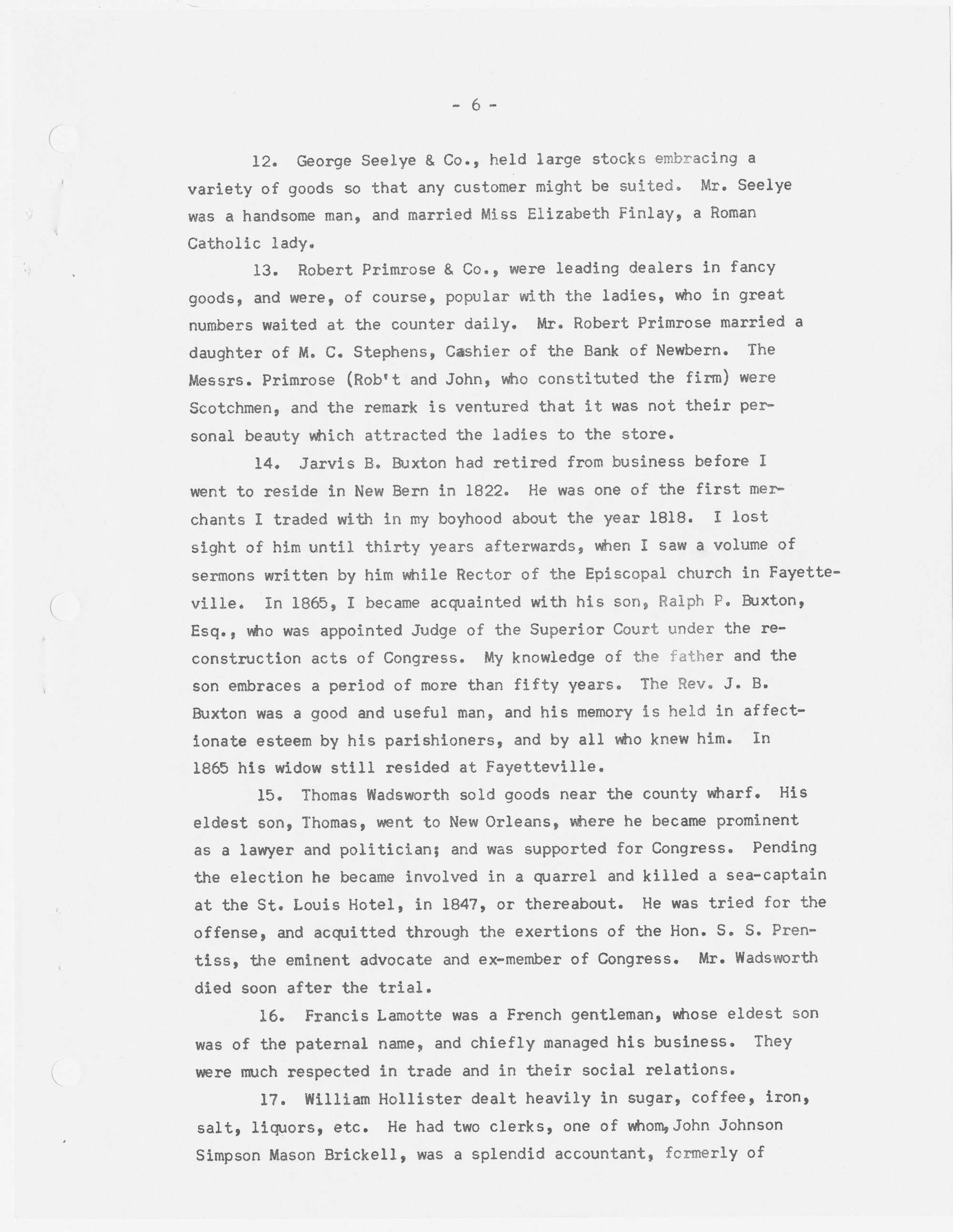 14. Jarvis B. Buxton had retired from business before 1 went to reside in New Bern in 1822. He was one of the first merchants I traded with in my boyhood about the year 1818. I lost sight of him until thirty years afterwards, when I saw a volume of sermons written by him while Rector of the Episcopal church in Fayetteville. In 1865, I became acquainted with his son, Ralph P. Buxton, Esq., who was appointed Judge of the Superior Court under the re-construction acts of Congress. My knowledge of the father and the son embraces a period of more than fifty years. The Rev. J. B. Buxton was a good and useful man, and his memory is held in affectionate esteem by his parishioners, and by all who knew him. In 1865 his widow still resided at Fayetteville.