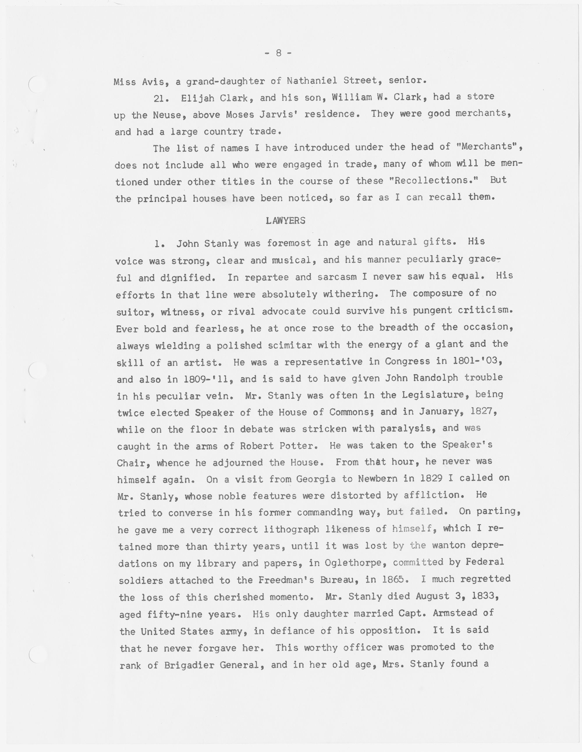 1. John Stanly was foremost in age and natural gifts. His voice was strong, clear and musical, and his manner peculiarly graceful and dignified. In repartee and sarcasm I never saw his equal. His efforts in that live were absolutely withering. The composure of no suitor, witness, or rival advocate could survive his pungent criticism. Ever bold and fearless, he at once rose to the breadth of the occasion, always wielding a polished scimitar with the energy of a giant and the skill of an artist. He was a representative in Congress in 1801-'03, and also in 1809-11, and is said to have given John Randolph trouble in his peculiar vein. Mr. Stanly was often in the Legislature, being twice elected Speaker of the House of Commons; and in January, 1827, stile on the floor in debate was stricken with paralysis, and we., caught in the arms of Robert Potter. He was taken to the Speaker's Chair, stance he adjourned the House. From that hour, he never was himself again. Cs a visit from Georgia to Newbern in 18291 called on Mr. Stanly, whose noble features were distorted by affliction. He tried to converse in his former commanding way, but failed. On parting, he gave me a very correct lithograph likeness of himself, which I retained more than thirty years, until it was lost by the wanton depredations on my library and papers, in Oglethorpe, committed by Federal soldiers attached to the Freedman's Bureau, in 1865. I much regretted the loss of this cherished momento. Mr. Stanly died August 3, 1833, aged fifty-nine years. His only daughter married Capt. Armstead of the United States army, in defiance of his opposition. It is said that he never forgave her. This worthy officer was promoted to the rank of Brigadier General, and in her old age, Mrs. Stanly found a