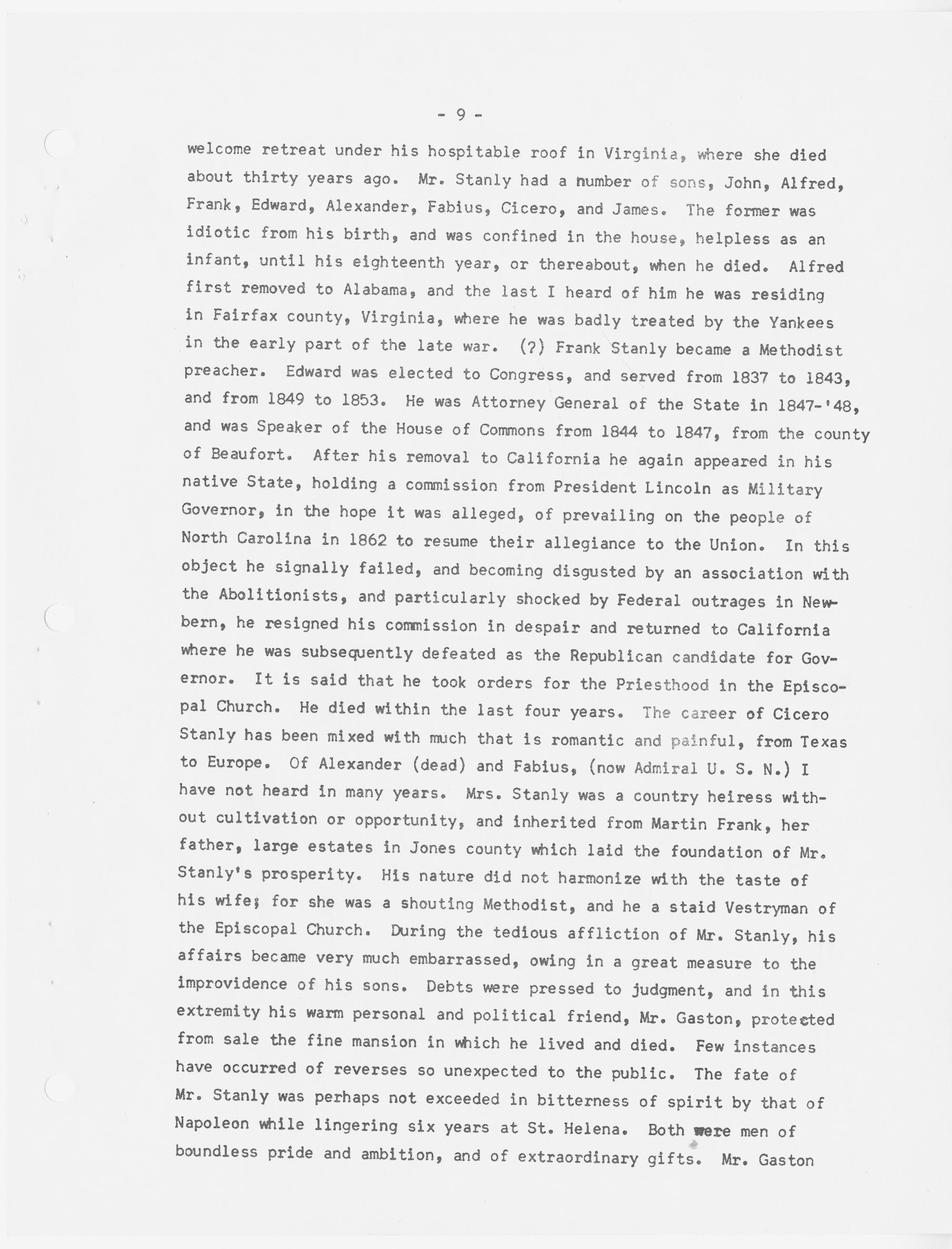 welcome retreat under his hospitable roof in Virginia, where she died about thirty years ago. Mr. Stanly had a number of sons, John, Alfred, Frank, Edward, Alexander, Fabius, Cicero, and James. The former was idiotic from his birth, and was confined in the house, helpless as an infant, until his eighteenth year, or thereabout, when he died. Alfred first removed to Alabama, and the last I heard of him he was residing in Fairfax county, Virginia, where he was badly treated by the Yankees in the early part. of the late war. (7) Frank Stanly became a Methodist preacher. Edward was elected to Congress, and served from 1837 to i843, and from 1849 to 1853. He was Attorney General of the State in 1847-48, and was Speaker of the House of Commons from 1844 to 1847, from the county of Beaufort. After his removal to California he again appeared in his native State, holding a commission from President Lincoln as Military Governor, in the hope it was alleged, of prevailing on the people of North Carolina in 1862 to resume their allegiance to the Union. In this object he signally failed, and becoming disgusted by an association with the Abolitionists, and particularly shocked by Federal outrages in New- born, he resigned his commission in despair and returned to California these he was subsequently defeated as the Republican candidate for Governor. It is said that he took orders for the Priesthood is the Episcopal Church. He died within the last four years. The career of Cicero Stanly has been mixed with much that is romantic and painful, from Texas to Europe. Of Alexander (dead) and Fabius, (now Admiral U. S. N.) I have not heard in many years. Mrs. Stanly was a country heiress without cultivation or opportunity, and inherited from Martin Frank, her father, large estates in Jones county which laid the foundation of Mr. Stanly's prosperity. His nature did not harmonize with the taste of his wife; for she was a shouting Methodist, and he a staid Vestryman of the Episcopal Church. During the tedious affliction of Mr. Stanly, his affairs became very much embarrassed, owing in a great measure to the improvidence of his sons. Debts were pressed to judgment, and in this extremity his warm personal and political friend, Mr. Gaston, protected from sale the fine mansion in which he lived and died. Few instances have occurred of reverses so unexpected to the public. The fate of Mr. Stanly was perhaps not exceeded in bitterness of spirit by that of Napoleon while lingering six years at St. Helena. Both were men of boundless pride and ambition, and of extraordinary gifts. Mr. Gaston