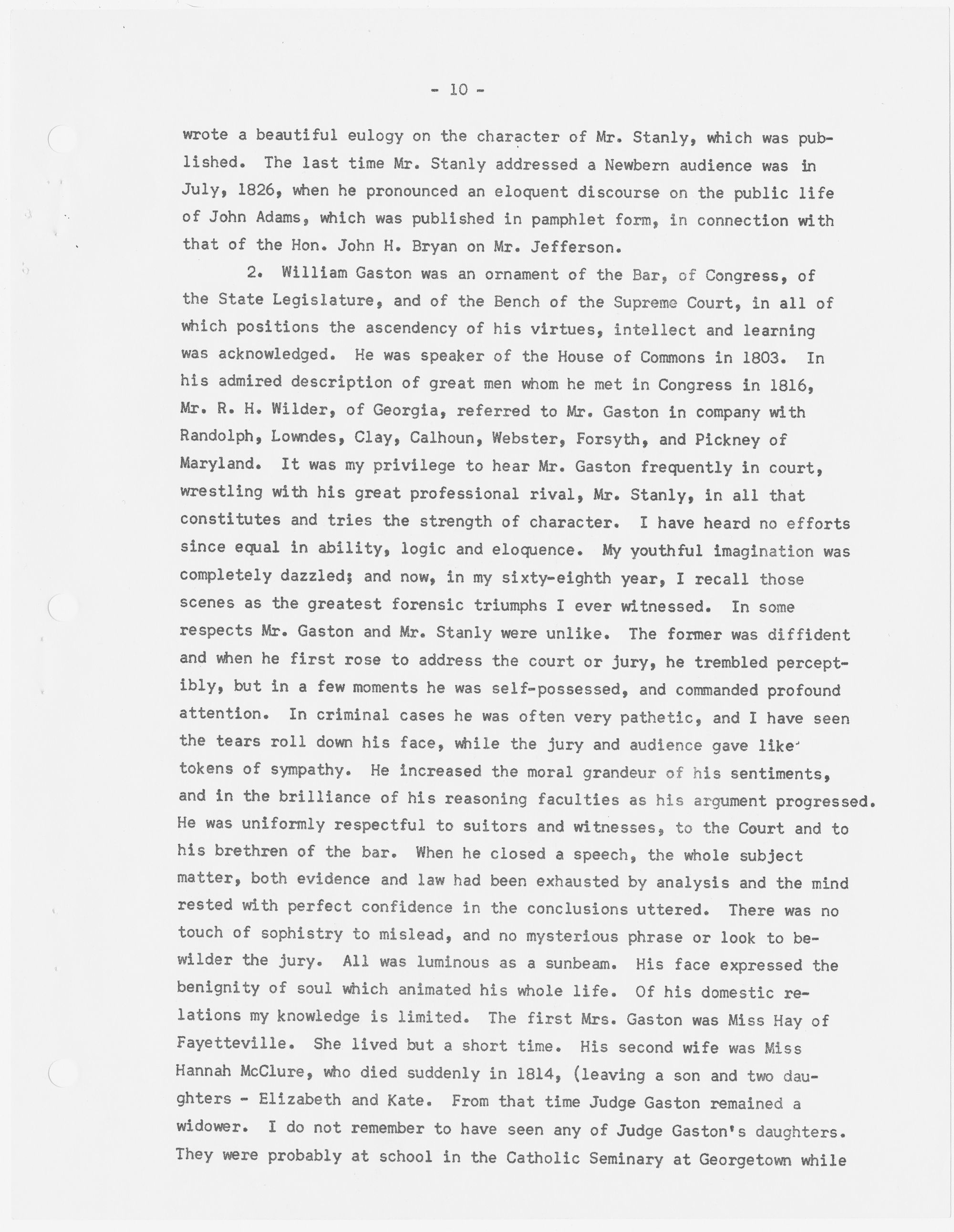 matter, both evidence and law had been exhausted by analysis and the mind rested with perfect confidence in the conclusions uttered. There was no touch of sophistry to mislead, and no mysterious phrase or look to bewilder the jury. All was luminous as a sunbeam. His face expressed the benignity of soul which animated his whole life. Of his domestic relations to knowledge is limited. The first Mrs. Gaston was Miss Hay of Fayetteville. She lived but a short time. His second wife was Miss Hannah McClure, who died suddenly in 1814, (leaving a son and two daughters - Elizabeth and Kate. From that time Judge Gaston remained a widower. I do not remember to have seen any of Judge Gaston's daughters. They were probably at school in the Catholic Seminary at Georgetown while
