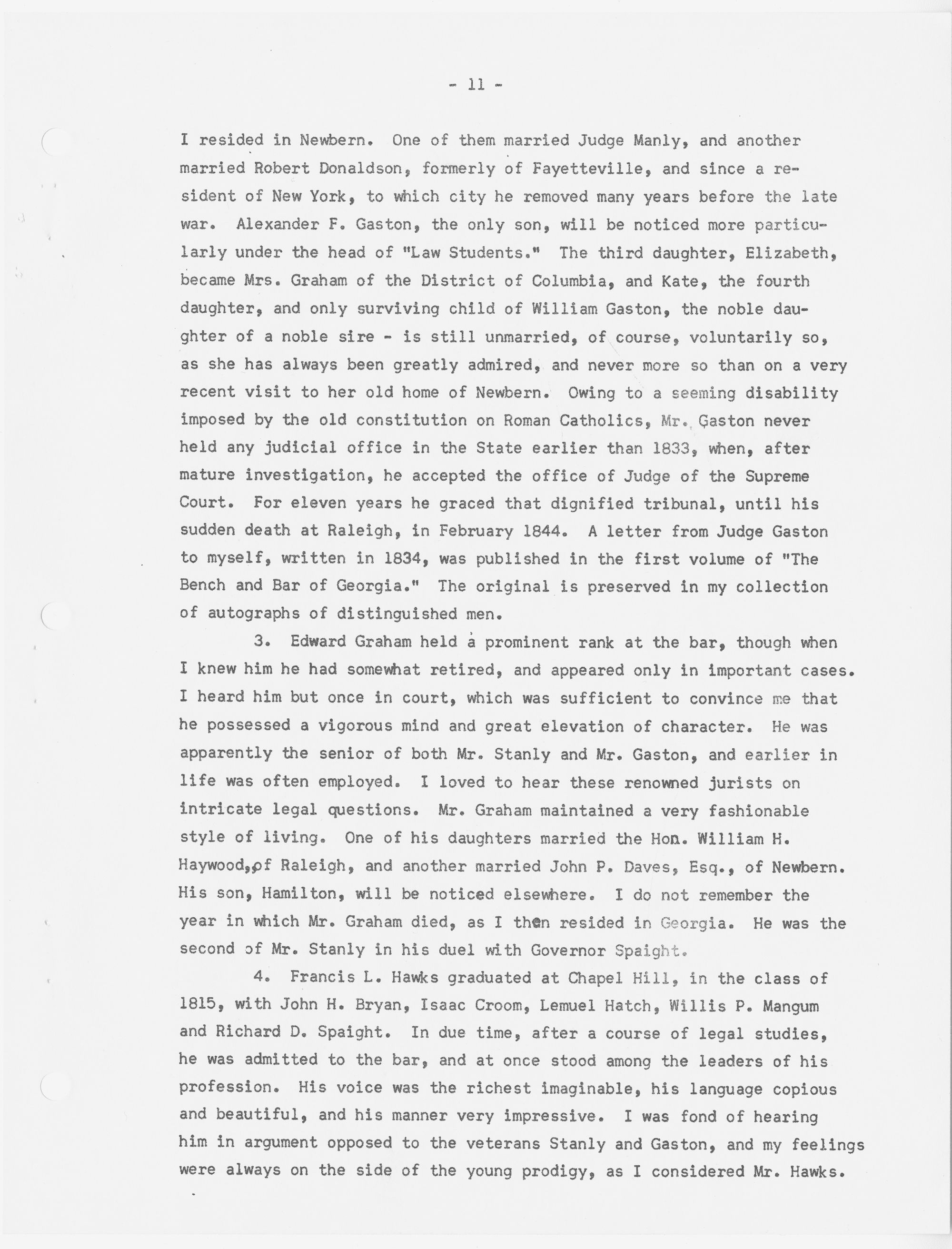 I resided in Newbern. One of them married Judge Manly, and another married Robert Donaldson, formerly of Fayetteville, and since a resident of New York, to which city he removed many years before the late war. Alexander F. Gaston, the only son, will be noticed more particularly under the head of "Law Students." The third daughter, Elizabeth, became Mrs. Graham of the District of Columbia, and Kate, the fourth daughter, and only surviving child of William Gaston, the noble daughter of a noble sire - is still unmarried, of course, voluntarily so, as she has always been greatly admired, and never more to than on a very recent visit to her old home of Newbern. Owing to a seeming disability imposed by the old constitution on Roman Catholics, Mr. Gaston never held any judicial office in the State earlier than 1833, when, after mature investigation, he accepted the office of Judge of the Supreme Court. For eleven years he graced that dignified tribunal, until his sudden death et Raleigh, in February 1844. A letter from Judge Gaston to myself, written in 1834, was published in the first volume of "The Bench and Bar of Georgia." The original is preserved in my collection of autographs of distinguished men.