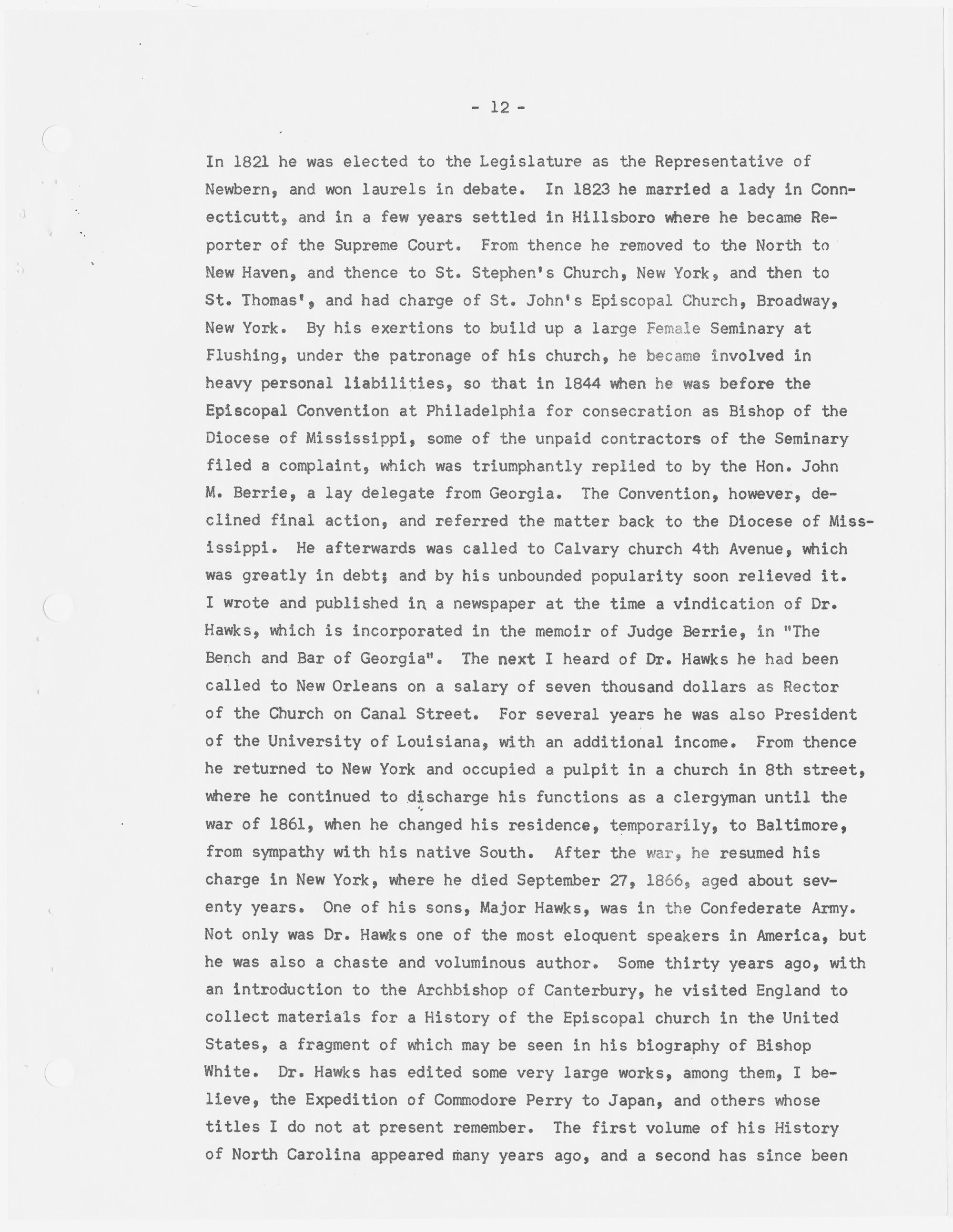 In 1821 ho was elected to the Legislature as the Representative of Newbern, and won laurels in debate. In 1823 he married a lady in Connecticut, and in a few years settled in Hillsboro where he became Reporter of the Supreme Court. From thence he removed to the North Be New Haven, and thence to St. Stephen's Church, New York, and then to St. Thomas', and had charge of St. John's Episcopal Church, Broadway, New York. By his exertions to build up a large emote Seminary at Flushing, under the patronage of his church, he became involved Be heavy personal liabilities, so that in 1844 when he was before the Episcopal Convention at Philadelphia for consecration es Bishop of the Diocese of Mississippi, some of the unpaid contractors of the Seminary filed a complaint, which was triumphantly replied to by the Hon. John M. Berrie, a lay delegate from Georgia. The Convention, however, declined final action, and referred the matter back to the Diocese of Mississippi. He afterwards was called to Calvary church 4th Avenue, which was greatly in debt; and by his unbounded popularity soon relieved it. I wrote and published in a newspaper at the time a vindication of Dr. Hawks, which is incorporated in the memoir of Judge Berrie, in "The Bench and Bar of Georgia.. The next heard of Dr. Hawks he had been called to New Orleans on a salary of seven thousand dollars as Rector of the Church on Canal Street. For several years he was also President of the University of Louisiana, with an additional income. From thence he returned to New York and occupied a pulpit in a church in 8th street, where he continued to discharge his functions as a clergyman until the war of 1861, when he changed his residence, temporarily, to Baltimore, from sympathy with his native South. After the war, he resumed his charge in New York, where he died September 27, 1816, aged about seventy years. One of his sons, Major Hawks, was in the Confederate Army. Not only was Dr. Hawks one of the most eloquent speakers in America, but he was also a chaste and voluminous author. Some thirty years ago, with an introduction to the Archbishop of Canterbury, he visited England to collect materials for a History of the Episcopal church in the United States, a fragment of which may be seen in his biography of Bishop White. Dr. Hawks has edited some very large works, among them, I believe, the Expedition of Commodore Perry to Japan, and others whose titles I do not at present remember. The first volume of his History of North Carolina appeared many years ago, and a second has since been