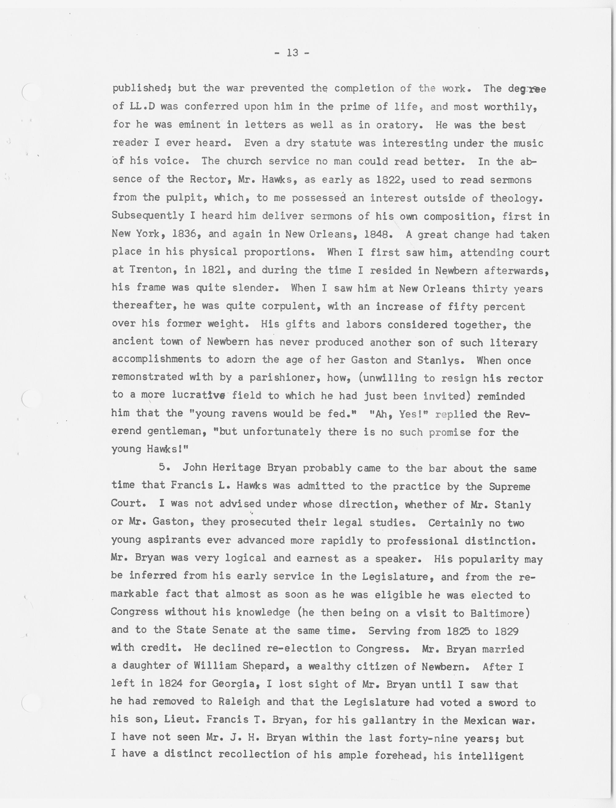 published; but the war prevented the completion of the work. The degree of LLD was conferred upon him in the prime of life, and most worthily, for he was eminent in letters as well as in oratory. He was the best reader I ever heard. Even a dry statute was interesting under the music of his voice. The church service no man could read better. In the ab- sence of the Rector, Mr. Hawks, as early as 1822, used to read sermons from the pulpit, which, to me possessed an interest outside of theology. Subsequently I heard his deliver sermons of his own composition, first in New York, 1836, and again in New Orleans, 1848. A great change had taken place in his physical proportions. When I first saw him, attending court at Trenton, in 1821, and during the time I resided in Newbern afterwards, his frame was quite slender. When I saw him at New Orleans thirty years thereafter, he was quite corpulent, with an increase of fifty percent over his former weight. His gifts and labors considered together, the ancient town of Newbern has never produced another son of such literary accomplishments to adorn the age of her Gaston and Stanlys. When once remonstrated with by a parishioner, how, (unwilling to resign his rector to a more lucrative field to which he had just been invited) reminded him that the "young ravens would be fed." "Ah, Yes!" replied the Reverend gentleman, "but unfortunately there is no such promise for the young Hawks!"