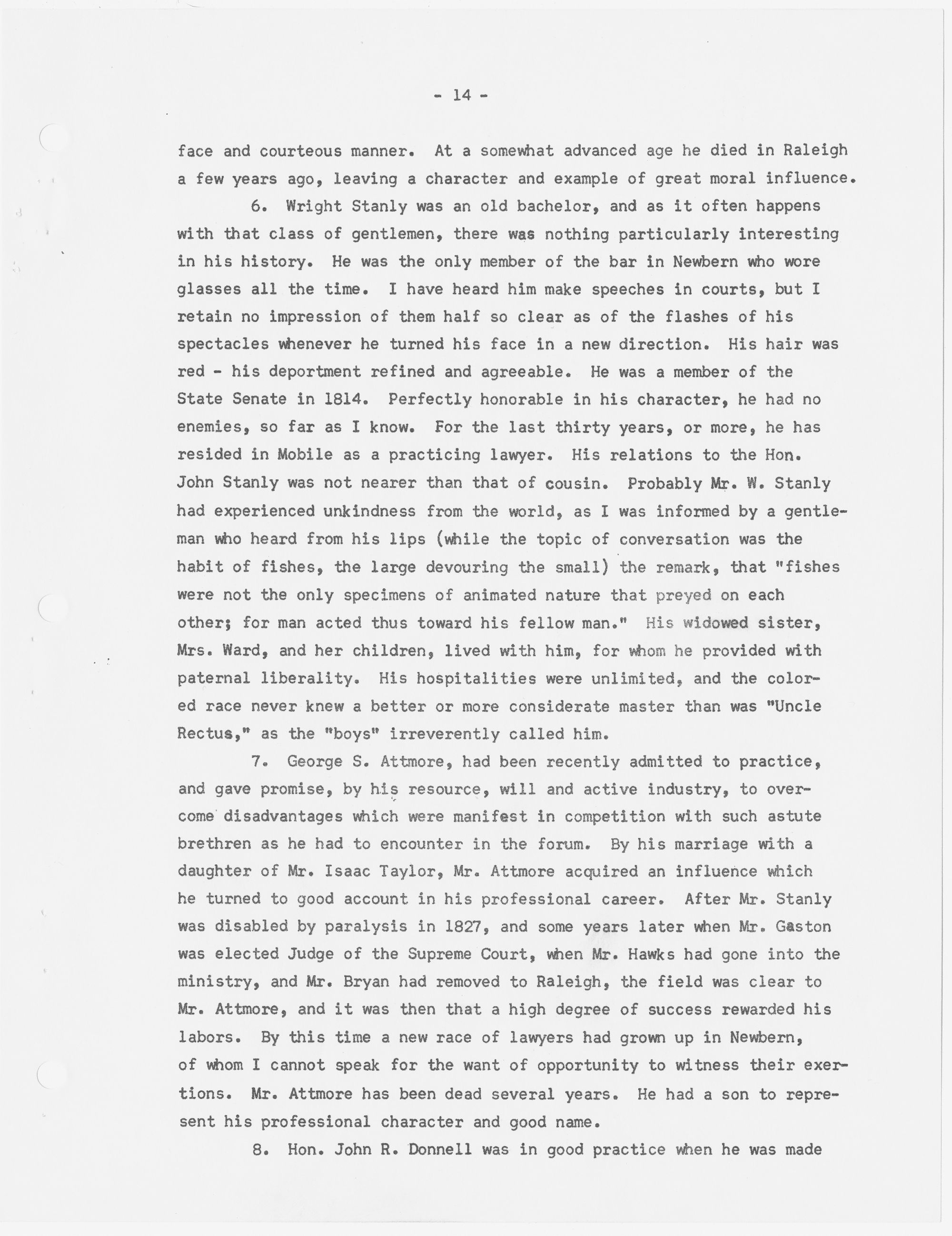 7. George S. Attmore, had been recently admitted to practice, and gave promise, by his resource, will and active industry, to overcome disadvantages which were manifest in competition with such astute brethren as he had to encounter in the forum. By his marriage with a daughter of Mr. Isaac Taylor, Mr. Attmore acquired an influence which he turned to good account in his professional career. After Mr. Stanly was disabled by paralysis in 1827, and some years later when Mx. Gaston was elected Judge of the Supreme Court, when Mr. Hawks had gone into the ministry, and Mr. Bryan had removed to Raleigh, the field was clear to Mr. Attmore, and it was then that a high degree of success rewarded his labors. By this time a new race of lawyers had grown up in Newbern, of whom I cannot speak for the want of opportunity to witness their exertions. Mr. Attmore has been dead several years. He had a son to represent his professional character and good name.