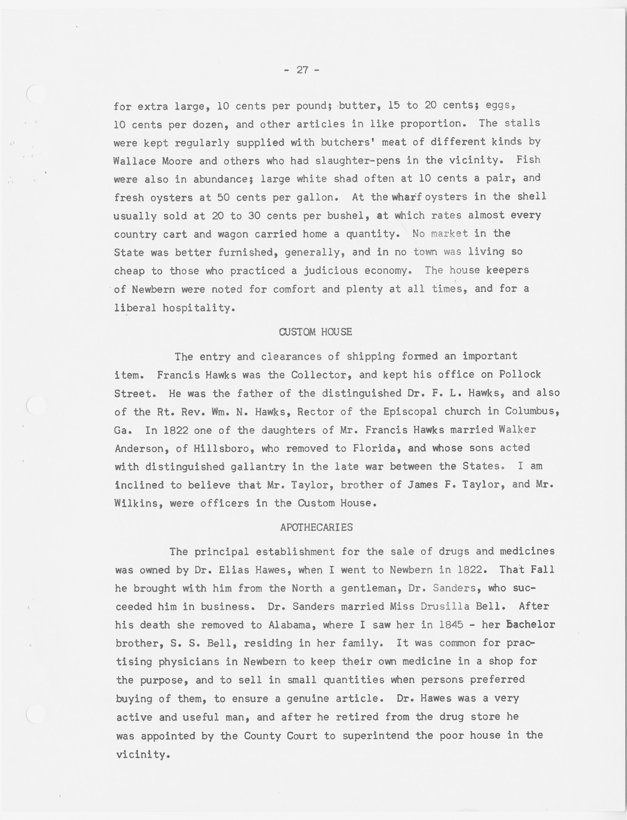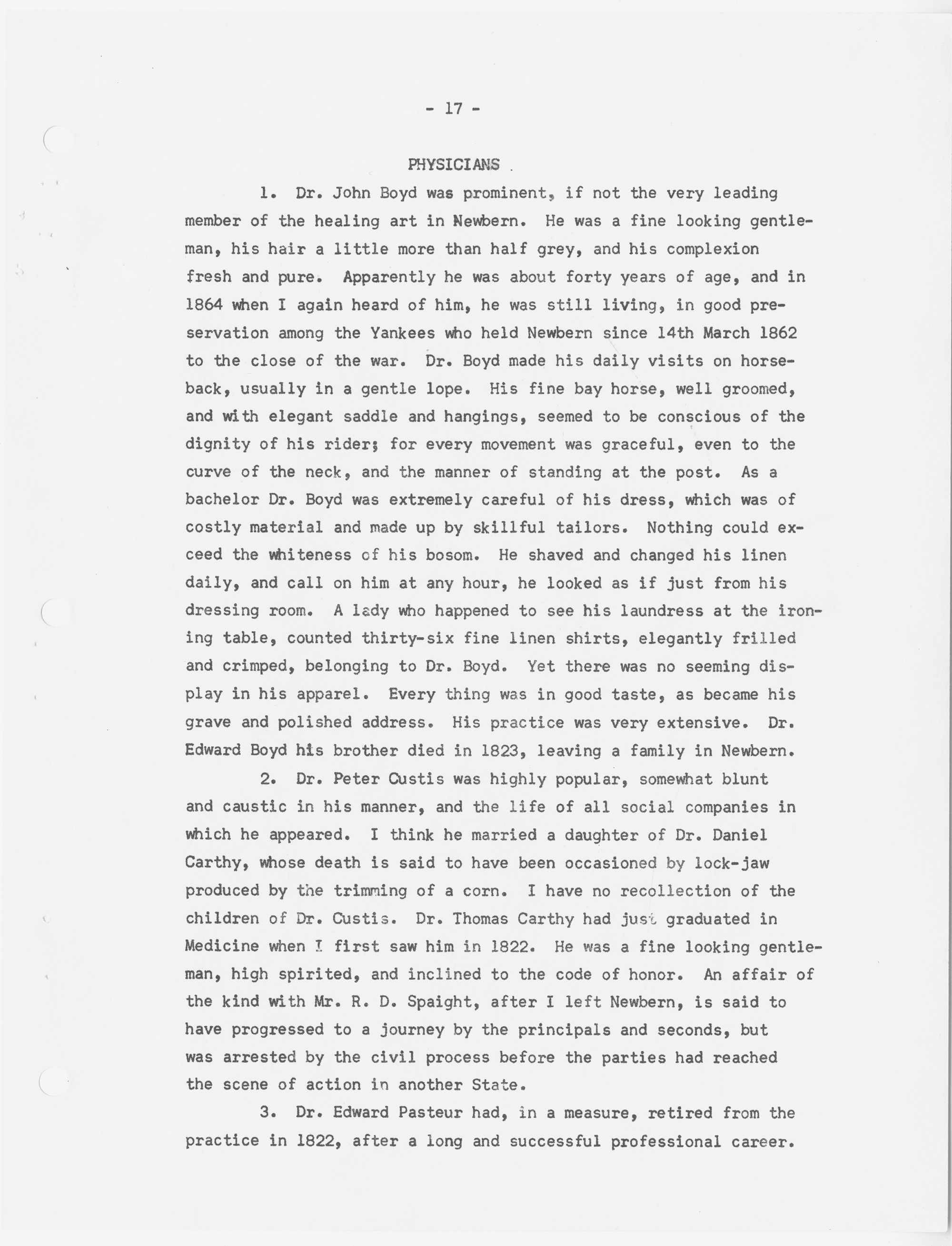 2. Dr. Peter Oustis was highly popular, somewhat blunt and caustic in his manner, and the life of all social companies in which he appeared. I think he married a daughter of Dr. Daniel Carthy, whose death is said to have been occasioned by lock-jaw produced by the trimming of a corn. I have no recollection of the children of Dr. Oustis. Dr. Thomas Carthy had just graduated in Medicine when T first saw him in 1822. He was a fine looking gentleman, high spirited, and inclined to the code of honor. An affair of the kind with Mr. R. D. Spaight, after I left Newbern, is said to have progressed to a journey by the principals and seconds, but was arrested by the civil process before the parties had reached the scene of action in another State.
