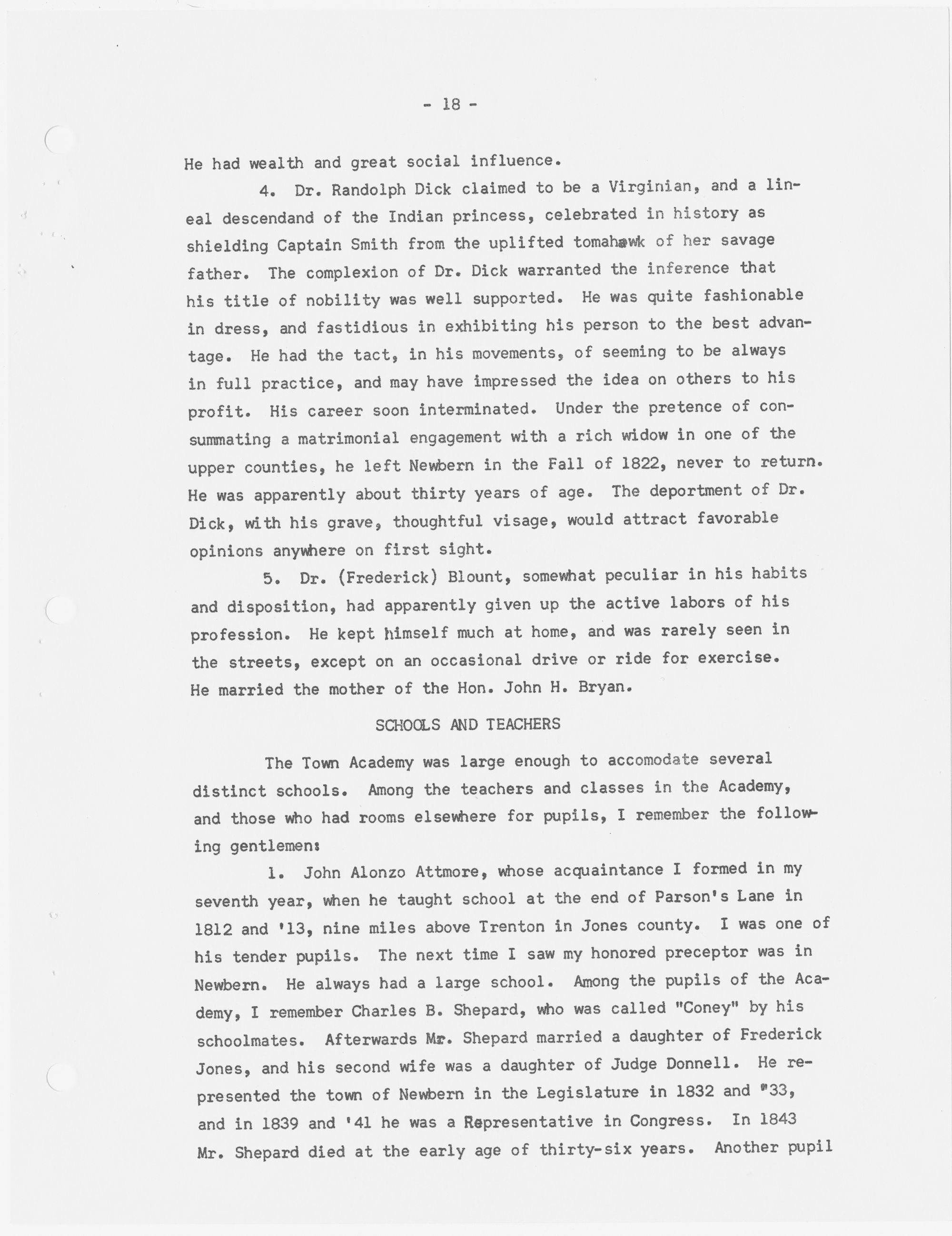 1. John Alonzo Attmore, whose acquaintance I formed in my seventh year, when he taught school at the end of Parson's Lane in 1812 and '13, nine miles above Trenton in Jones county. I was one of his tender pupils. The next time I saw my honored preceptor was in Newbern. He always had a large school. Among the pupils of the Academy, I remember Charles B. Shepard, who was called .Coney. by his schoolmates. Afterwards Mr. Shepard married a daughter of Frederick Jones, and his second wife was a daughter of Judge Donnell. He re-presented the town of Newbern in the Legislature in 1832 and .33, and in 1839 and '41 he was a Representative in Congress. In 1843 Mr. Shepard died at the early age of thirty-six years. Another pupil