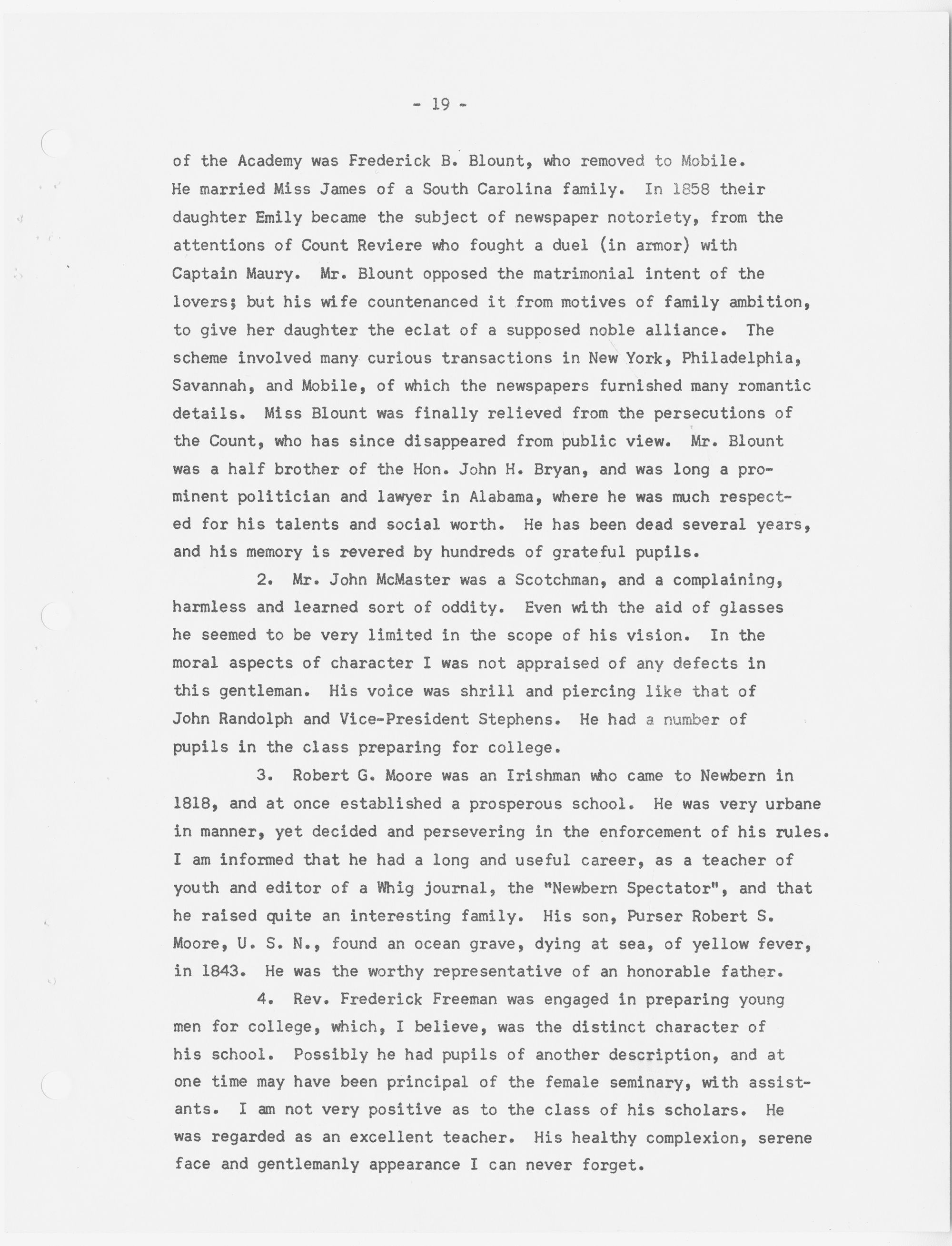 3. Robert G. Moore was an Irishman who came to Newbern in 1818, and at once established a prosperous school. He was very urbane in manner, yet decided and persevering in the enforcement of his rules. I an informed that he had a long and useful career, as a teacher of youth and editor of a Whig journal, the .Newbern Spectator., and that he raised quite an interesting family. His son, Purser Robert S. Moore, U. S. N., found an ocean grave, dying at sea, of yellow fever, in 1843. He was the worthy representative of an honorable father.