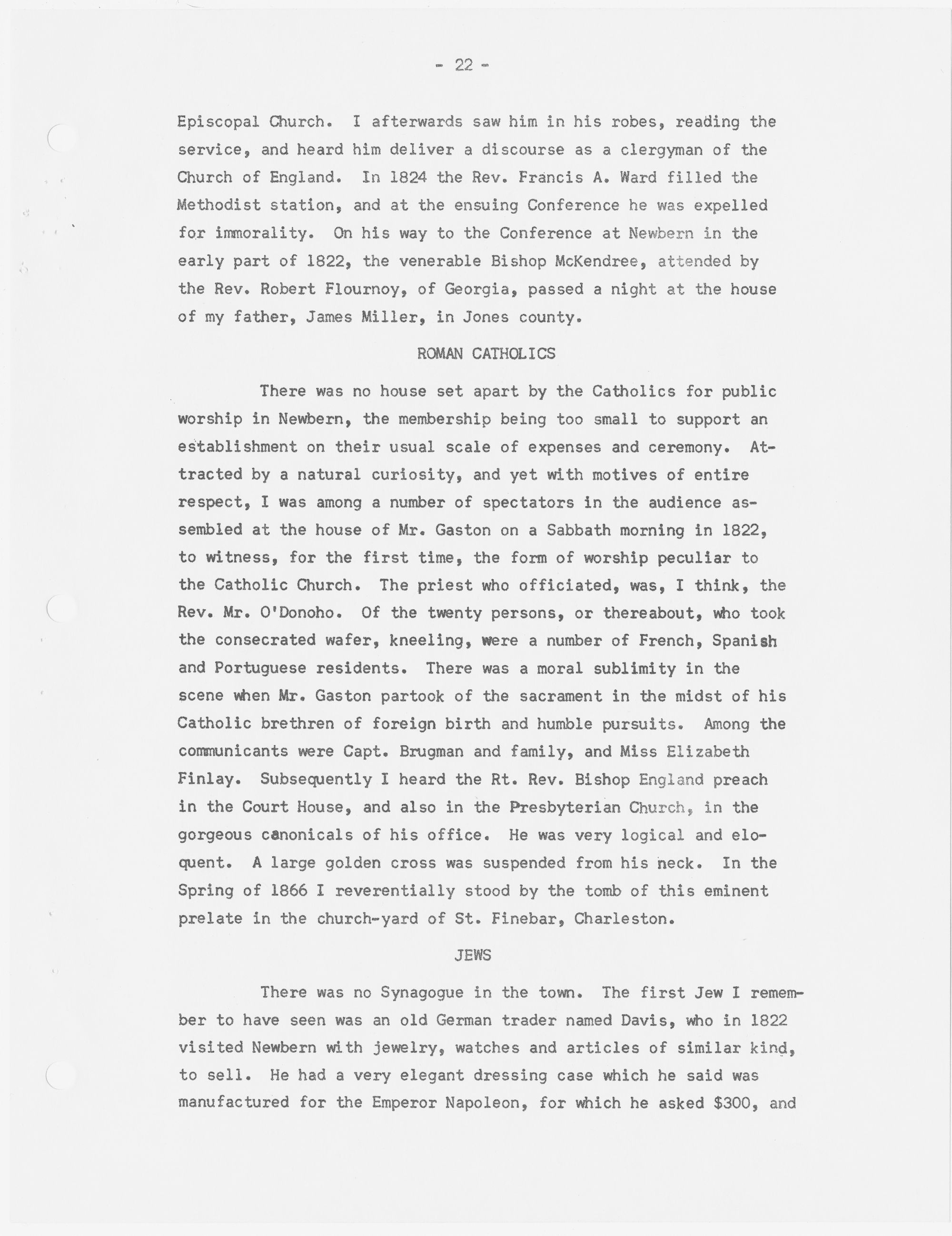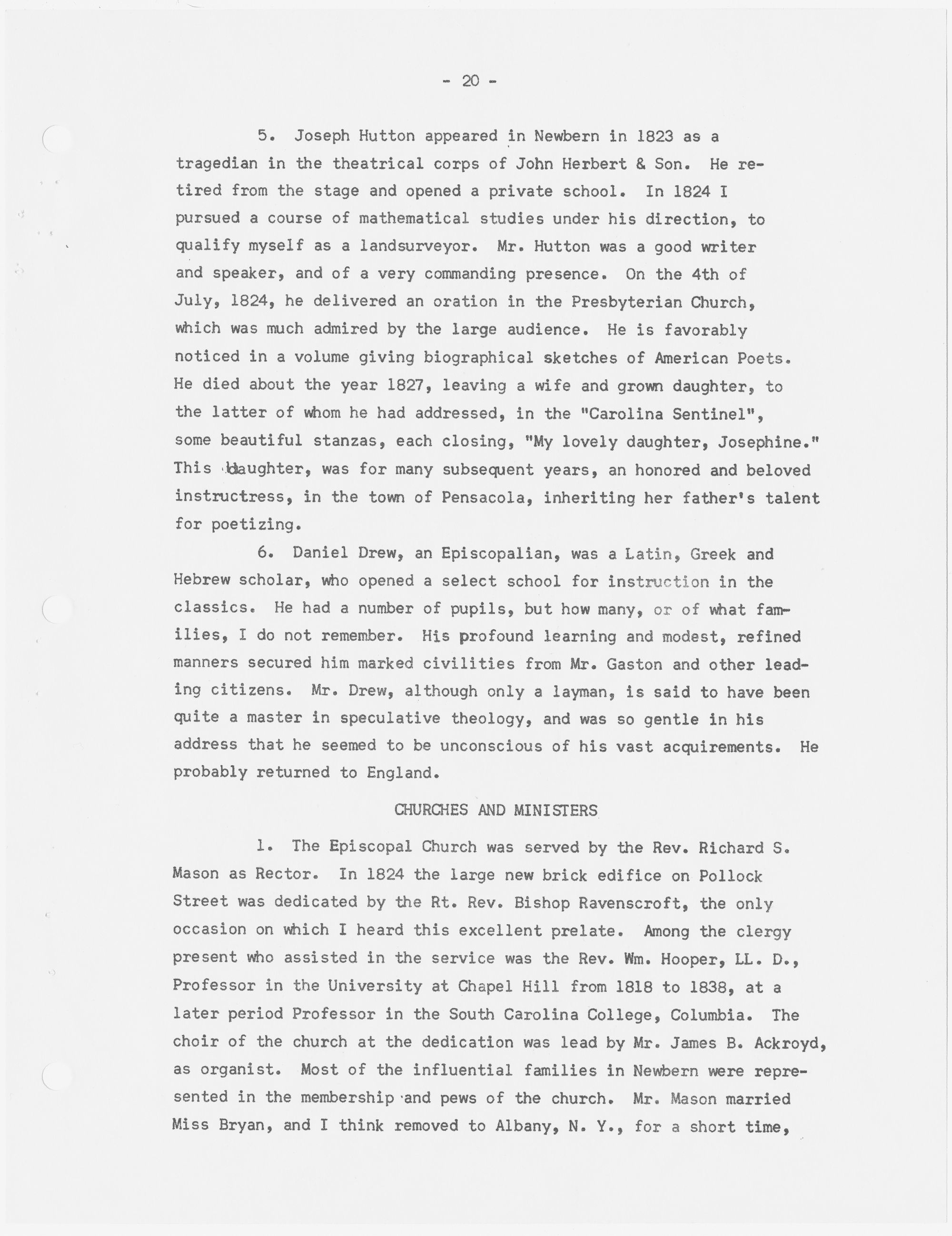 1. The Episcopal Church was served by the Rev. Richard S. Mason as Rector. In 1824 the large new brick edifice on Pollock Street was dedicated by the Rt. Rev. Bishop Ravenscroft, the only occasion on which I heard this excellent prelate. Among the clergy present who assisted in the service was the Rev. Ms. Hooper, LL. D., Professor in the University at Chapel Hill from 1818 to 1838, at a later period Professor in the South Carolina College, Columbia. The choir of the church at the dedication was lead by Mr. James B. Ackroyd, as organist. Most of the influential families in Newborn were represented in the membership and pews of the church. Mr. Mason married Miss Bryan, and I think removed to Albany, N. Y., for a short time,