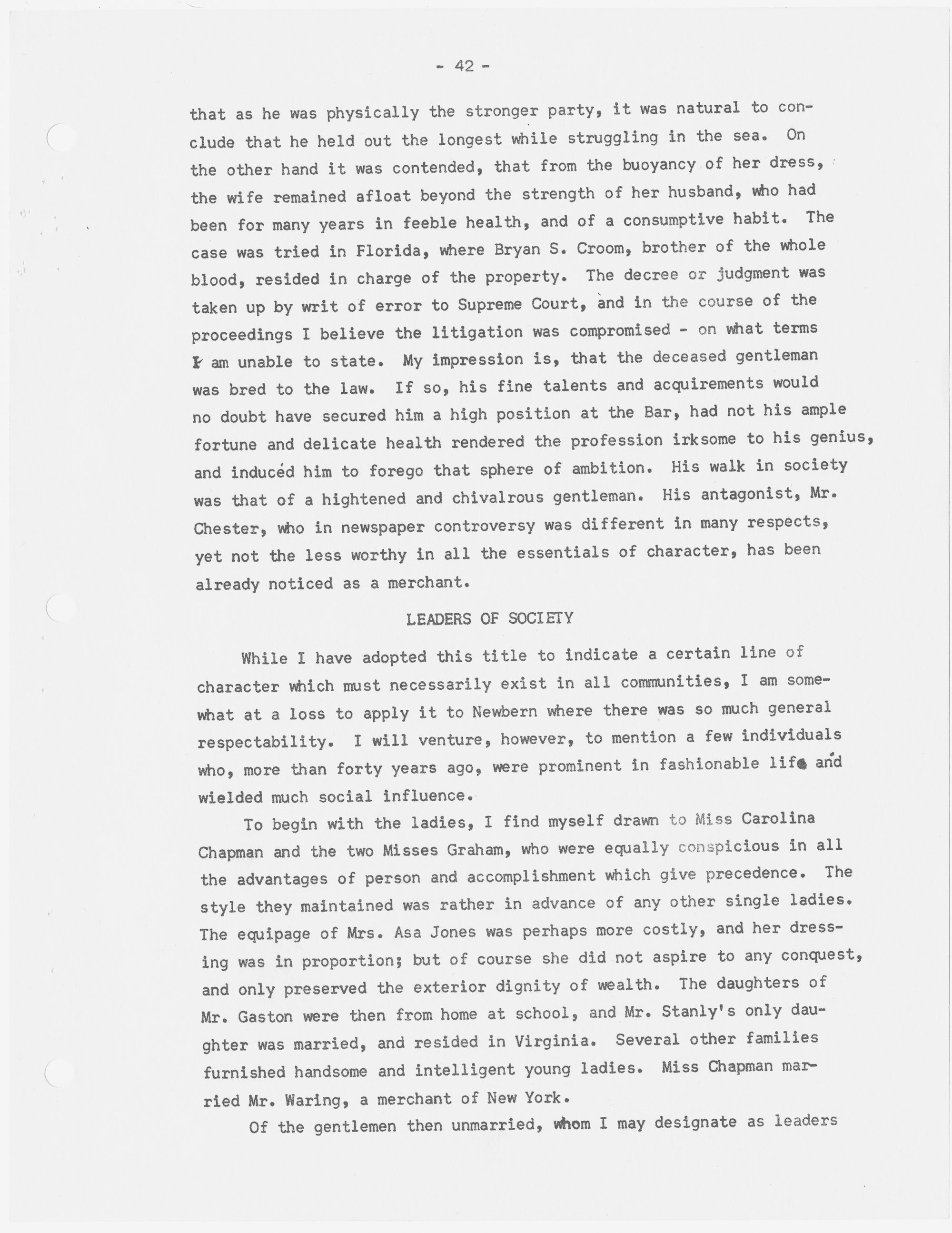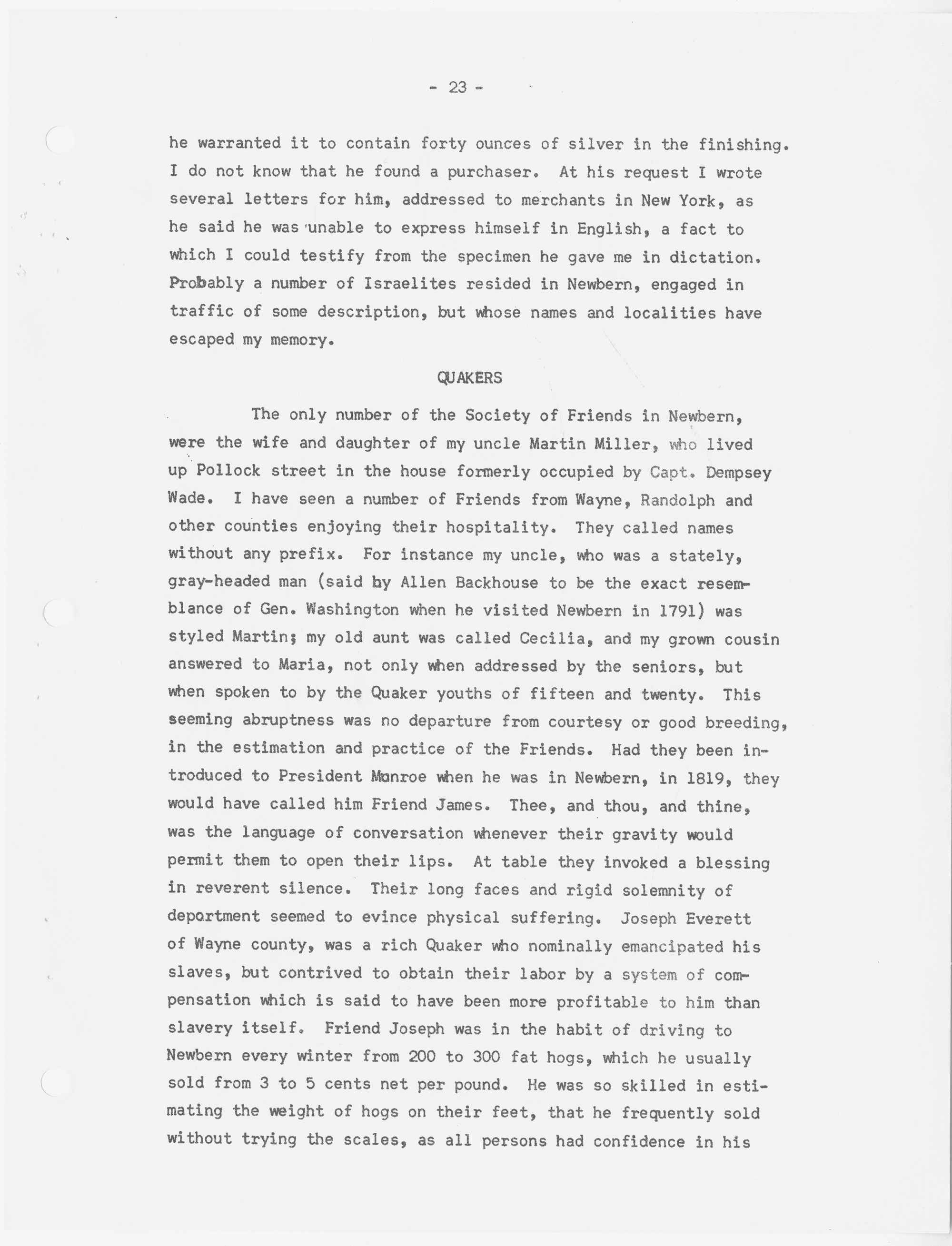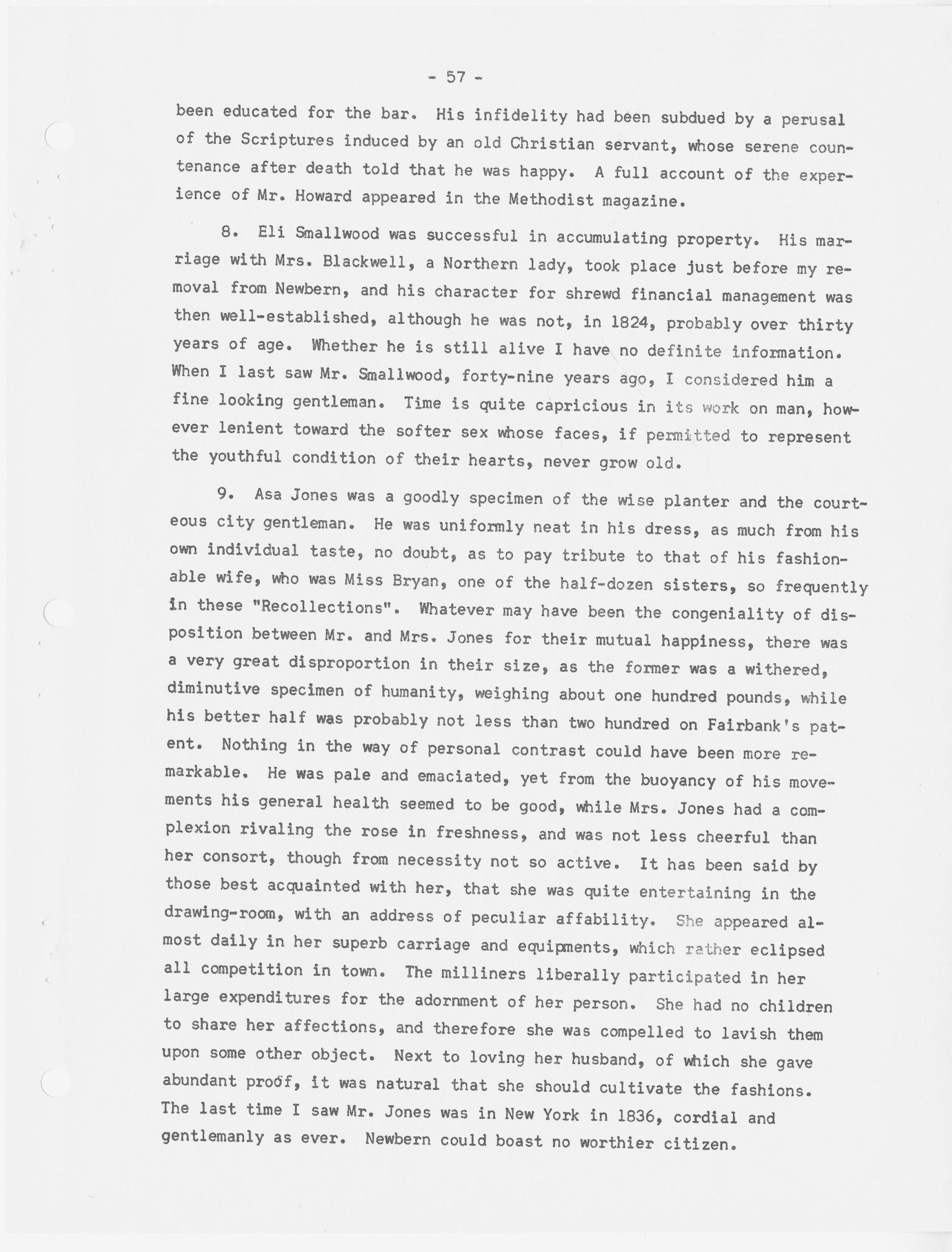 8. Eli Smallwood was successful in accumulating property. His marriage with Mrs. Blackwell, a Northern lady, took place just before m, removal from Newbern, and his character for shrewd financial management was then well-established, although he was not, in 1824, probably over thirty years of age. Whether he is still alive I have no definite information. When I last saw Mr. Smallwood, forty-nine years ago, I considered his a fine looking gentleman. Time is quite capricious in its work on man, how ever lenient toward the softer sex whose faces, if permitted to represent the youthful condition of their hearts, never grow old.
