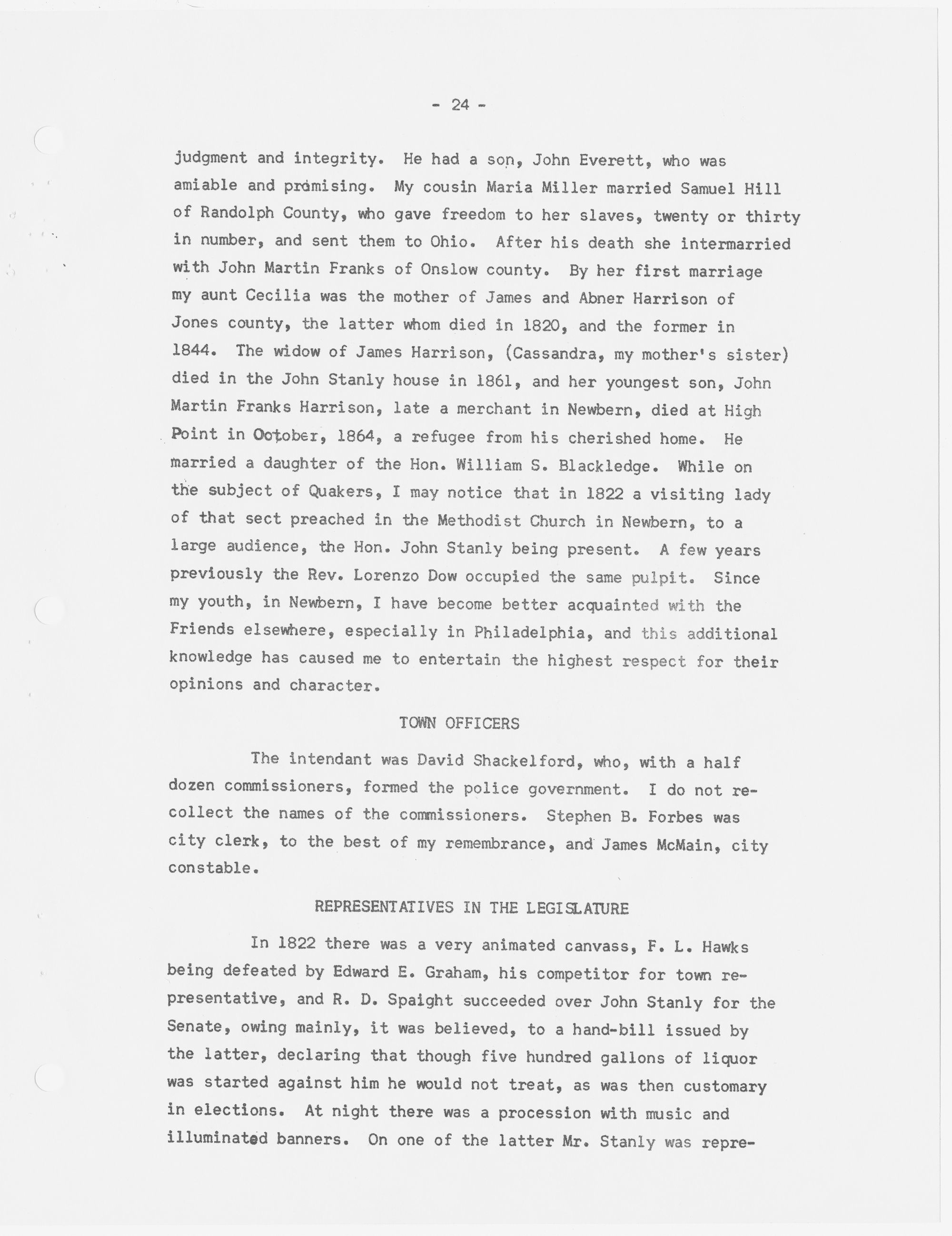 I have seen Messrs. Stanly, Gaston, Hawks, Spaight, E. E. Graham and other candidates paying special civilities to the colored voters; nothing, however, to the extent of undue familiarity. The most prominent free persons of color in Newbern wore: