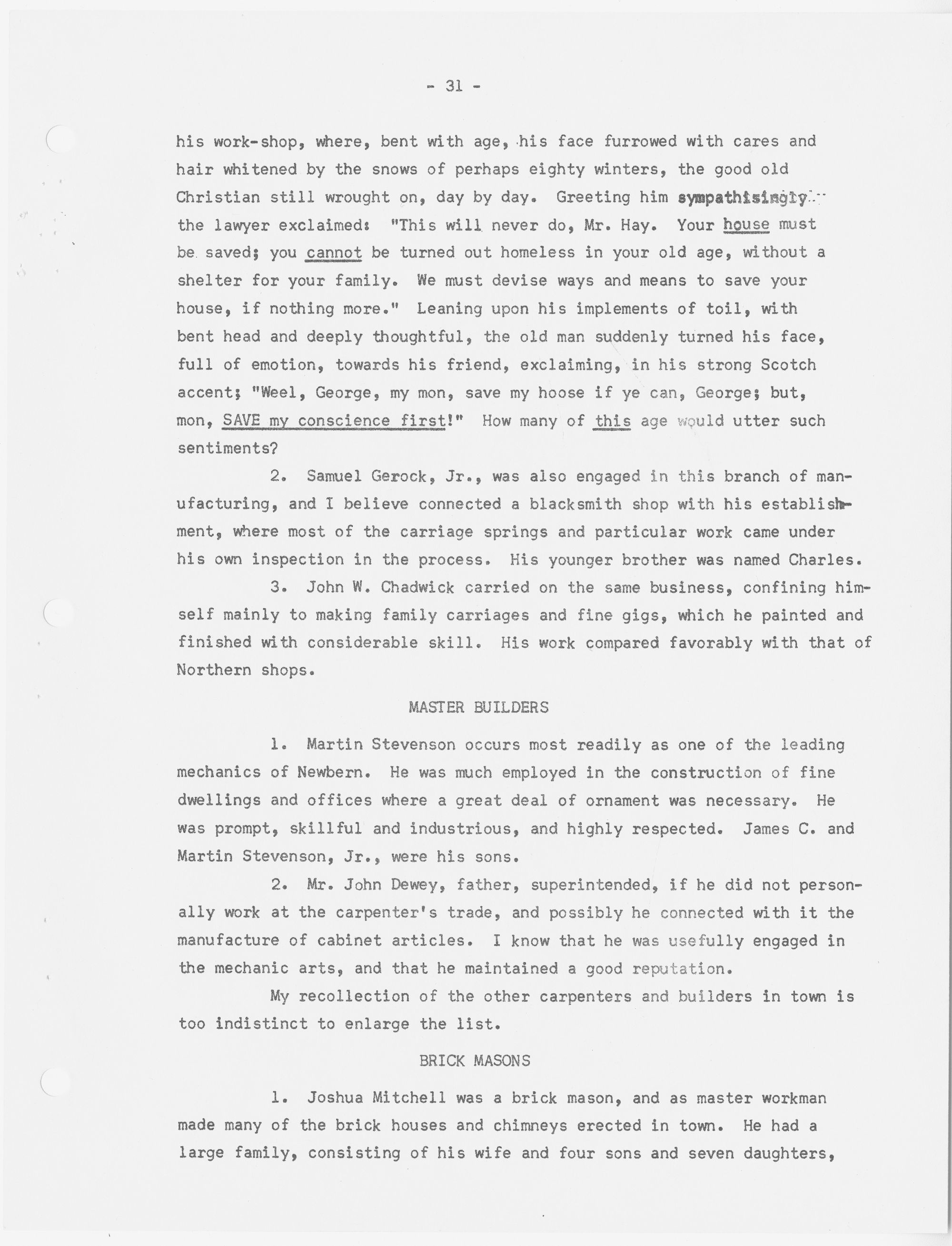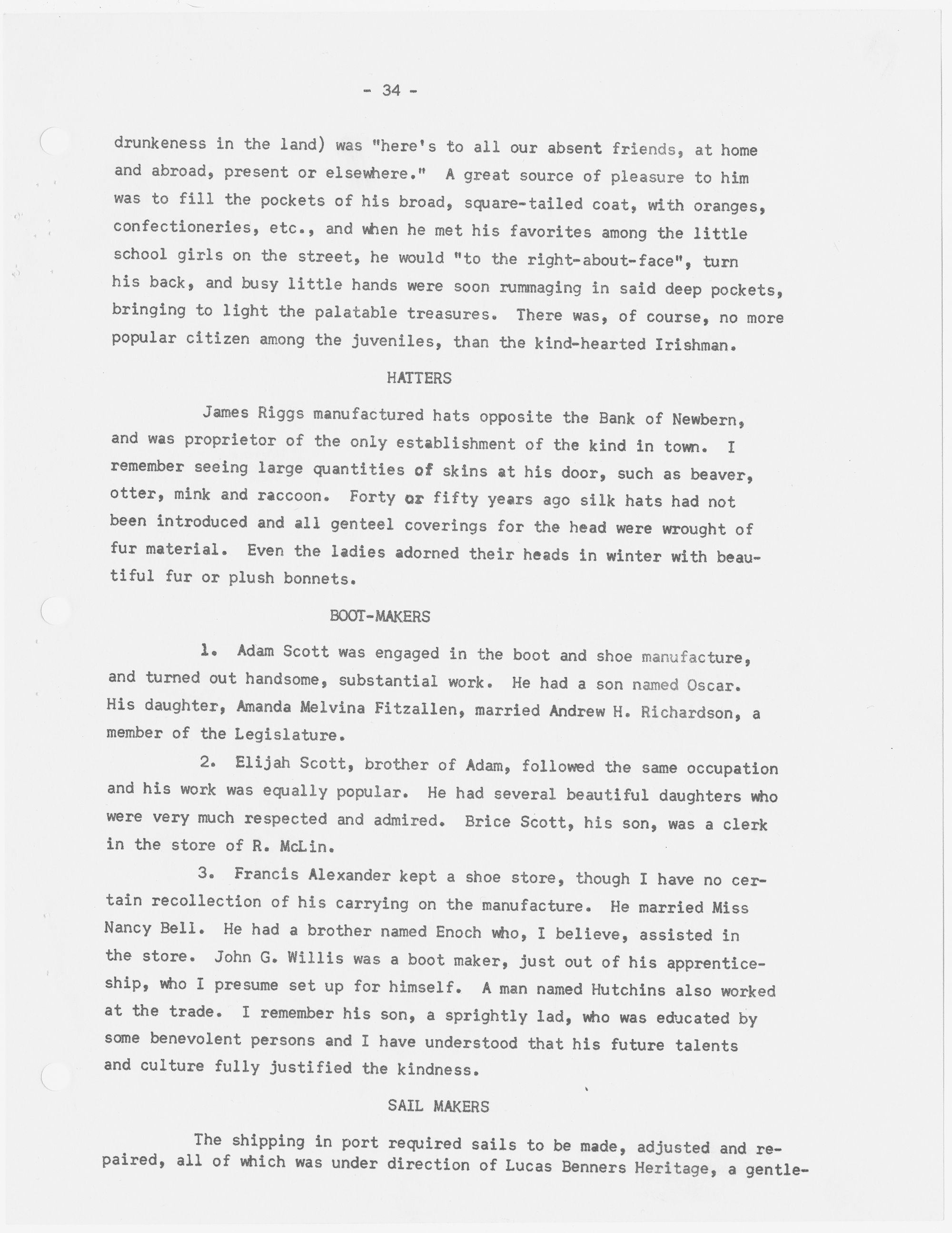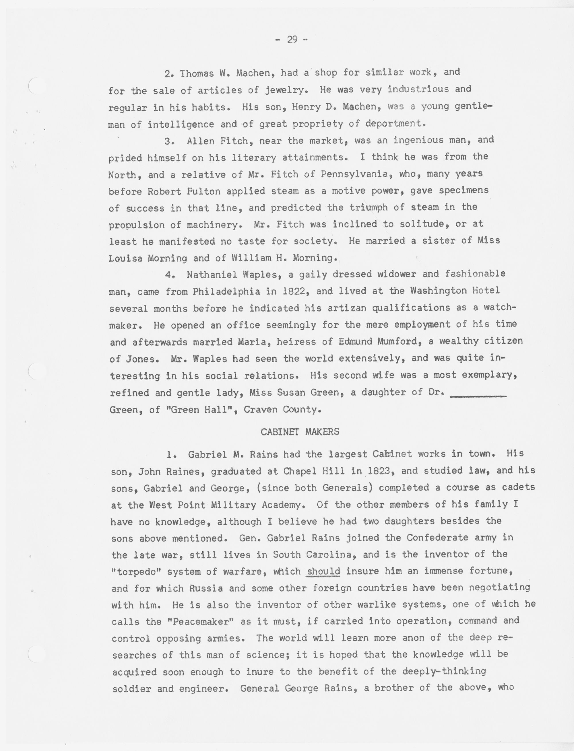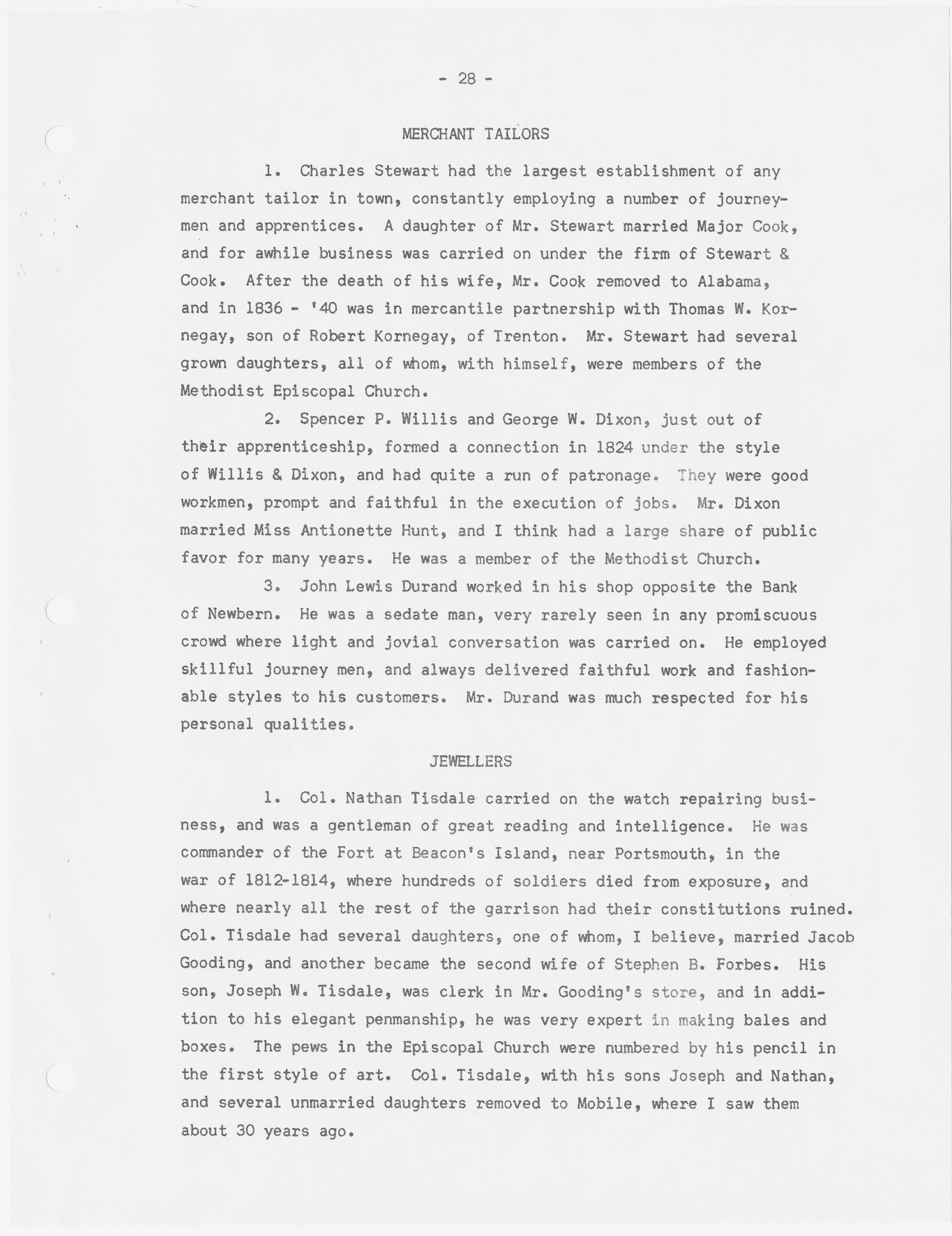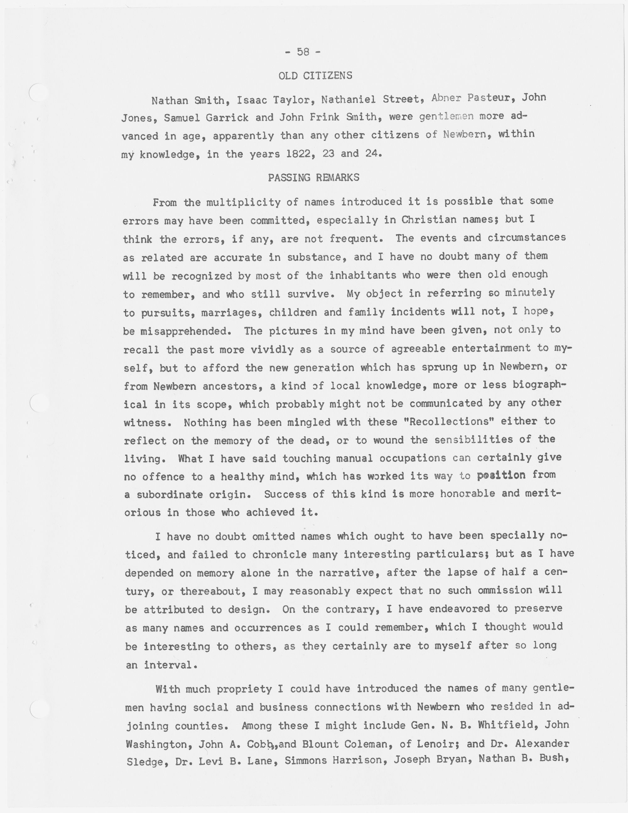From the multiplicity of names introduced it is possible that some errors may have been committed, especially in Christian names; but I think the errors, if any, are not frequent. The events and circumstances as related are accurate in substance, and I have no doubt many of them will be recognized by most of the inhabitants who were then old enough to remember, and who still survive. My object in referring so minutely to pursuits, marriages, children and family incidents will not, I hope, be misapprehended. The pictures in my mind have been given, not only to recall the past more vividly as a source of agreeable entertainment to my-self, but to afford the new generation which has sprung up in Newbern, or from Newborn ancestors, a kind of local knowledge, more or less biographical in its scope, which probably might not be communicated by any other witness. Nothing has been mingled with these "Recollections" either to reflect on the memory of the dead, or to wound the sensibilities of the living. What I have said touching manual occupations can certainly give no offence to a healthy mind, which has worked its way to position from a subordinate origin. Success of this kind is more honorable and meritorious in those who achieved it.