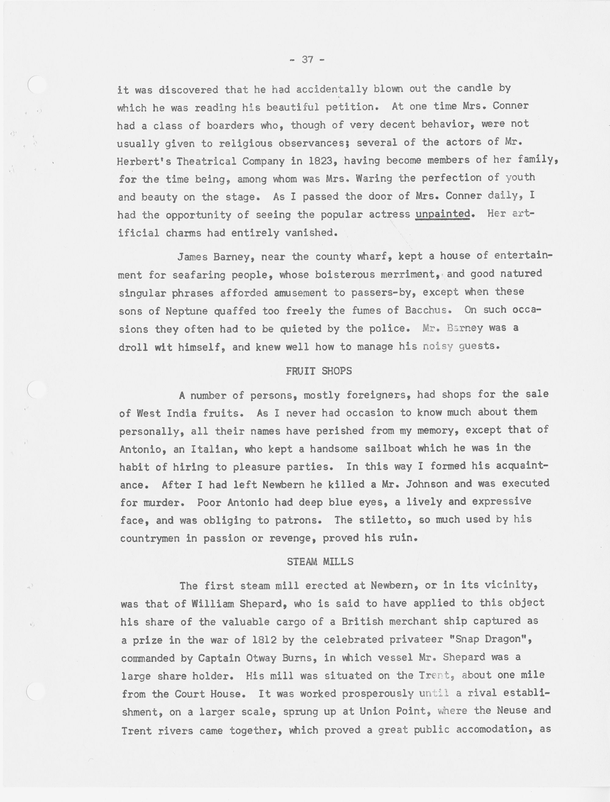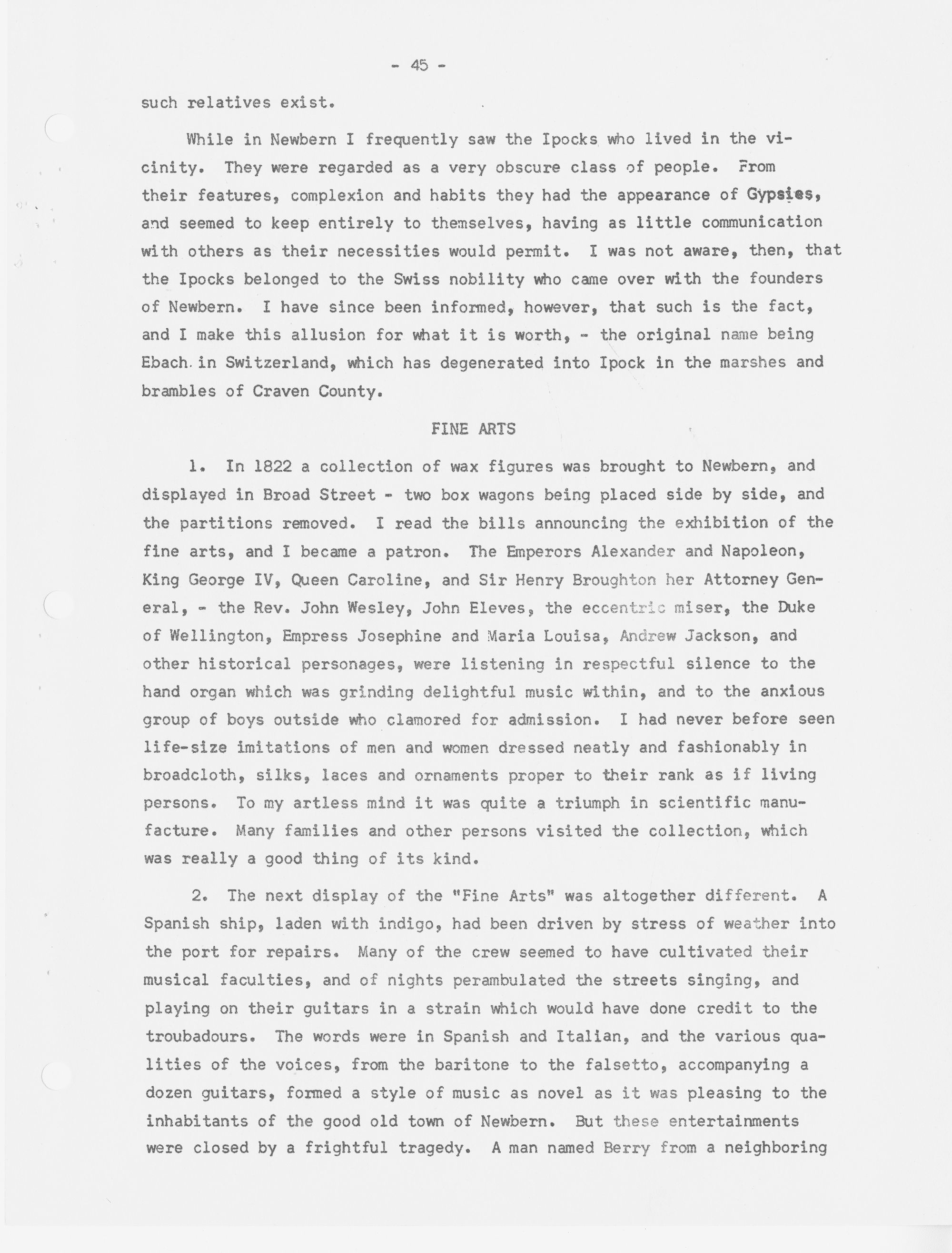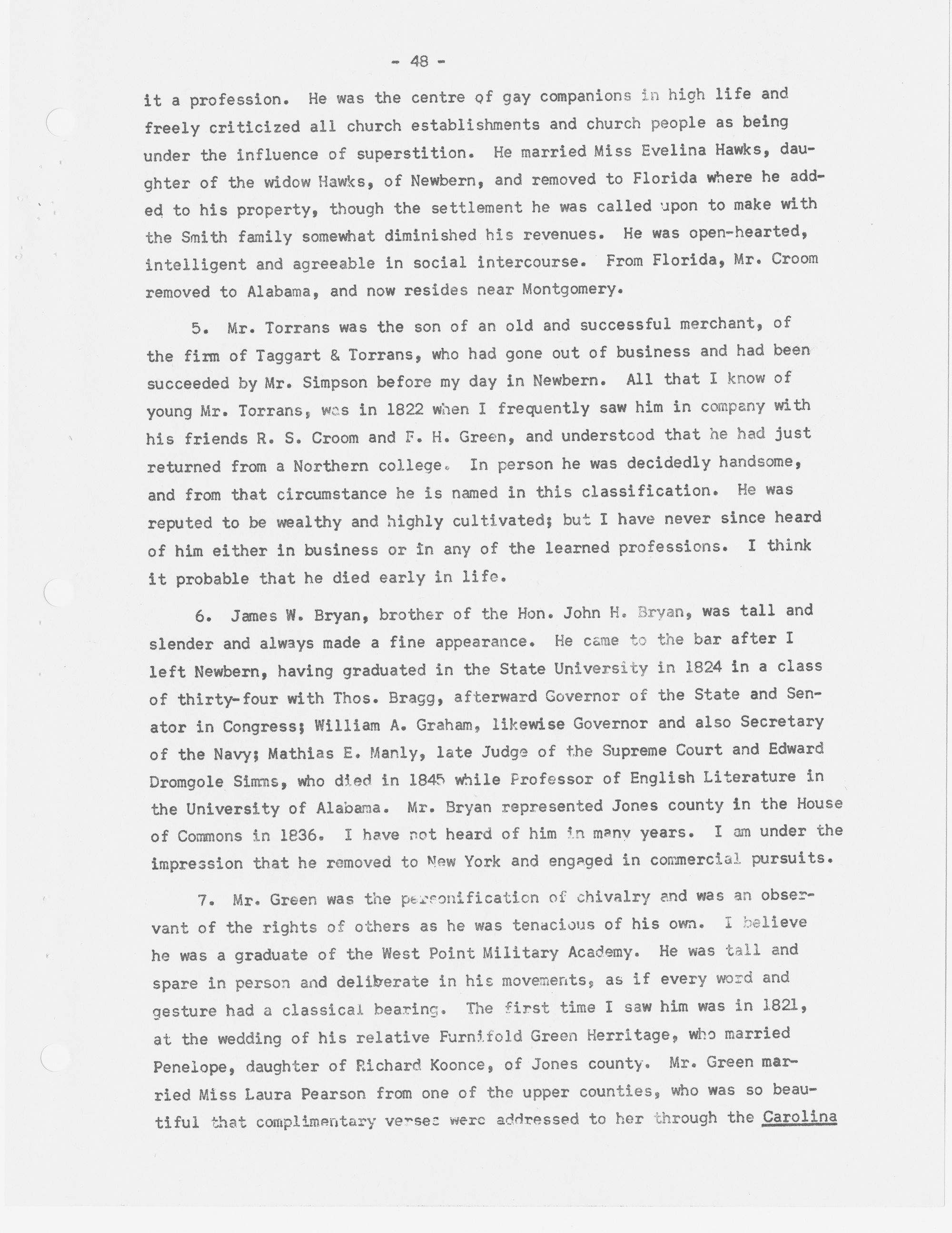 As an act of justice merely, I here mention James W. Carney and Thomas B. Carney, brothers, who ware clever and intelligent young gentlemen, but whose vocation I am unable to specify. They were excellent scribes, and well skilled in accounts and bookkeeping, and I believe they were employed in the Banks, or in some public office in Newbern. James Knight Green was likewise 8 pleasant young man, apparently well read, and blended in his manner something of the tragico-comico, if such an expression may be allowed to denote a very original and singular character.