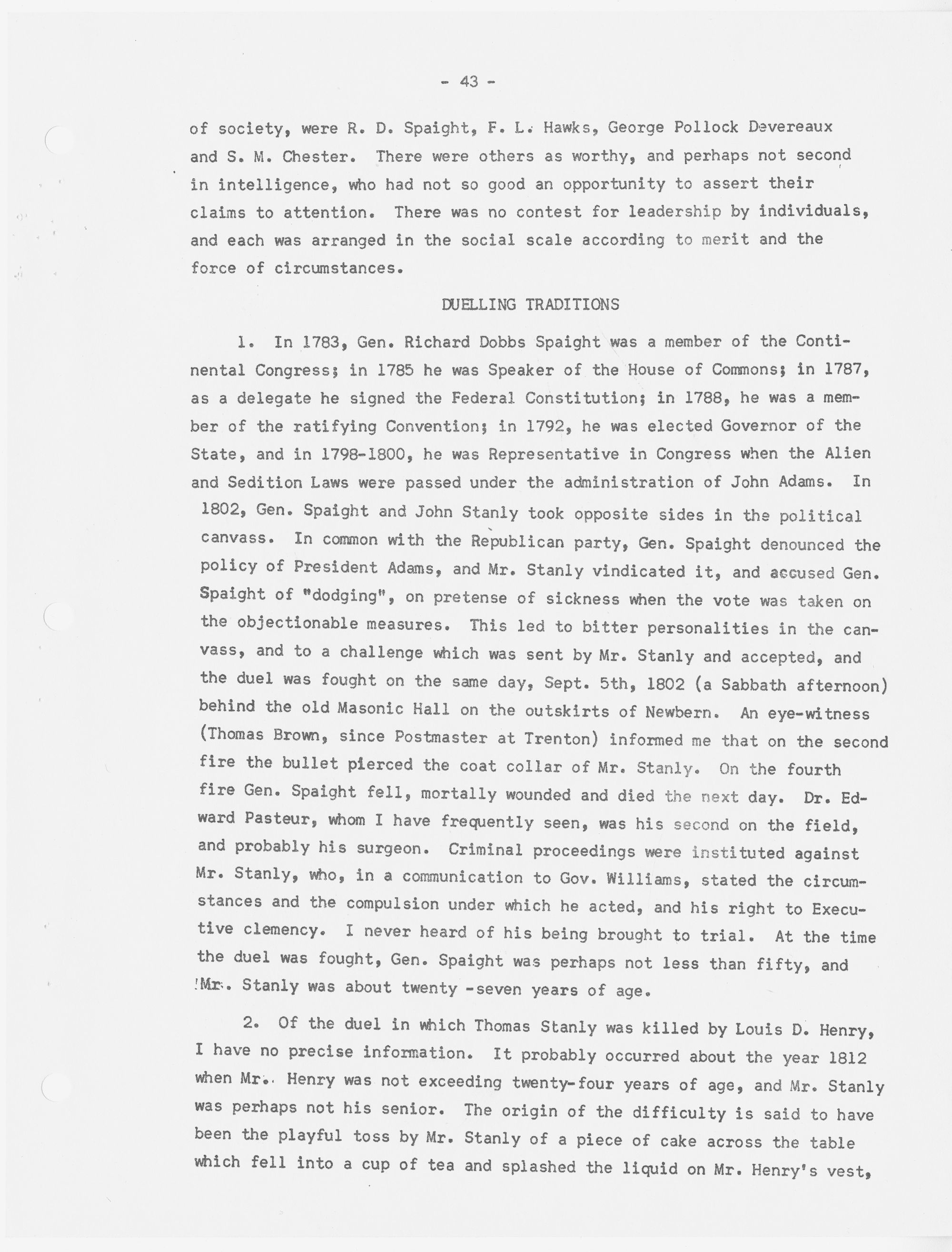 9. Richard D. Spaight held a commission to practice law, and I have seen him attending the Superior Court in Jones county as well as in Craven, but I never heard of his appearing in a case. He was very rich and very diffident, and was not destitute of fair abilities as a graduate of the University. His object in associating with the lawyers from county to county, was no doubt to enjoy their society, and to improve his mind by legal discussions which constantly took place in his presence. I always suspected that Mx. Stanly was an obstacle to the professional success of Mr. Spaight, as the former was a man of imperious temper, and, as if not satisfied with having killed the father of Mr. Spaight in a duel twenty years before, he seemed to delight in torturing the son by look and gesture and intonations of his voice, when other methods were