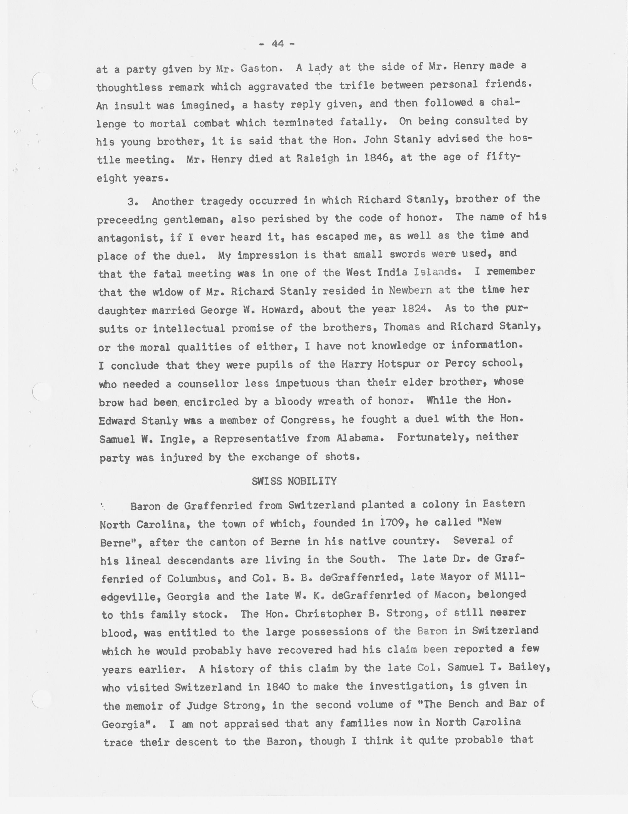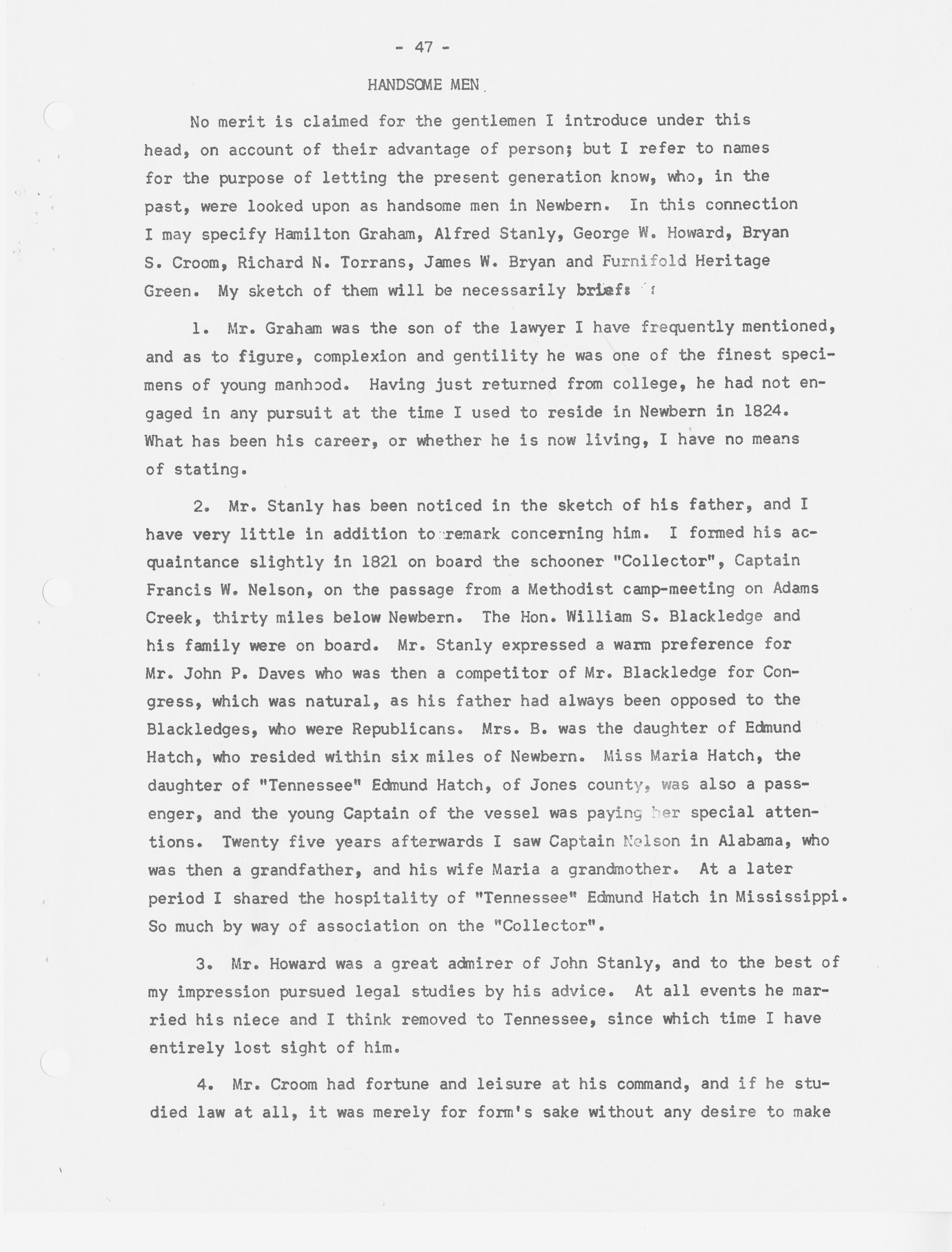 3. Edward Graham held a prominent rank et the bar, though when I knew him he had somewhat retired, and appeared only in important cases. I heard his but once in court, which was sufficient to convince no that he possessed a vigorous mind and great elevation of character. He was apparently the senior of both Mr. Stanly and Mr. Gaston, and earlier in life was often employed. I loved to hear these renowned jurists on intricate legal questions. Mr. Graham maintained a very fashionable style of living. One of his daughters married the Hon. William H. Haywood, of Raleigh, and another married John P. Doves, Esq., of Newbern. His son, Hamilton, will be noticed elsewhere. I do not remember the year in which Mr. Graham died, as I than resided in Georgia. He was the second of Mr. Stanly in his duel with Governor Spaight.