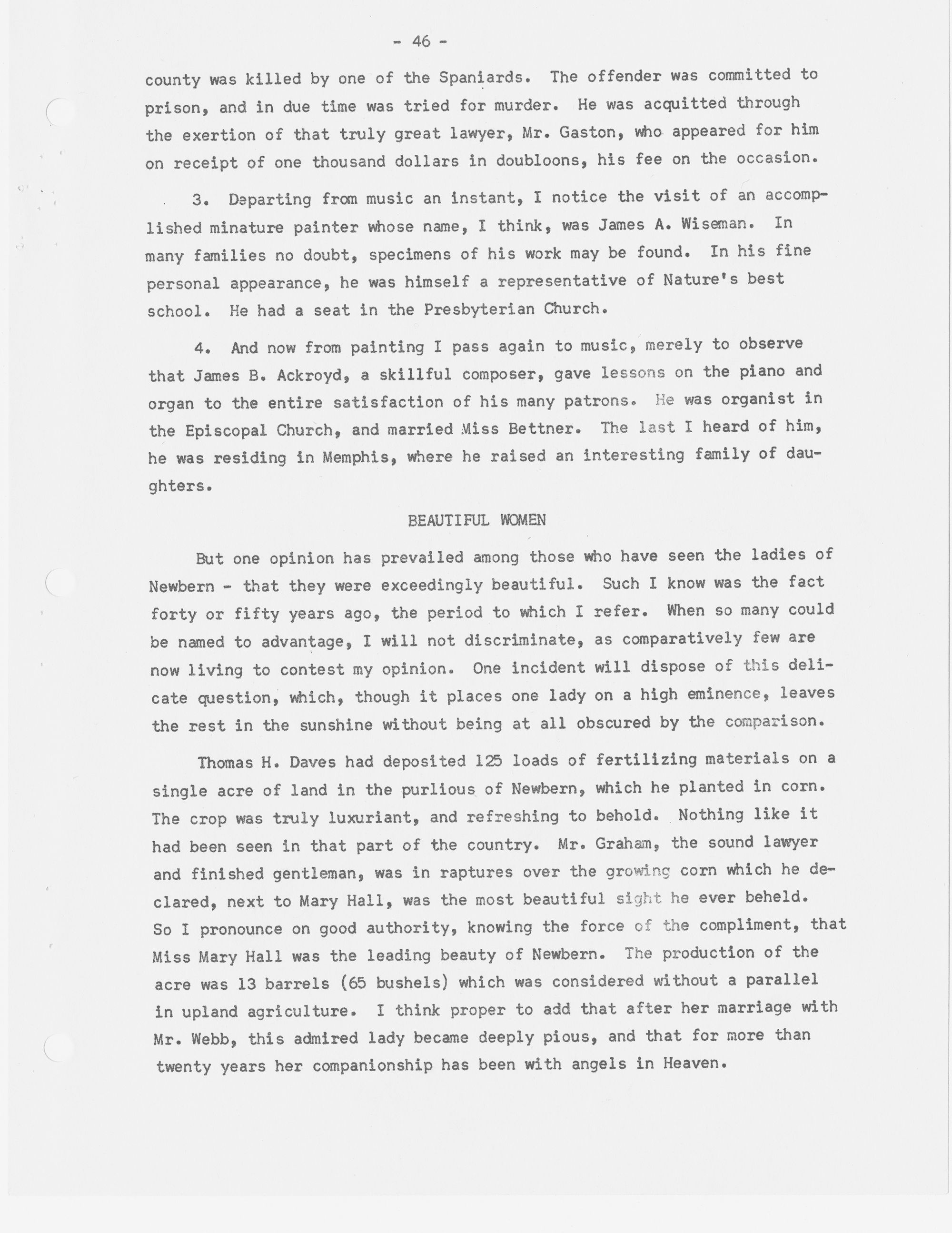 With much propriety I could have introduced the names of many gentlemen having social and business connections with Newborn who resided in adjoining counties. Among these I might include Gen. N. B. Whitfield, John Washington, John A. Cobb, and Blount Coleman, of Lenoir; and Dr. Alexander Sledge, Dr. Levi B. Lane, Simmons Harrison, Joseph Bryan, Nathan B. Bush,