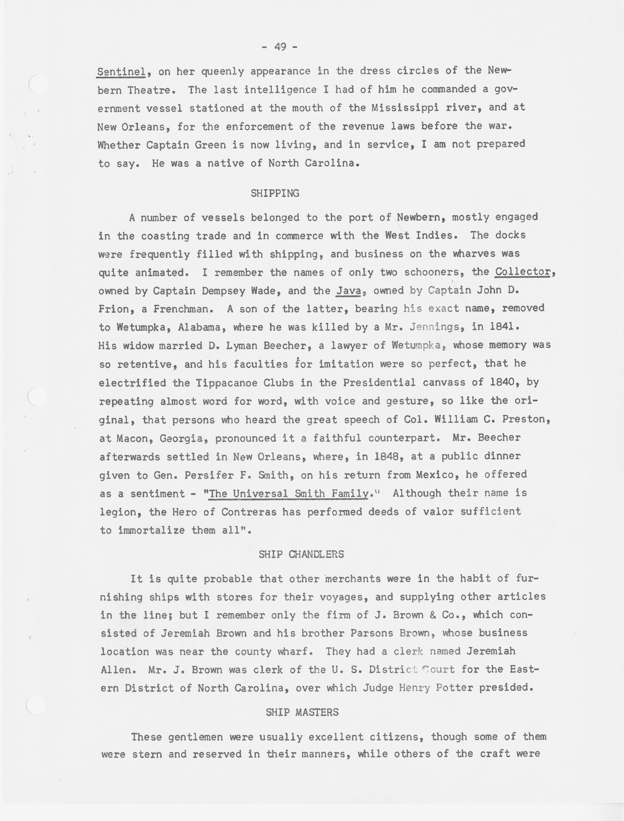 It is quite probable that other merchants were in the habit of furnishing ships with stores for their voyages, and supplying other articles in the line; but I remember only the firm of J. Brown & Co., which consisted of Jeremiah Brown and his brother Parsons Brown, whose business location was near the county wharf. They had a clerk named Jeremiah Allen. Mr. J. Brown was clerk of the U. S. District Court for the Eastern District of North Carolina, over which Judge Henry Potter presided.