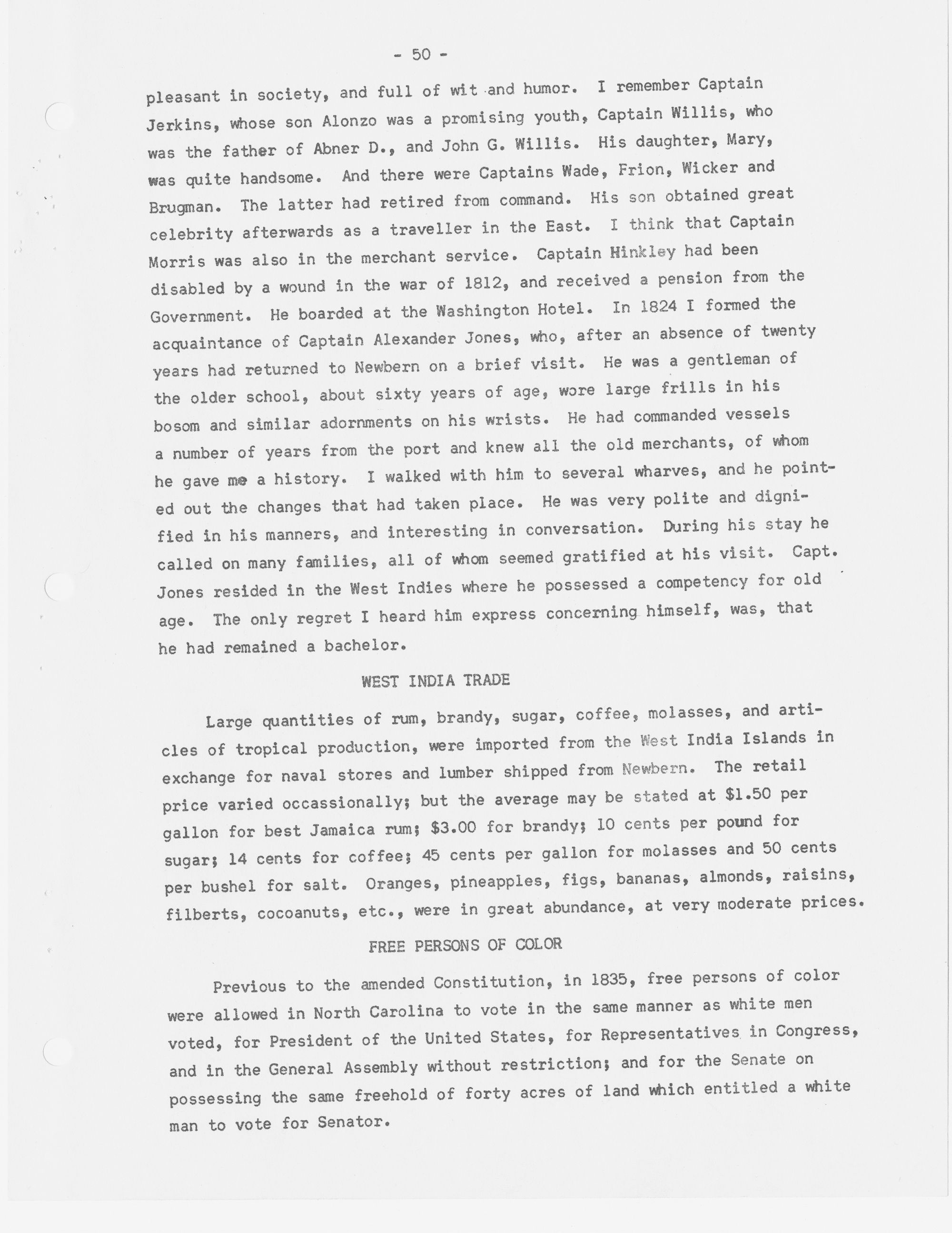 If you shall take the trouble to peruse this little sketch, you will find in it the names of several hundred citizens of Newbern, most of whom were personally known to you. After the lapse of fifty years the survivors are but few. I am gratified that you are among the number. Knowing your personal worth, and your high character as a merchant from my boyhood, I take great pleasure in inscribing these "Recollections" to you, with assurances of my profound esteem.