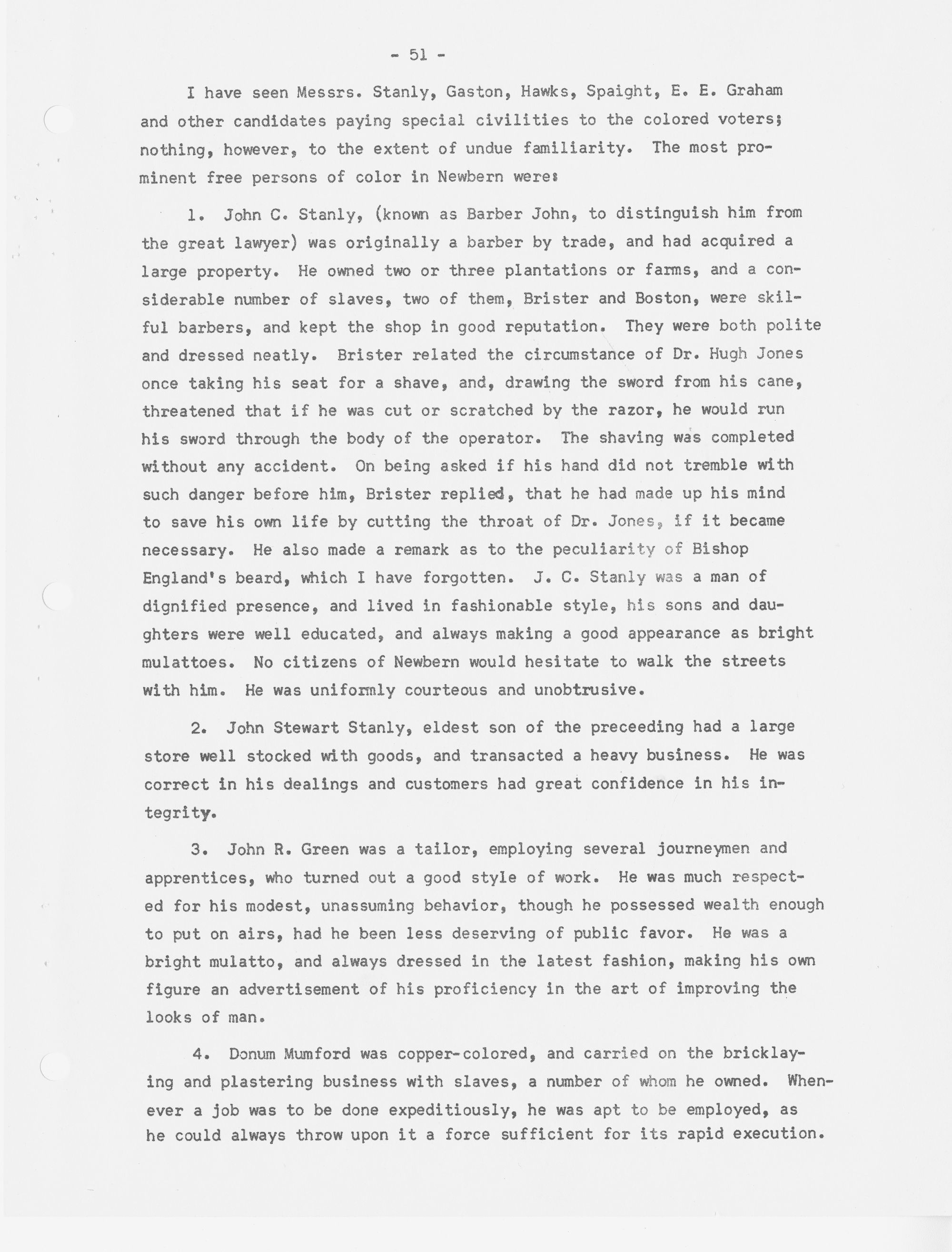 1. John C. Stanly, (known as Barber John, to distinguish him from the great lawyer) was originally a barber by trade, and had acquired a large property. He owned two or three plantations or farms, and a considerable number of slaves, two of them, Brister and Boston, were skilful barbers, and kept the shop in good reputation. They were both polite and dressed neatly. Brister related the circumstance of Dr. Hugh Jones once taking his seat for a shave, and, drawing the sword from his cane, threatened that if he was cut or scratched by the razor, he would run his sward through the body of the operator. The shaving was completed without any accident. On being asked if his hand did not tremble with such danger before him, Brister replied, that he had made up his mind to save his own life by cutting the throat of Dr. Jones, if it became necessary. He also made a remark as to the peculiarity of Bishop England's beard, which I have forgotten. J. C. Stanly was a man of dignified presence, and lived in fashionable style, his sons and daughters were well educated, and always making a good appearance as bright mulattoes. No citizens of Newbern would hesitate to walk the streets with him. He was uniformly courteous and unobtrusive.