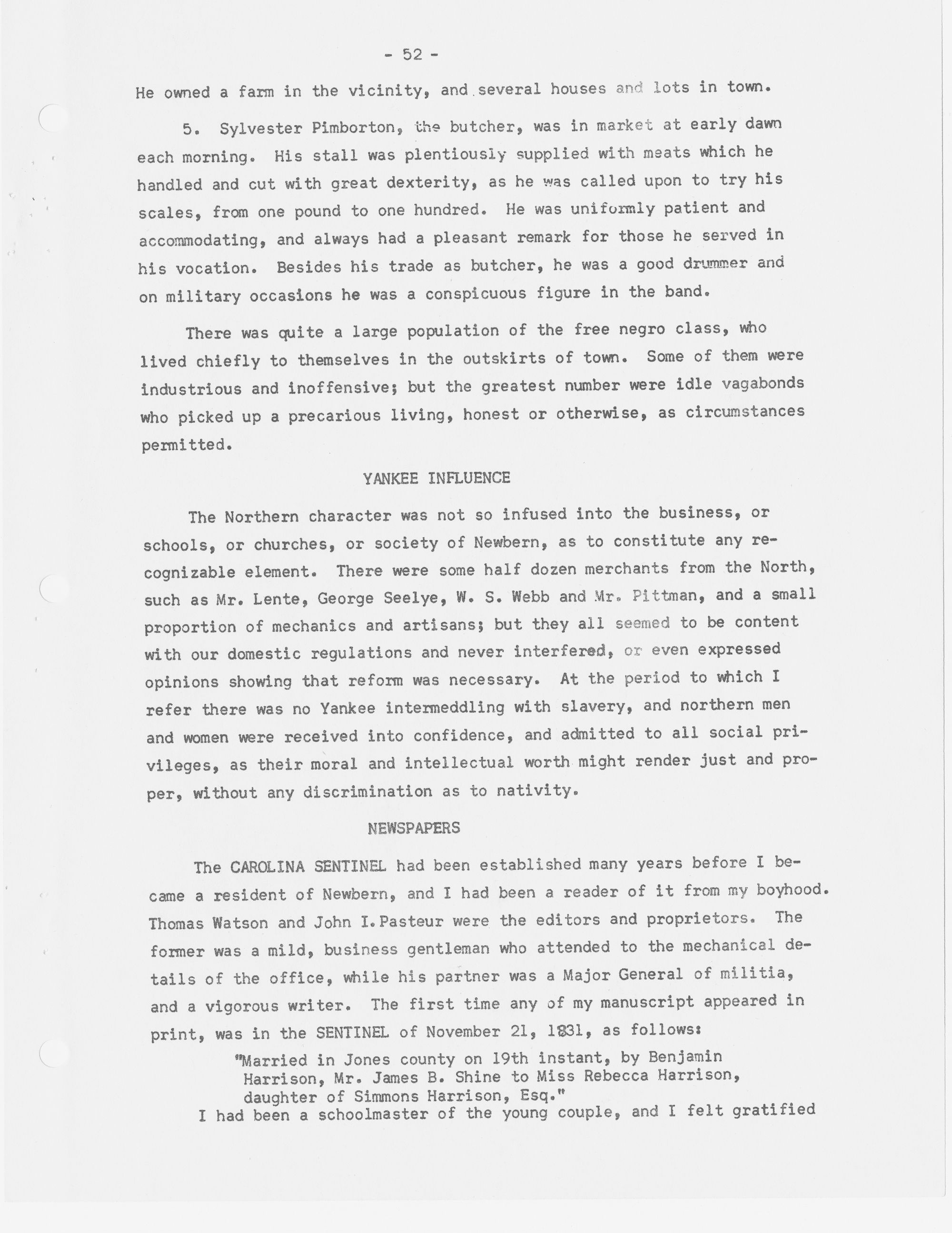 The Northern character was not so infused into the business, or schools, or churches, or society of Newbern, as to constitute any recognizable element. There were some half dozen merchants from the North, such as Mr. Lente, George Seelye, W. S. Webb and Mr. Pittman, and a small proportion of mechanics and artisans; but they all seemed to be content with our domestic regulations and never interfered, of even expressed opinions showing that reform was necessary. At the period to which I refer there was no Yankee intermeddling with slavery, and northern men and women were received into confidence, and admitted to all social privileges, as their moral and intellectual worth might render just and proper, without any discrimination as to nativity.