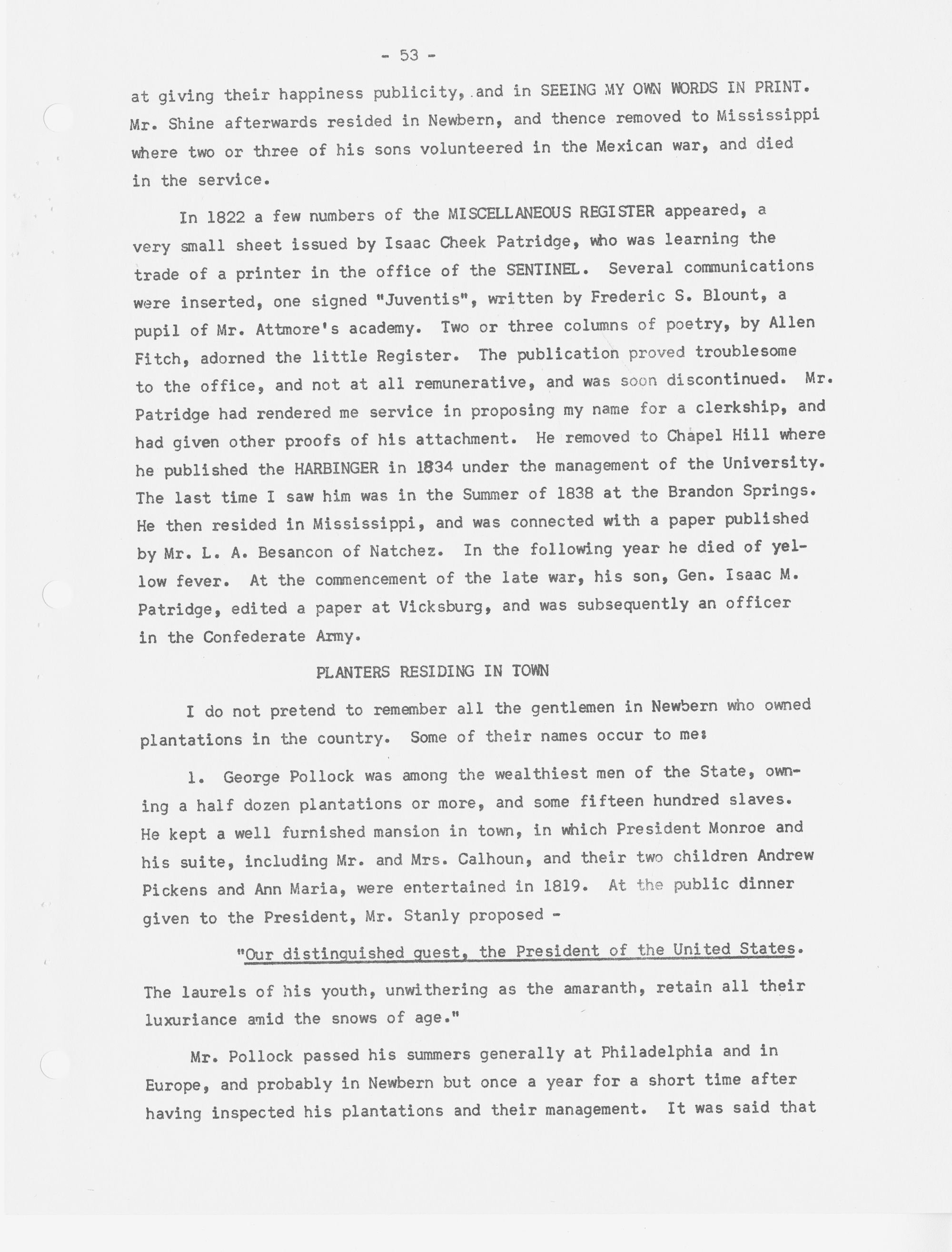 In 1822 a few numbers of the MISCELLANEOUS REGISTER appeared, a very small sheet issued by Isaac Cheek Patridge, who was learning the trade of a printer in the office of the SENTINEL. Several communications were inserted, one signed "Juventis", written by Frederic S. Blount, a pupil of Mr. Attmore's academy. Two or three columns of poetry, by Allen Fitch, adorned the little Register. The publication proved troublesome to the office, and not at all remunerative, and was soon discontinued. Mr. Patridge had rendered me service in proposing my name for a clerkship, and had given other proofs of his attachment. He removed to Chapel Hill where he published the HARBINGER in 1834 under the management of the University. The last time I saw him was in the Summer of 1838 at the Brandon Springs. He then resided in Mississippi, and was connected with a paper published by Mr. L. A. Besancon of Natchez. In the following year he died of yellow fever. At the commencement of the late war, his son, Gen. Isaac M. Patridge, edited a paper at Vicksburg, and was subsequently an officer in the Confederate Army.