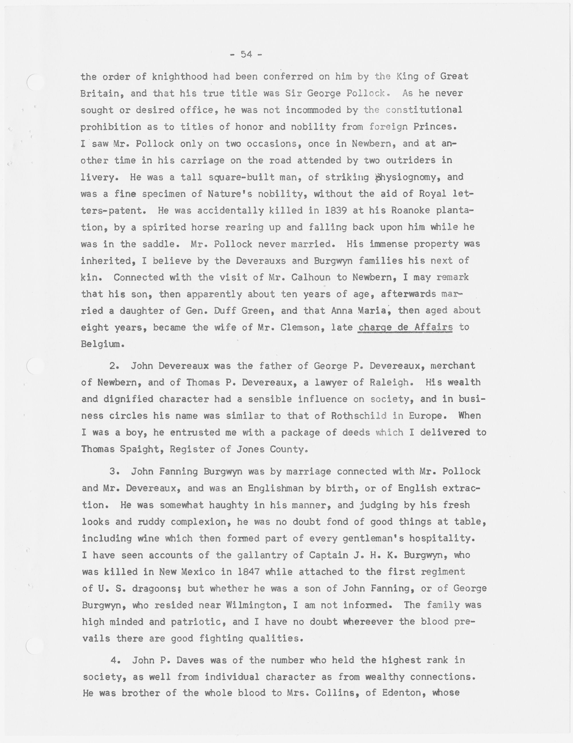 the order of knighthood had been conferred on him by the King of Great Britain, and that his true title was Sir George Pollock. As he never sought or desired office, he was not incommoded by the constitutional prohibition as to titles of honor and nobility from foreign Princes. I saw Mr. Pollock only on two occasions, once in Newbern, and at another time in his carriage on the road attended by two outriders in livery. He was a tall square-built man, of striking physiognomy, and was a fine specimen of Nature's nobility, without the aid of Royal letters-patent. He was accidentally killed in 1839 et his Roanoke plantation, by a spirited horse rearing up and falling back upon him while he was in the saddle. Mr. Pollock never married. His immense property was inherited, I believe by the Deverauxs and Burgwyn families his next of kin. Connected with the visit of Mr. Calhoun to Newbern, I may remark that his son, then apparently about ten years of age, afterwards married a daughter of Gen. Duff Green, and that Anna Maria, then aged about eight years, became the wife of Mr. Clemson, late charge de Affairs to Belgium.