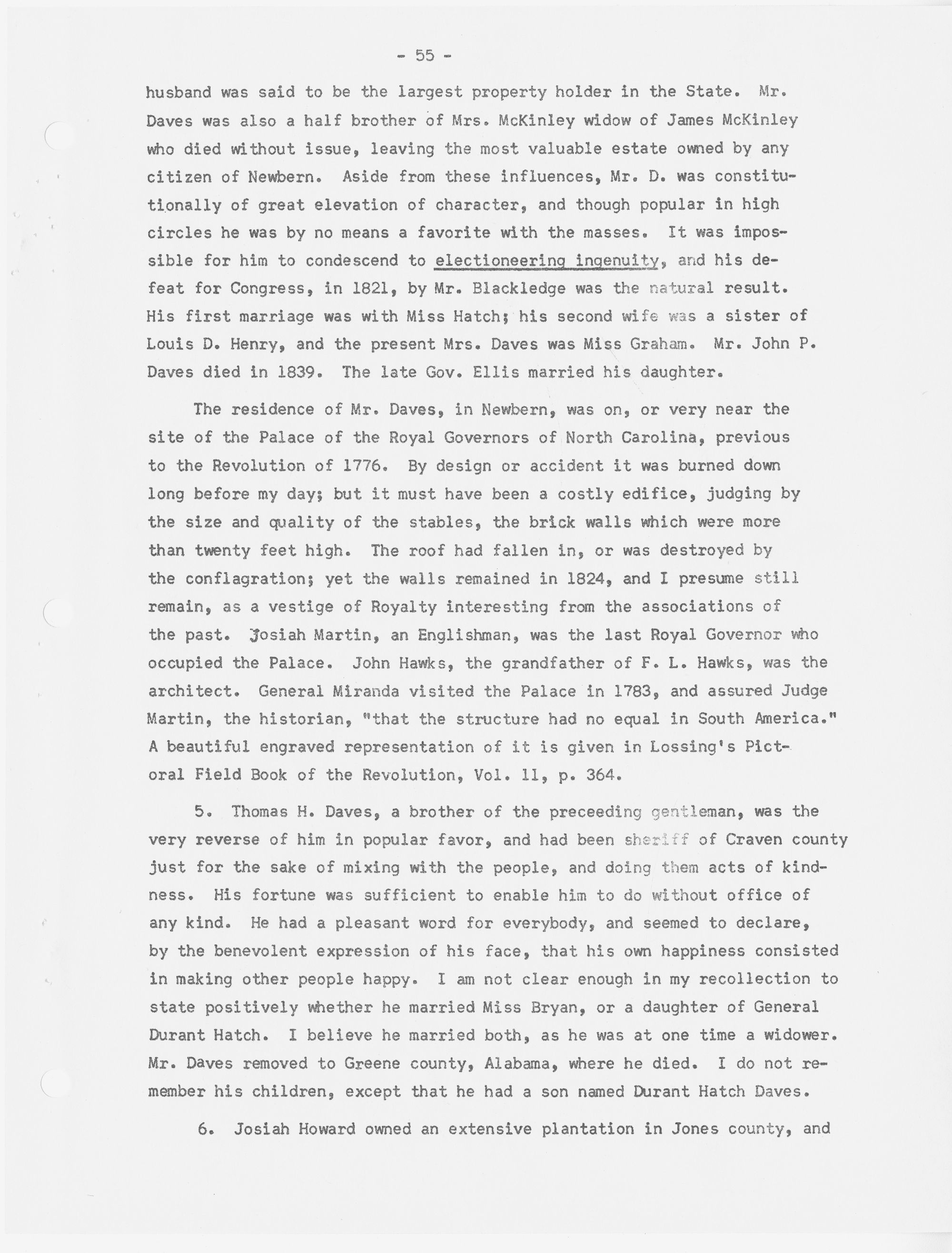 5. Thomas H. Davos, a brother of the proceeding gentleman, was the very reverse of him in popular favor, and had been sheriff of Craven county just for the sake of mixing with the people, and doing them acts of kindness. His fortune was sufficient to enable his to do without office of any kind. He had a pleasant word for everybody, and seemed to declare, by the benevolent expression of his face, that his own happiness consisted in making other people happy. I am not clear enough in my recollection to state positively whether he married Miss Bryan, or a daughter of General Durant Hatch. I believe he married both, as he was at one time a widower. Mr. Dawes removed to Greene county, Alabama, where he died. I As not re-member his children, except that he had a sot named Durant Hatch Davos.