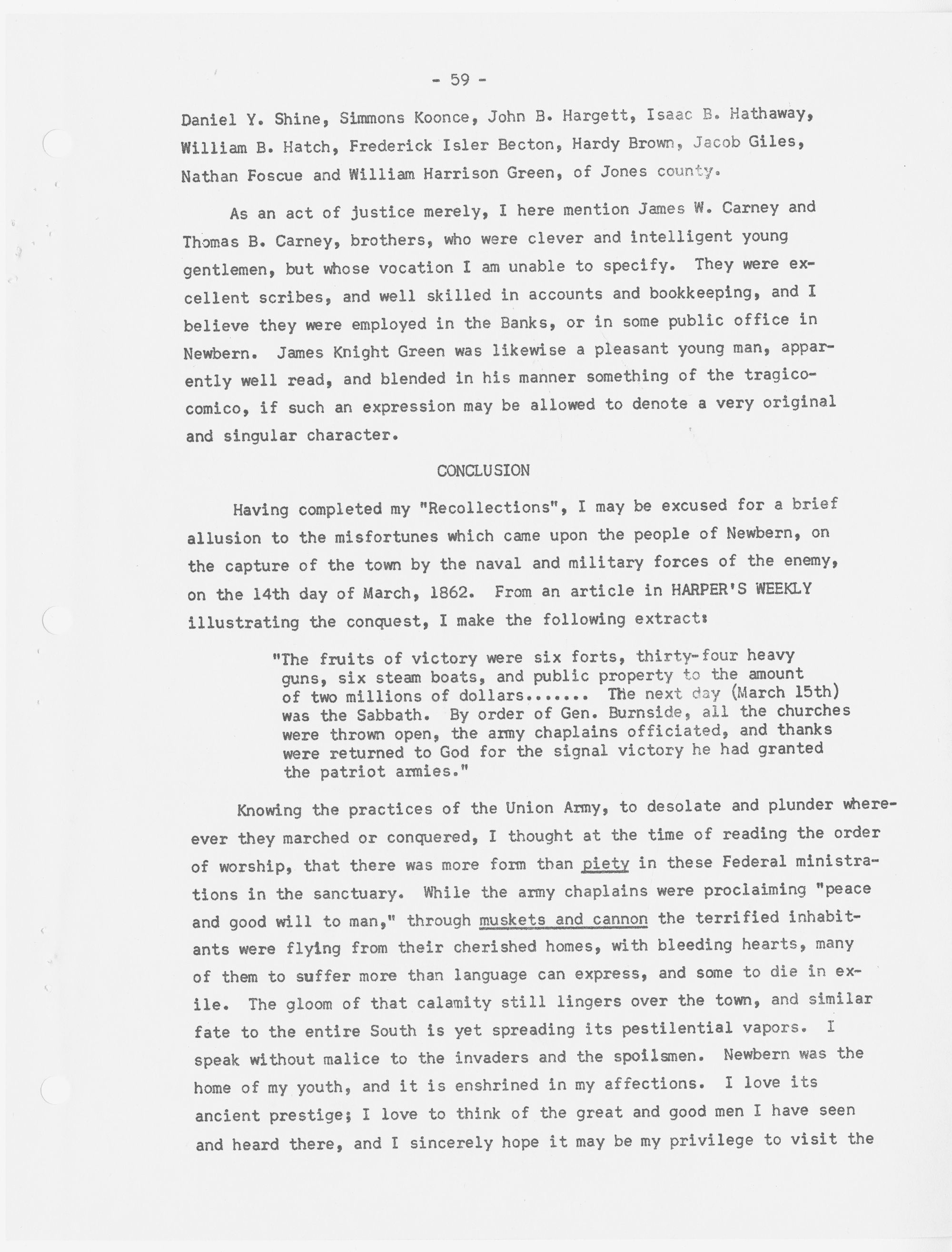 Having completed my "Recollections", I may be excused for a brief allusion to the misfortunes which came upon the people of Newborn, on the capture of the town by the naval and military forces of the enemy, on the 14th day of March, 1862. From an article in HARPER'S WEEKLY illustrating the conquest, I make the following extract: