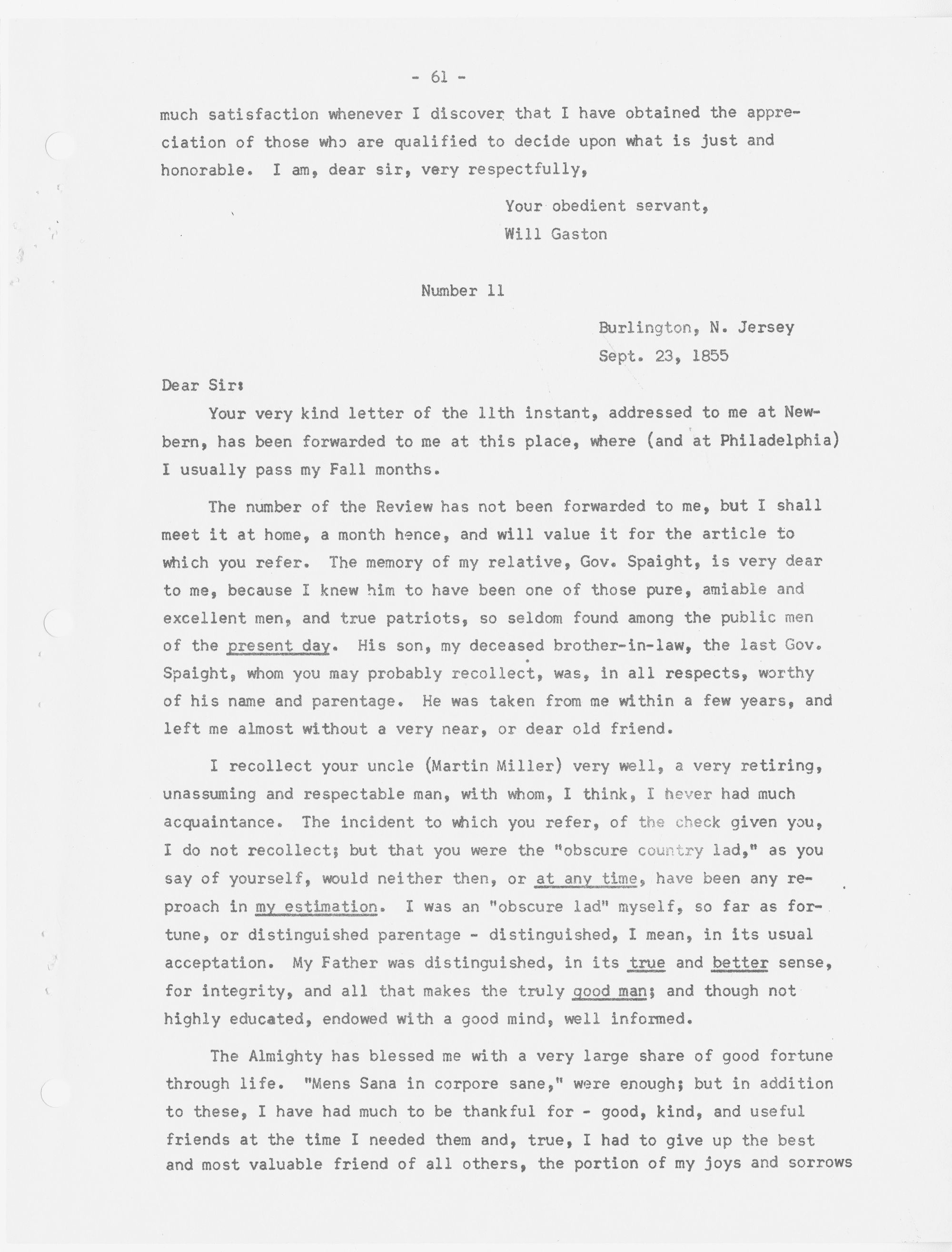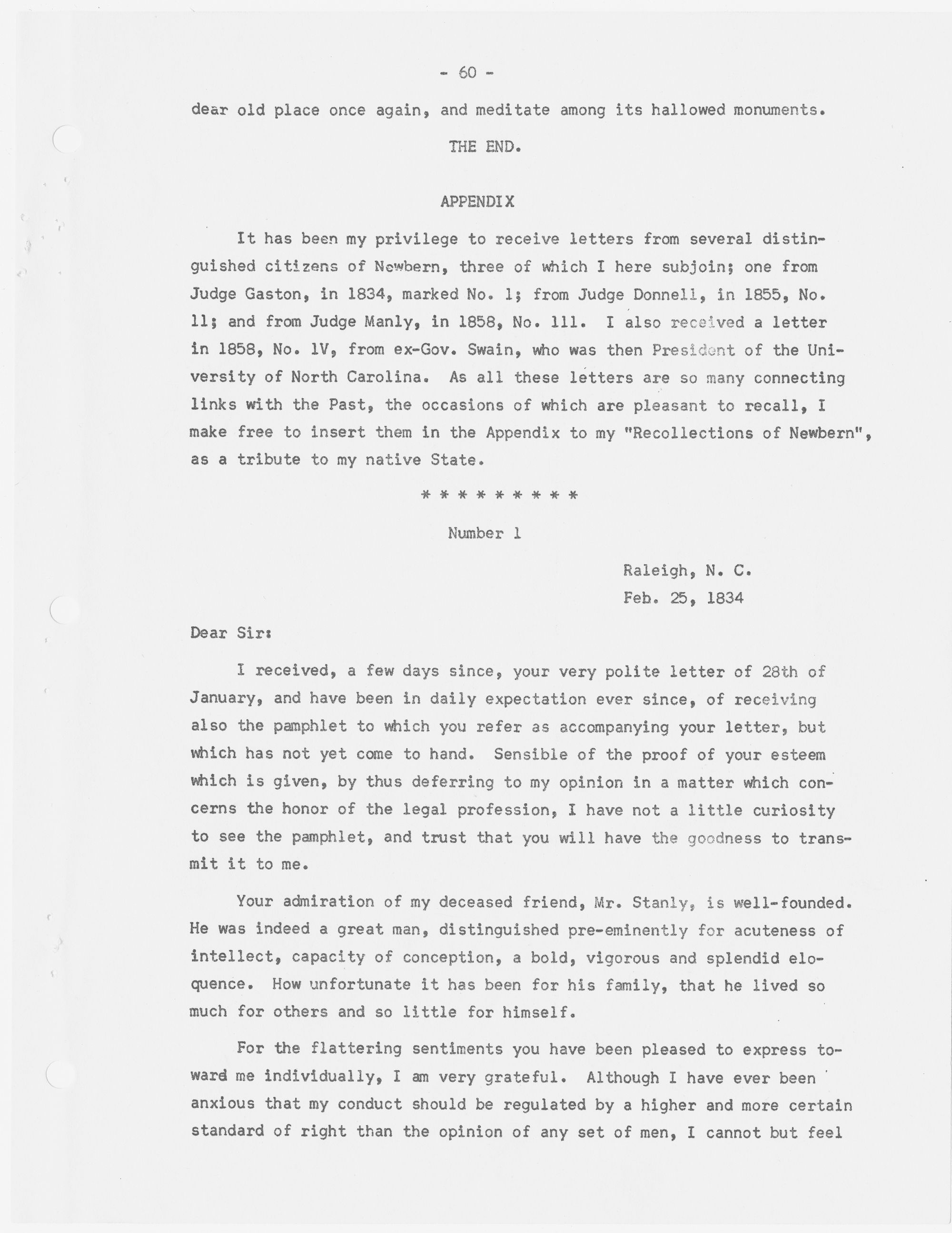 It has been my privilege to receive letters from several distin- guished citizens of Newbern, three of which I here subjoin: one from Judge Gaston, in 1834, marked No. 1; from Judge Donnell, in 1855, No. II; and from Judge Manly, in 1858, No. 111. I also received a letter in 1858, No. 11, from ex-Gov. Swain, who was then President of the University of North Carolina. As all these letters are so many connecting links with the Past, the occasions of which are pleasant to recall, I make free to insert that in the Appendix to my "Recollections of Newbern", as a tribute to my native State.