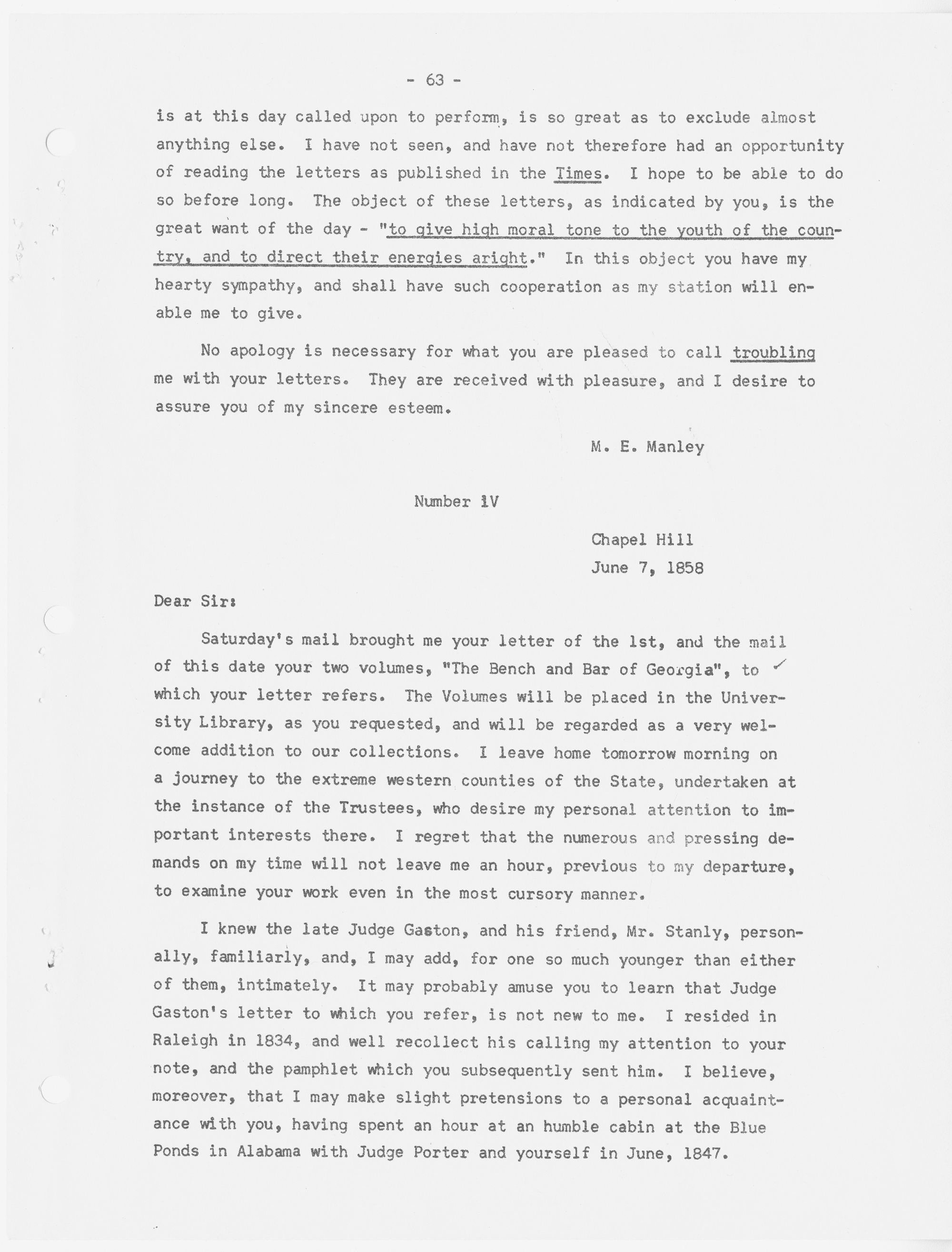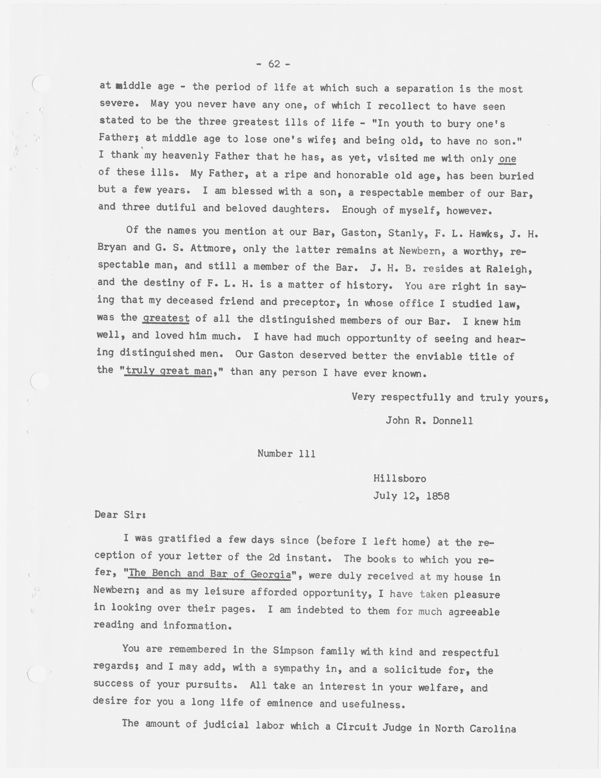 I was gratified a few days since (before I left home) at the reception of your letter of the 2d instant. The books to which you refer, "The Bench and Bar of Georgia", were duly received at my house in Newbern; and as my leisure afforded opportunity, I have taken pleasure in looking over their pages. I am indebted to them for much agreeable reading and information.