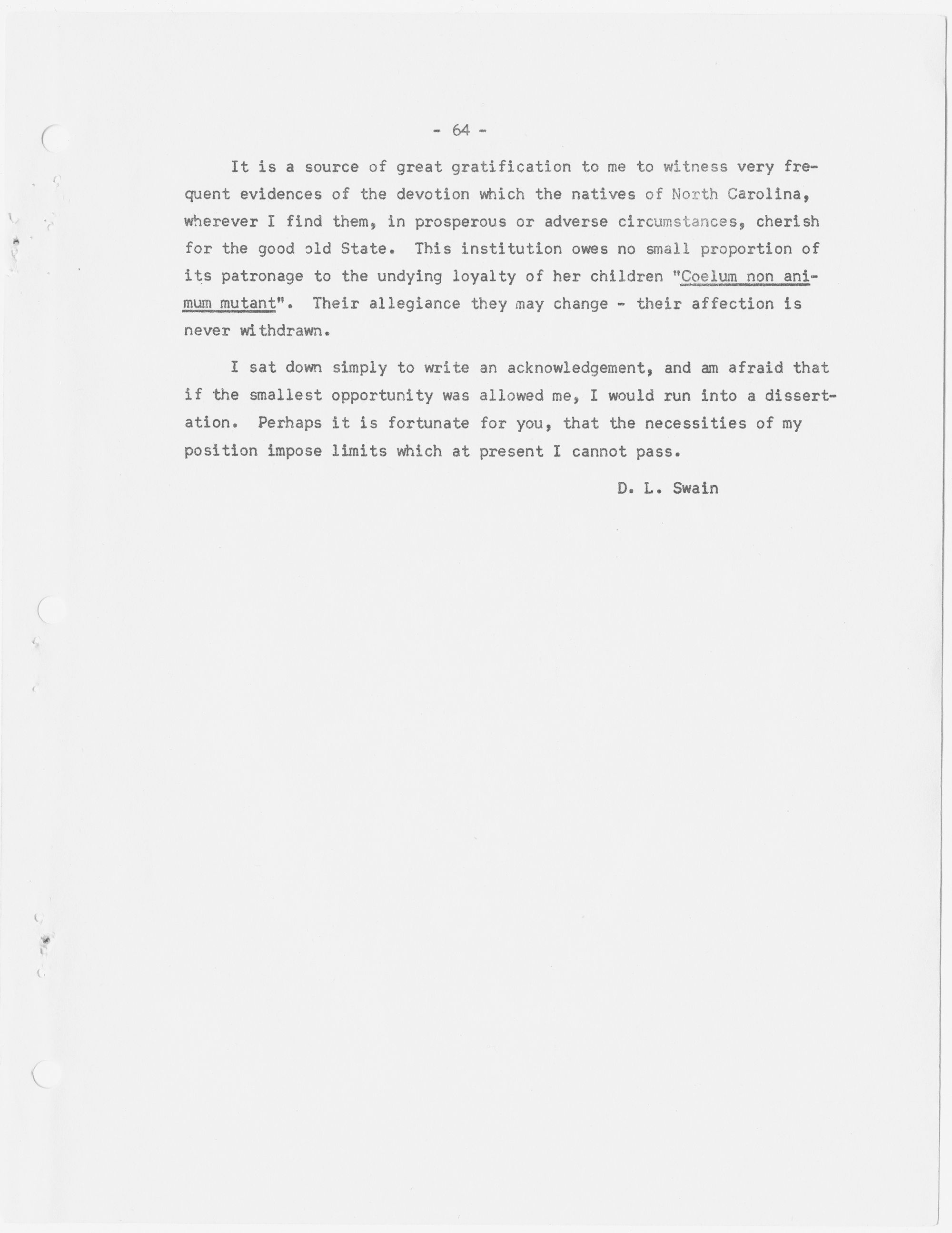It is a source of great gratification to me to witness very frequent evidences of the devotion which the natives of North Carolina, wherever I find them, in prosperous or adverse circumstances, cherish for the good old State. This institution owes no small proportion of its patronage to the undying loyalty of her children "Coelum non ant-mum mutant". Their allegiance they may change - their affection is never withdrawn.