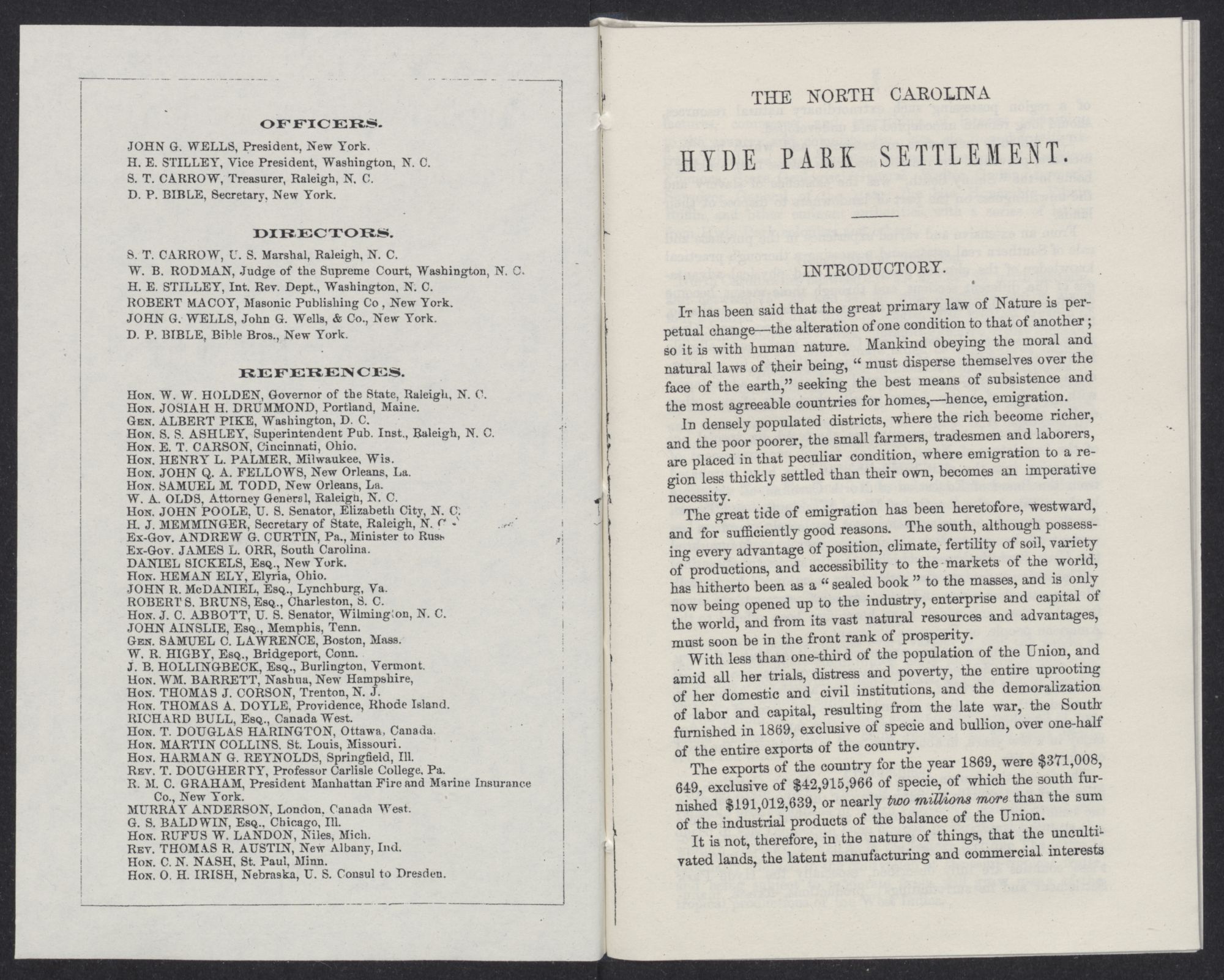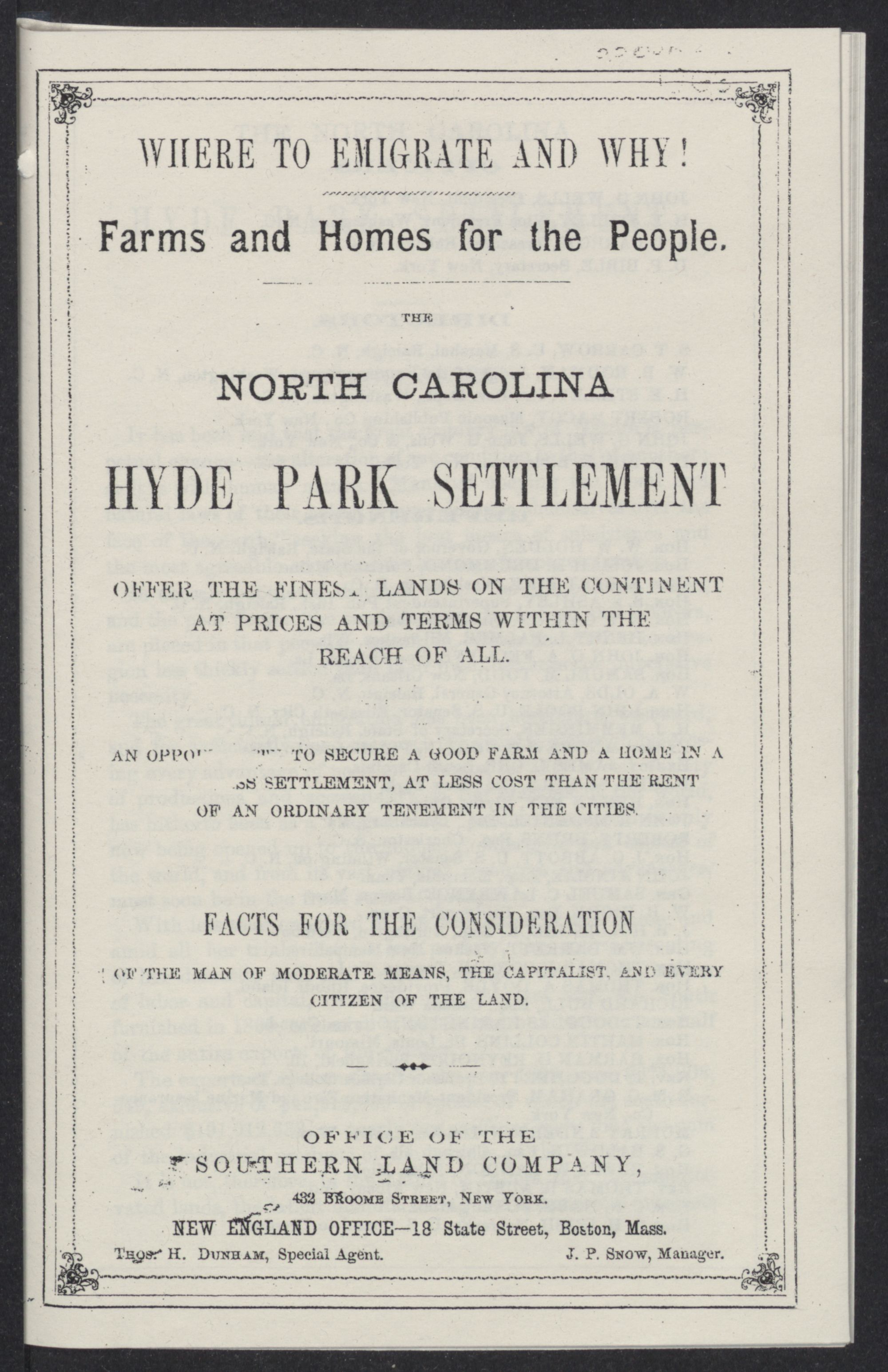 WHERE TO EMIGRATE AND WHY! Farms and Homes for the People.THENORTH CAROLINAHYDE PARK SETTLEMENT OFFER THE FINES, LANDS ON THE CONTINENTAT PRICES AND TERMS WITHIN THEREACH OF ALL. AN OPPORTUNITY TO SECURE A GOOD FARM AND A HOME IN A [illegible text] SETTLEMENT, AT LESS COST THAN THE RENTOF AN ORDINARY TENEMENT IN THE CITIES. FACTS FOR THE CONSIDERATIONOF THE MAN OF MODERATE MEANS, THE CAPITALIST AND EVERYCITIZEN OF THE LAND. OFFICE OF THESOUTHERN LAND COMPANY,432 Broome Street, New York. NEW ENGLAND OFFICE—18 State Street, Boston, Mass.Thos. H. Dunilam, Special Agent. J. P. Snow, Manager.
