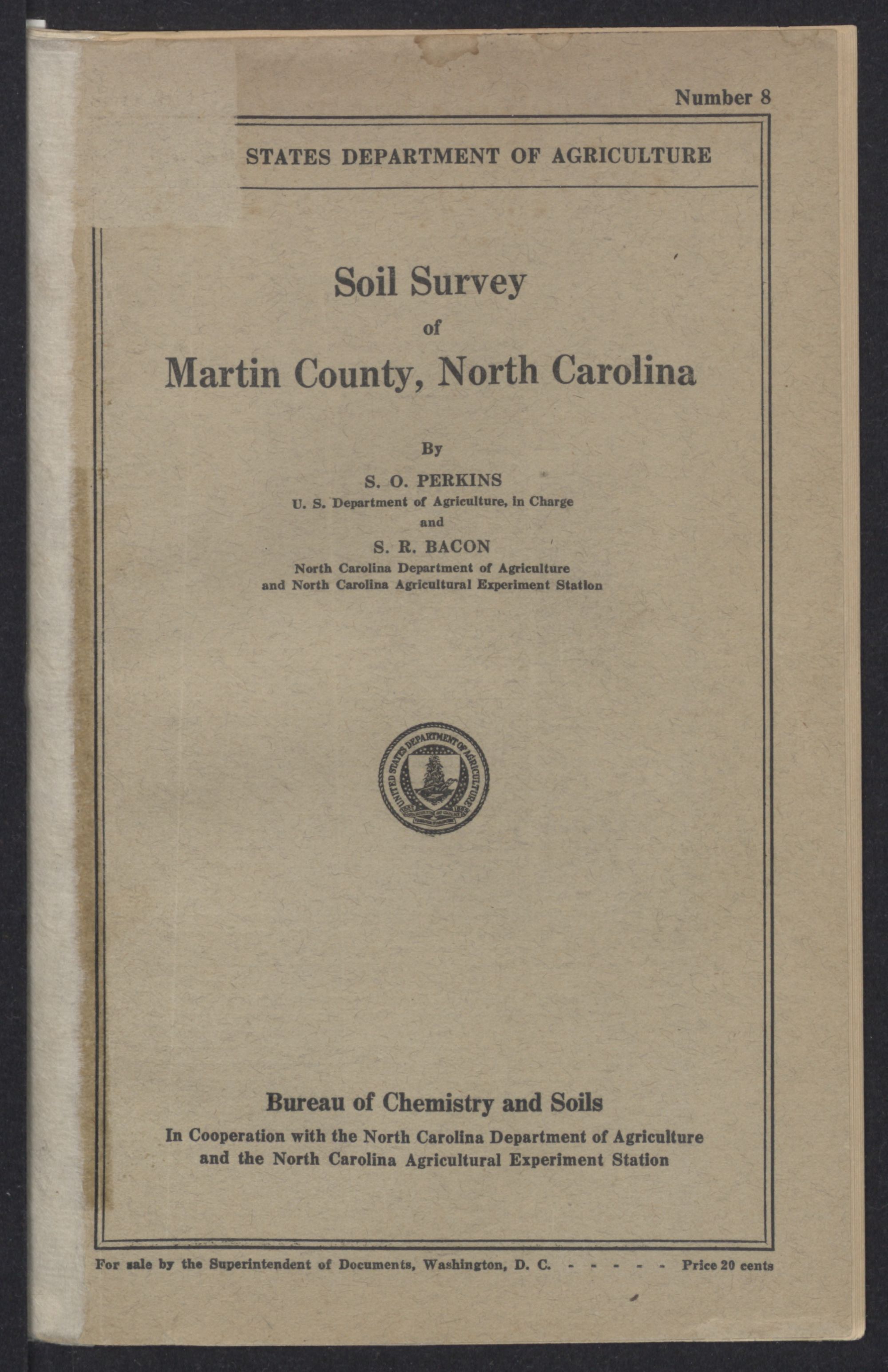 Soil survey of Martin county, North Carolina. By S. O. Perkins and S. R. Bacon. Washington : [U. S. Govt. print. off., 1931] 32 p. 2 maps (1 fold.) 24 cm. (U. S. Dept. of agriculture. Bureau of chemistry and soils. [Soil survey report] Series 1928, no. 8) Cover title. In cooperation with the North Carolina Department of agriculture and the North Carolina Agricultural experiment station.