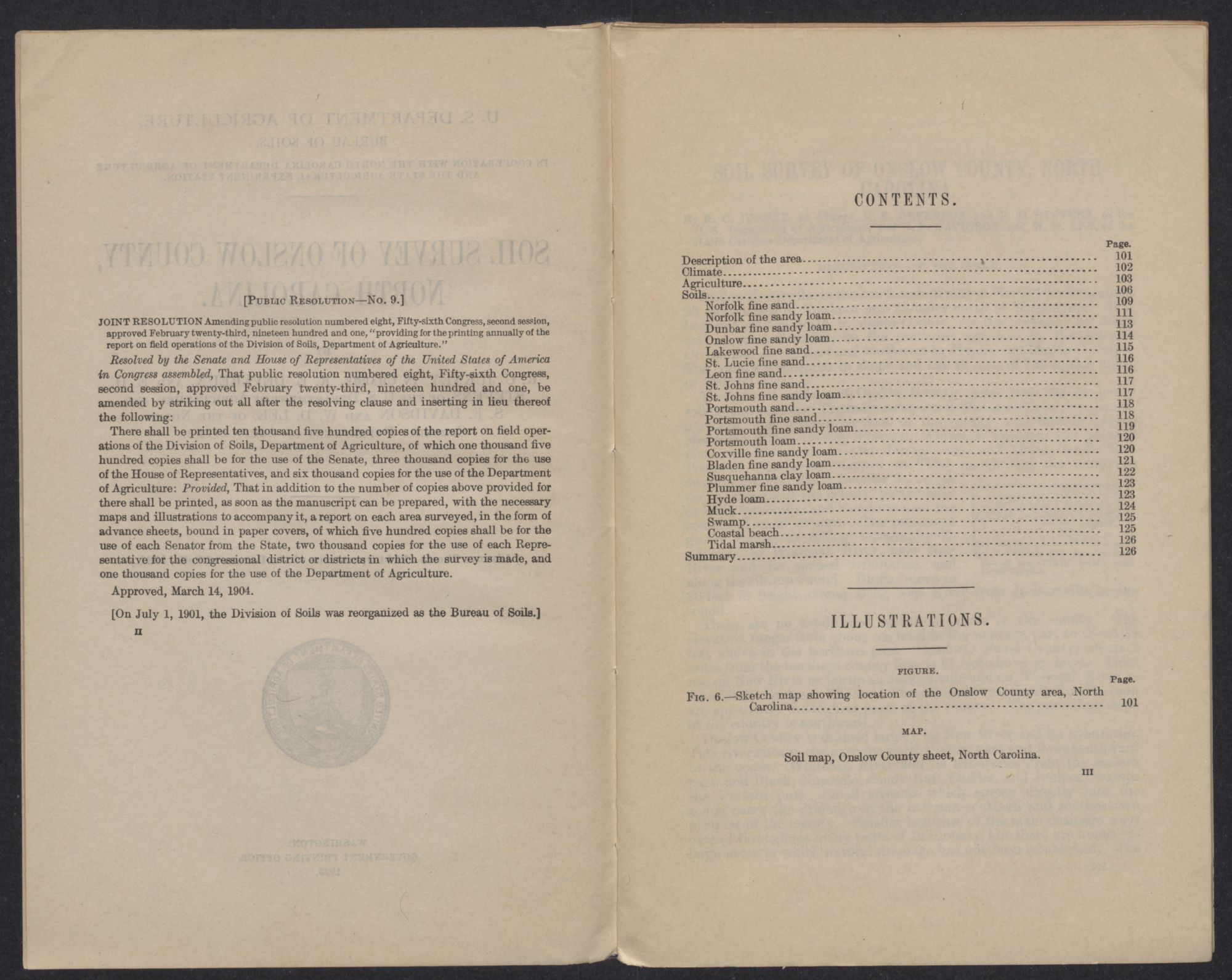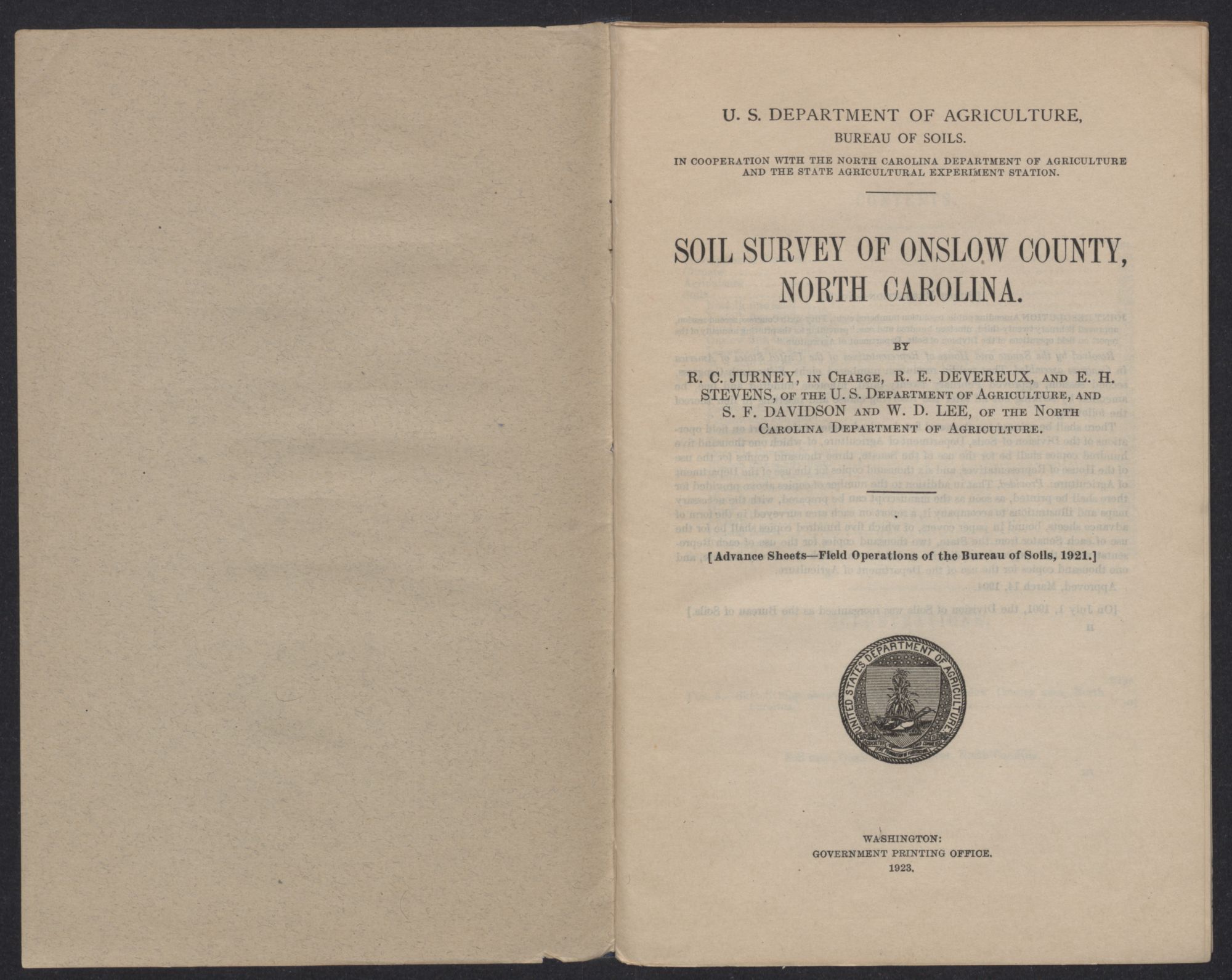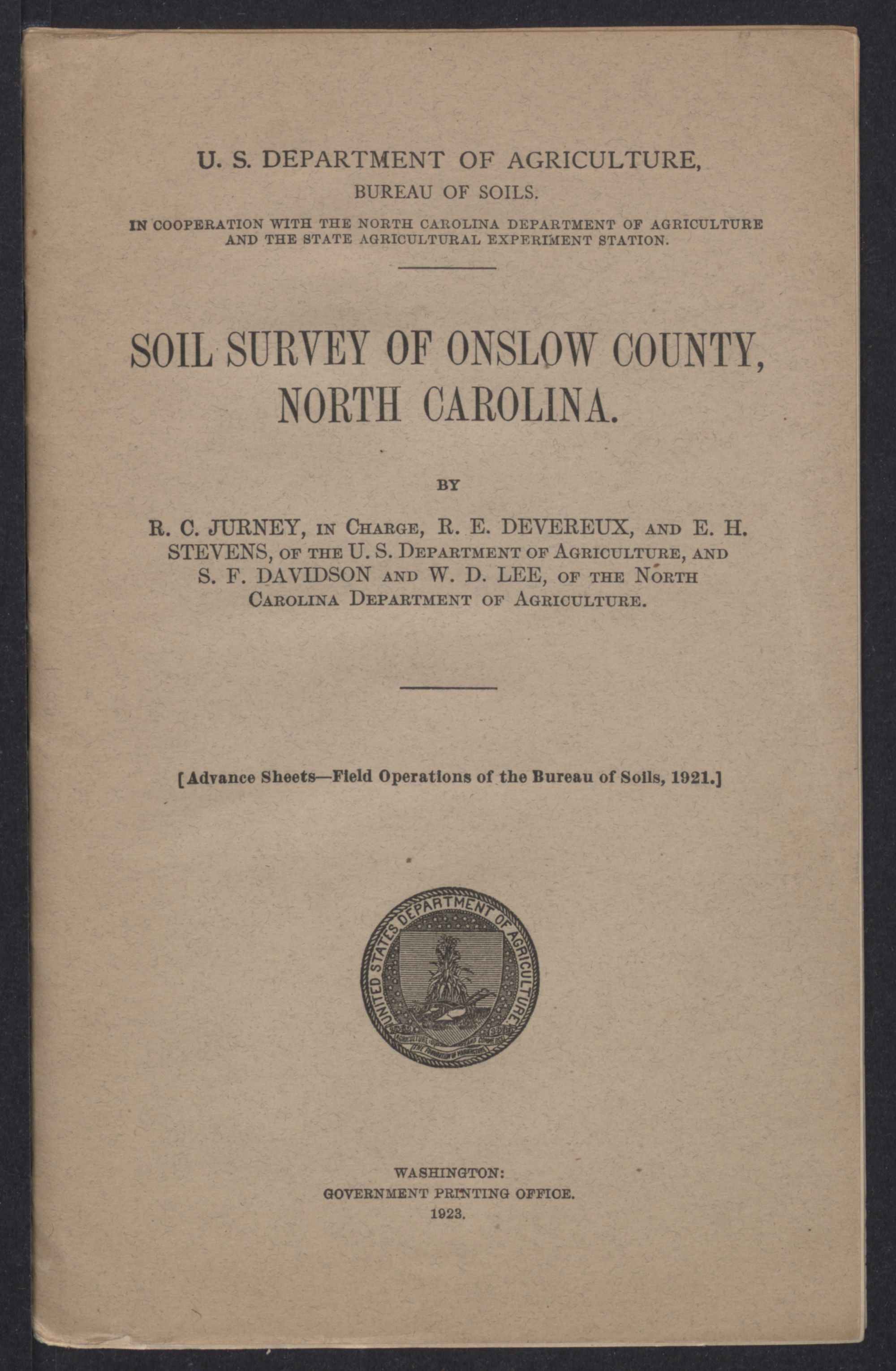 U. S. DEPARTMENT OF AGRICULTURE, BUREAU OF SOILS. IN COOPERATION WITH THE NORTH CAROLINA DEPARTMENT OF AGRICULTUREAND THE STATE AGRICULTURAL EXPERIMENT STATION. SOIL SURVEY OF ONSLOW COUNTY,NORTH CAROLINA.BYR. C. JURNEY, in Charge, R. E. DEVEREUX, andE. H. STEVENS, of the U. S. Department of Agriculture, andS. F. DAVIDSONandW. D. LEEof the North Carolina Department of Agriculture. [Advance Sheets—Field Operations of the Bureau of Soils, 1921.]United States Department of Agriculture 1862 Agriculture is the Foundation of Manufacture and Commerce 1889