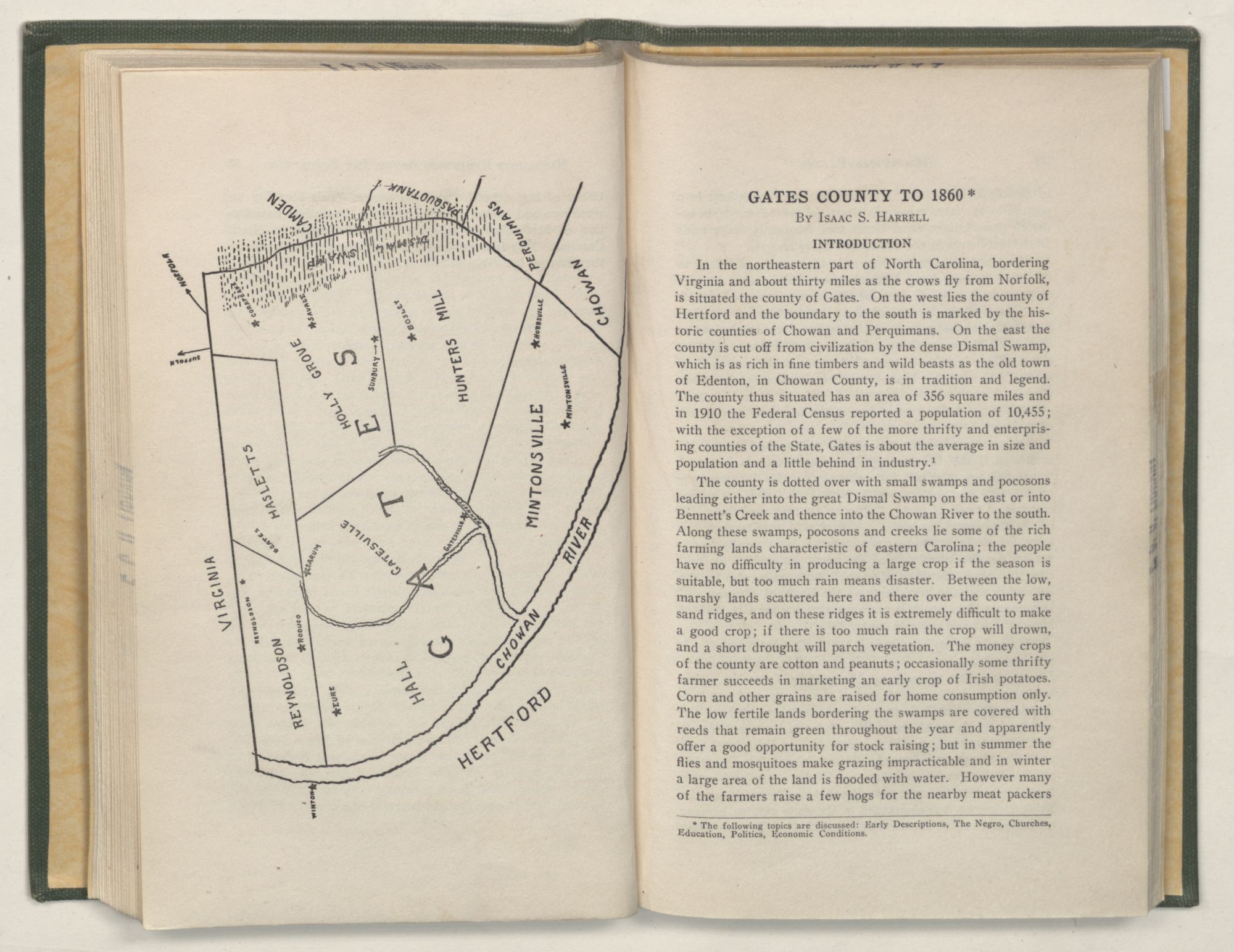 INTRODUCTIONIn the northeastern part of North Carolina, bordering Virginia and about thirty miles as the crows fly from Norfolk, is situated the county of Gates. On the west lies the county of Hertford and the boundary to the south is marked by the historic counties of Chowan and Perquimans. On the east the county is cut off from civilization by the dense Dismal Swamp, which is as rich in fine timbers and wild beasts as the old town of Edenton, in Chowan County, is in tradition and legend. The county thus situated has an area of 356 square miles and in 1910 the Federal Census reported a population of 10,455; with the exception of a few of the more thrifty and enterprising counties of the State, Gates is about the average in size and population and a little behind in industry.1