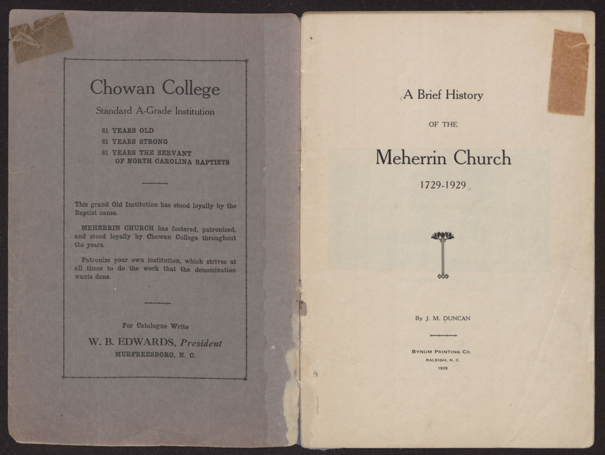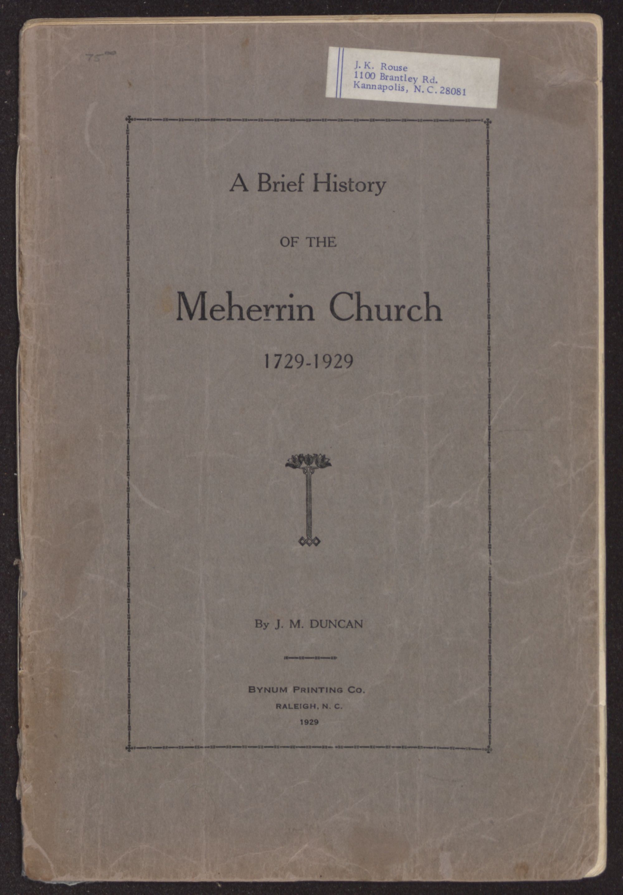 A Brief History OF THE Meherrin Church 1729-1929decorationBy J. M. DUNCANBYNUM PRINTING CO.RALEIGH, N. C.1929