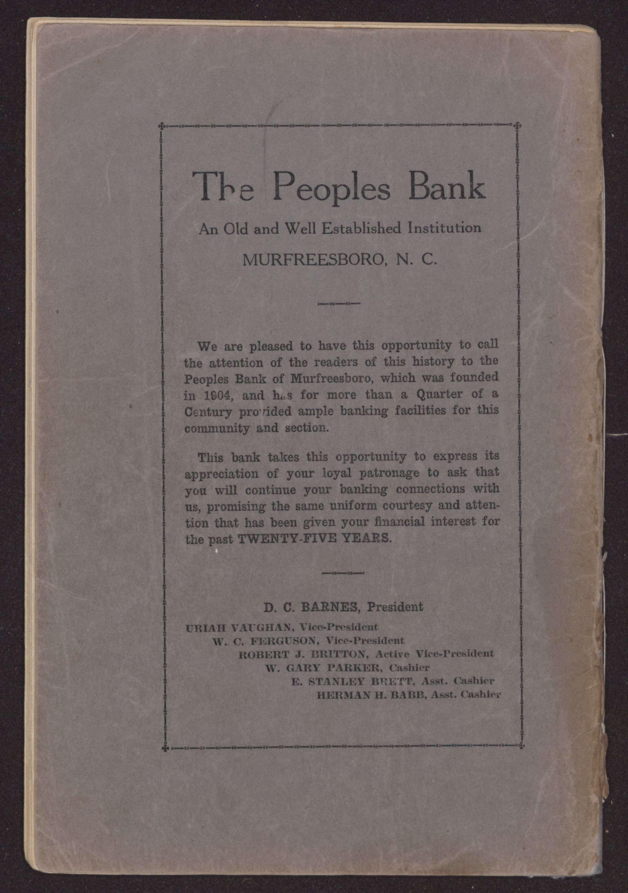 We are pleased to have this opportunity to call the attention of the readers of this history to the Peoples Bank of Murfreesboro, which was founded in 1904, and has for more than a Quarter of a Century provided ample banking facilities for this community and section.