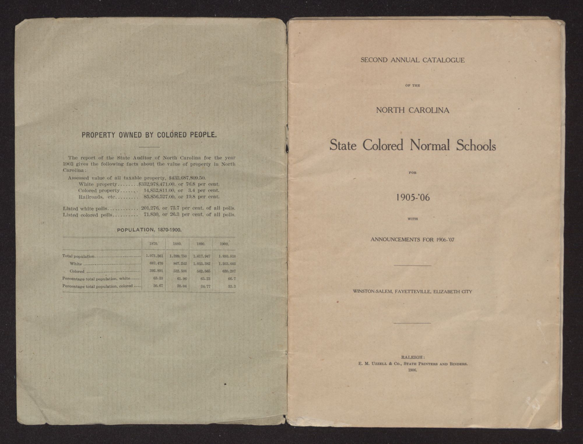 SECOND ANNUAL CATALOGUE OF THE NORTH CAROLINA State Colored Normal Schools FOR 1905-'06 WITH ANNOUNCEMENTS FOR 1906-'07 WINSTON-SALEM, FAYETTEVILLE, ELIZABETH CITY "THE PEOPLE HAVE A RIGHT TO THE PRIVILEGE OF EDUCATION, AND IT IS THE DUTY OF THE STATE TO GUARD AND MAINTAIN THAT RIGHT."-- Constitution of North Carolina.
